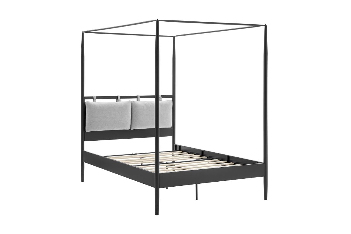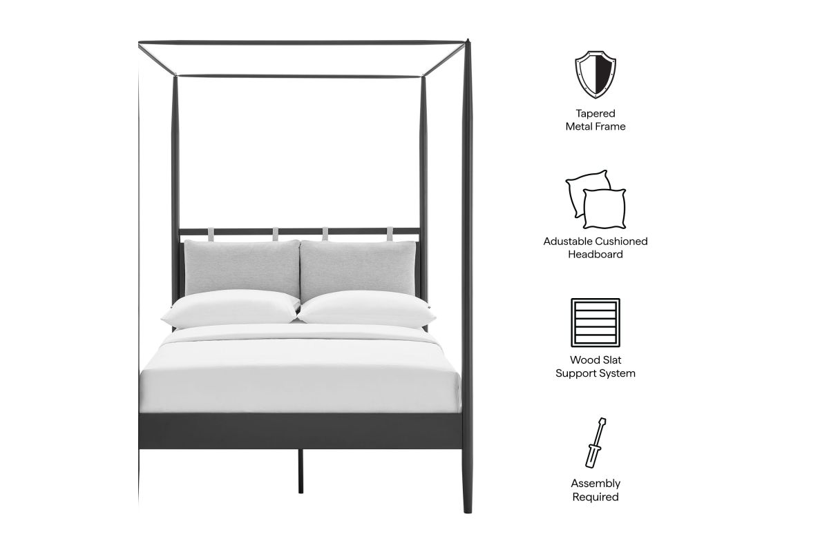 Sculptural and serene, the Marlowe Full Canopy Bed brings architectural elegance to the modern bedroom. A contemporary interpretation of a classic four-poster frame, this full-size platform bed is crafted from durable iron metal with gently tapered posts that create an airy yet grounded silhouette. The minimalist frame is softened by an integrated cushioned headboard—two plush, upholstered pillows attached with fabric straps. These headrests can be adjusted up or down for personalized comfort or removed entirely for a streamlined look. Designed to support a variety of mattress types, this canopy bed with integrated headboard includes a poplar wood mattress foundation that promotes airflow and eliminates the need for a box spring. With its blend of comfort, structure, and versatility, this canopy bed redefines your sleep space with understated drama. Assembly required. Weight Capacity: 400 lbs.