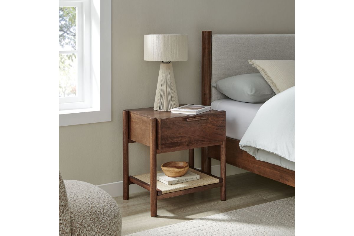 A blend of warm texture and modern form, the Oswin Nightstand brings effortless style and function to the bedside. Crafted from solid mango wood, this wood nightstand with drawer and open shelf showcases clean mid-century lines, softened by its cylindrical post legs and a woven jute shelf for open storage. A single full-extension drawer glides smoothly, offering space for bedside essentials, while the rich wood grain adds natural character to any room. Whether styled in a modern bedroom, guest room, or cozy nook, Oswin is both mid-century and timeless. Includes non-marking nylon floor glides to protect flooring. Assembly required.
