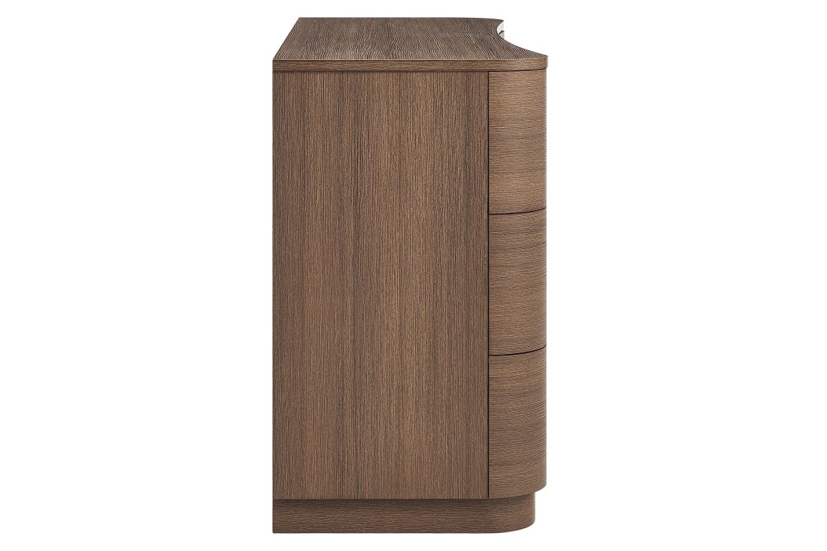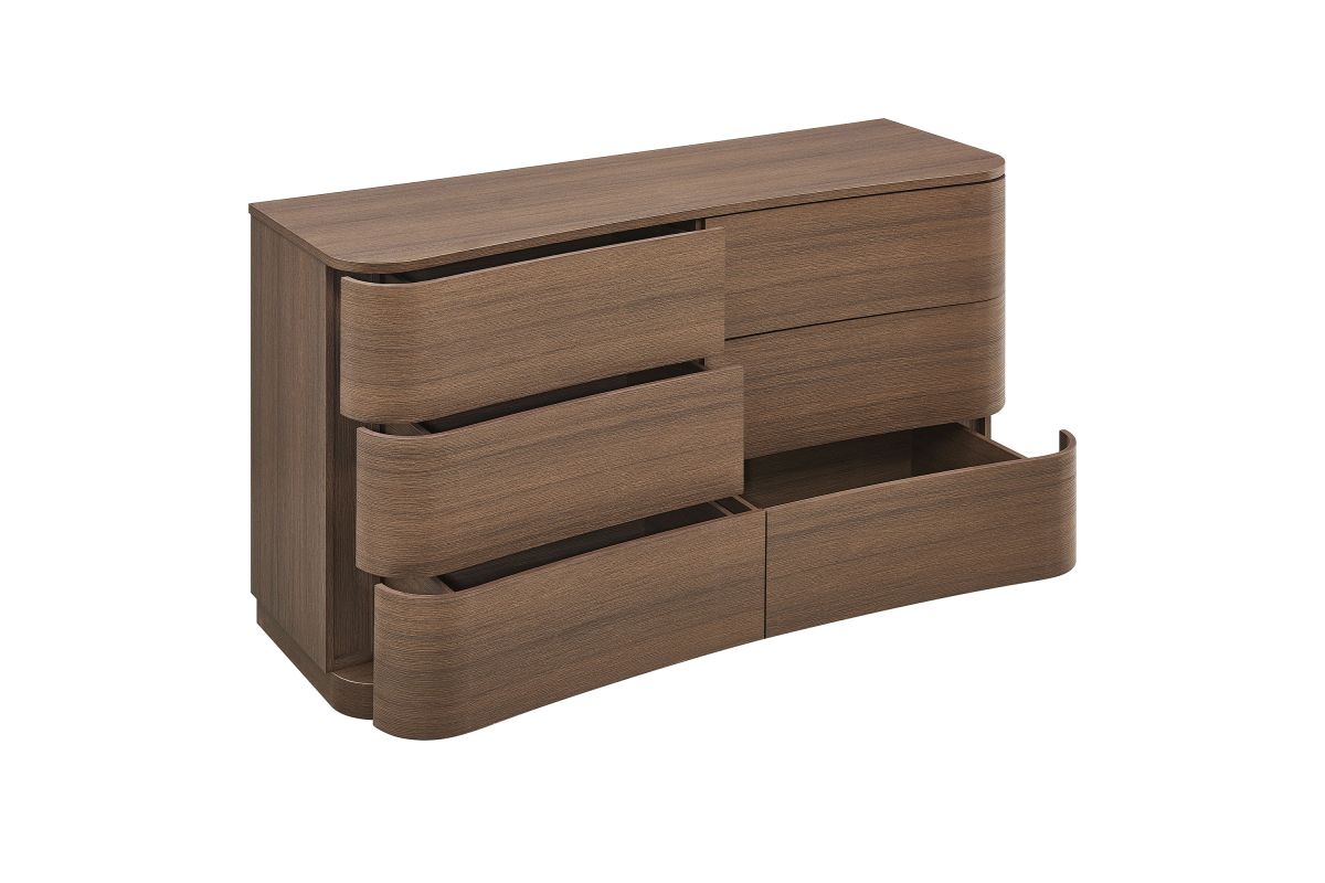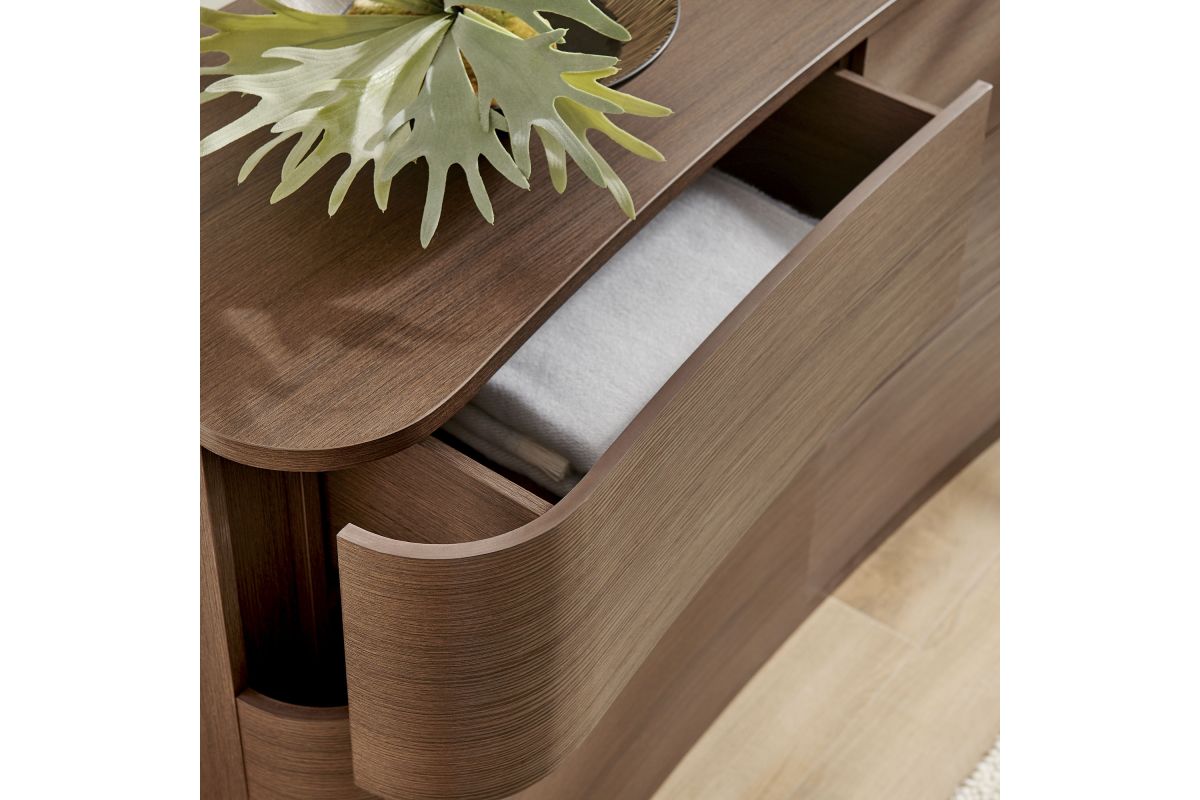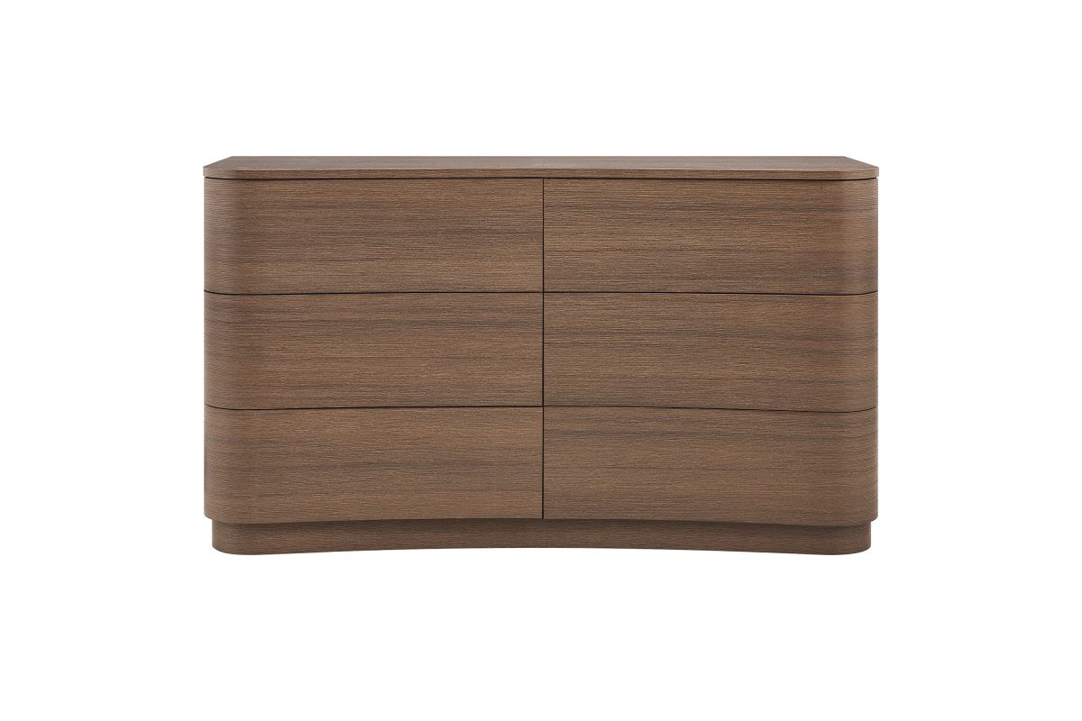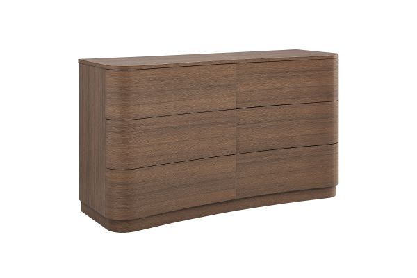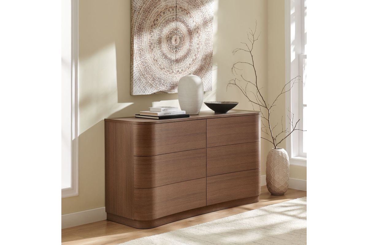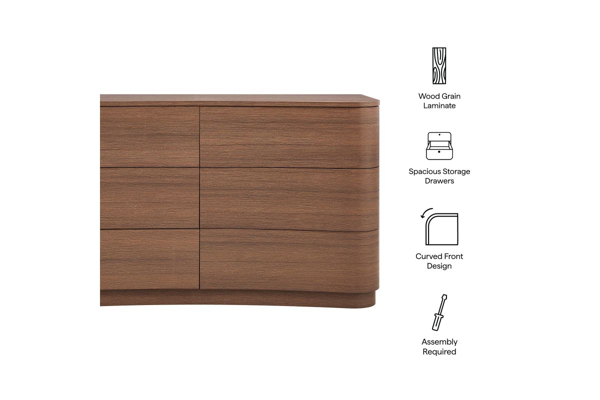 Sculptural lines and generous storage make the Mirae 6-Drawer Dresser a standout piece for the modern bedroom. Designed with a wide frame and gracefully curved drawer fronts, this horizontal dresser brings soft edges and visual flow to any space. Smooth wood grain laminate highlights the natural form, while six spacious deep drawers offer plenty of room for clothing, linens, or everyday essentials. Whether styled as a statement dresser in the bedroom, a storage cabinet in the entryway, or even a TV stand dresser for wall mounted TVs in the living or guest room, Mirae blends beauty and functionality in a streamlined profile. Assembly required.