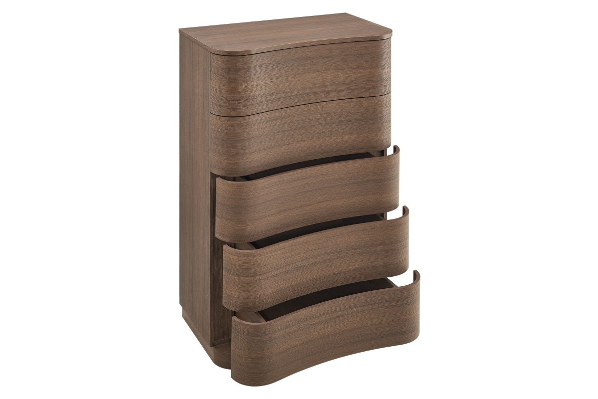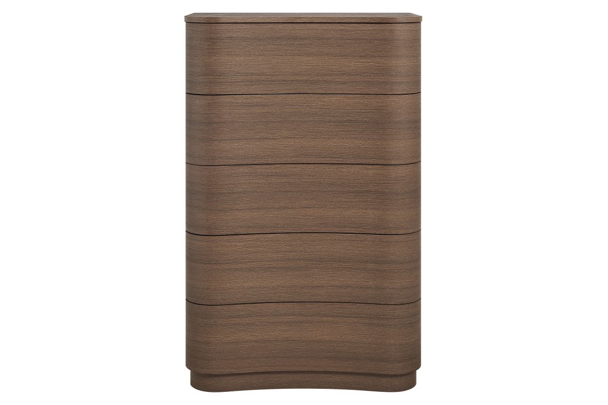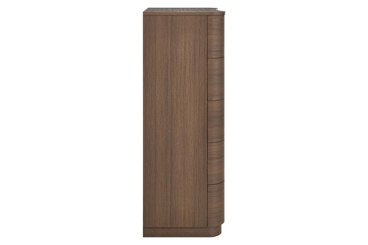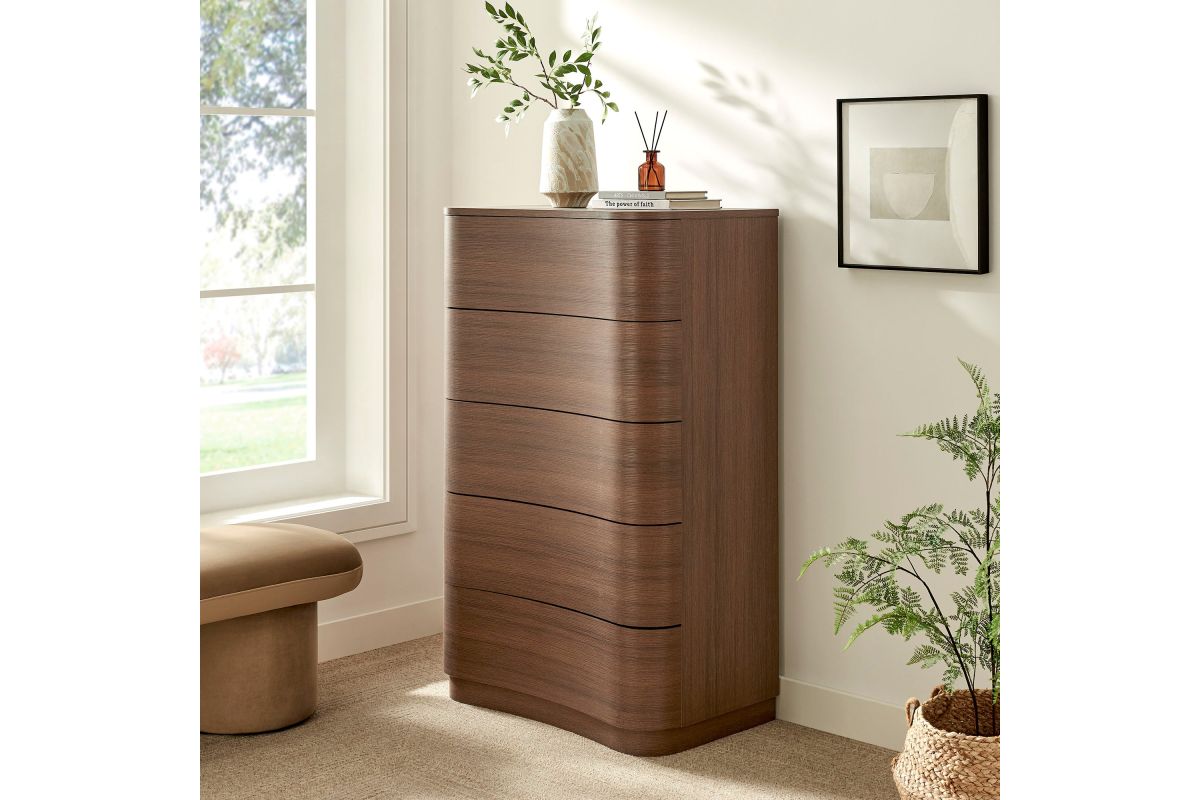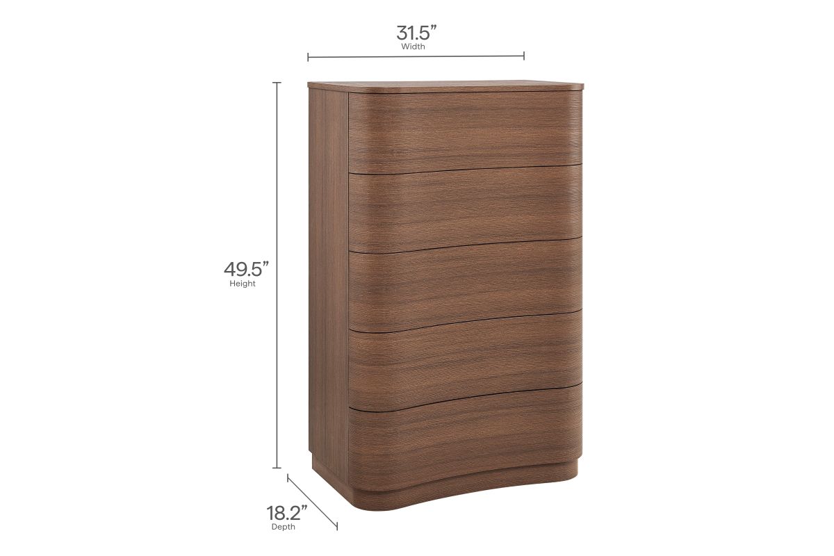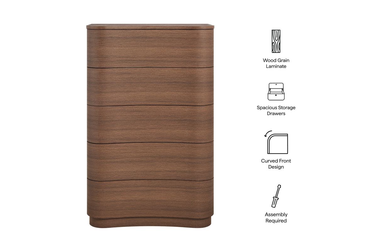 Sculptural lines and vertical storage make the Mirae 5-Drawer Dresser Chest a standout piece for the modern bedroom. Designed with a tall frame and gracefully curved drawer fronts, this upright vertical dresser brings soft edges and visual flow to any space. Smooth wood grain laminate highlights the natural form, while five spacious deep drawers offer plenty of room for clothing, linens, or everyday essentials. Whether styled as a tall dresser in the bedroom, a closet cabinet, or a vertical accent chest in a hallway or guest room, Mirae blends beauty and functionality in a streamlined profile. Assembly required.