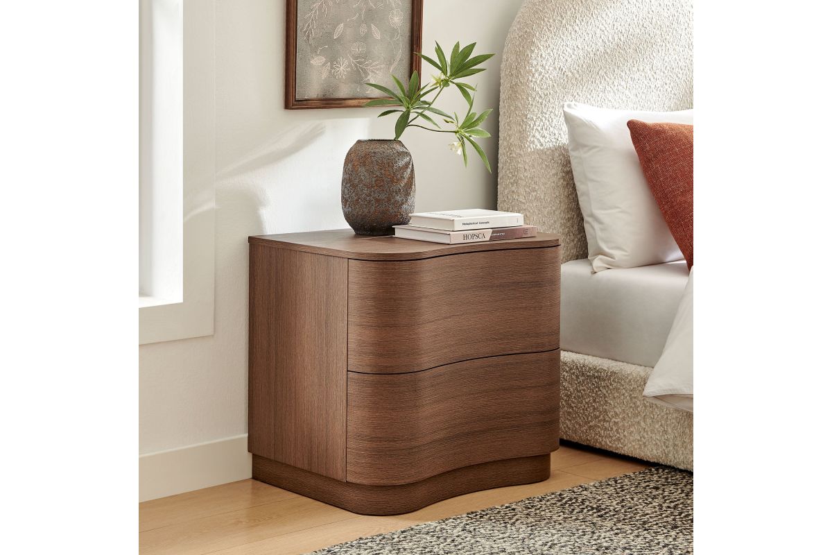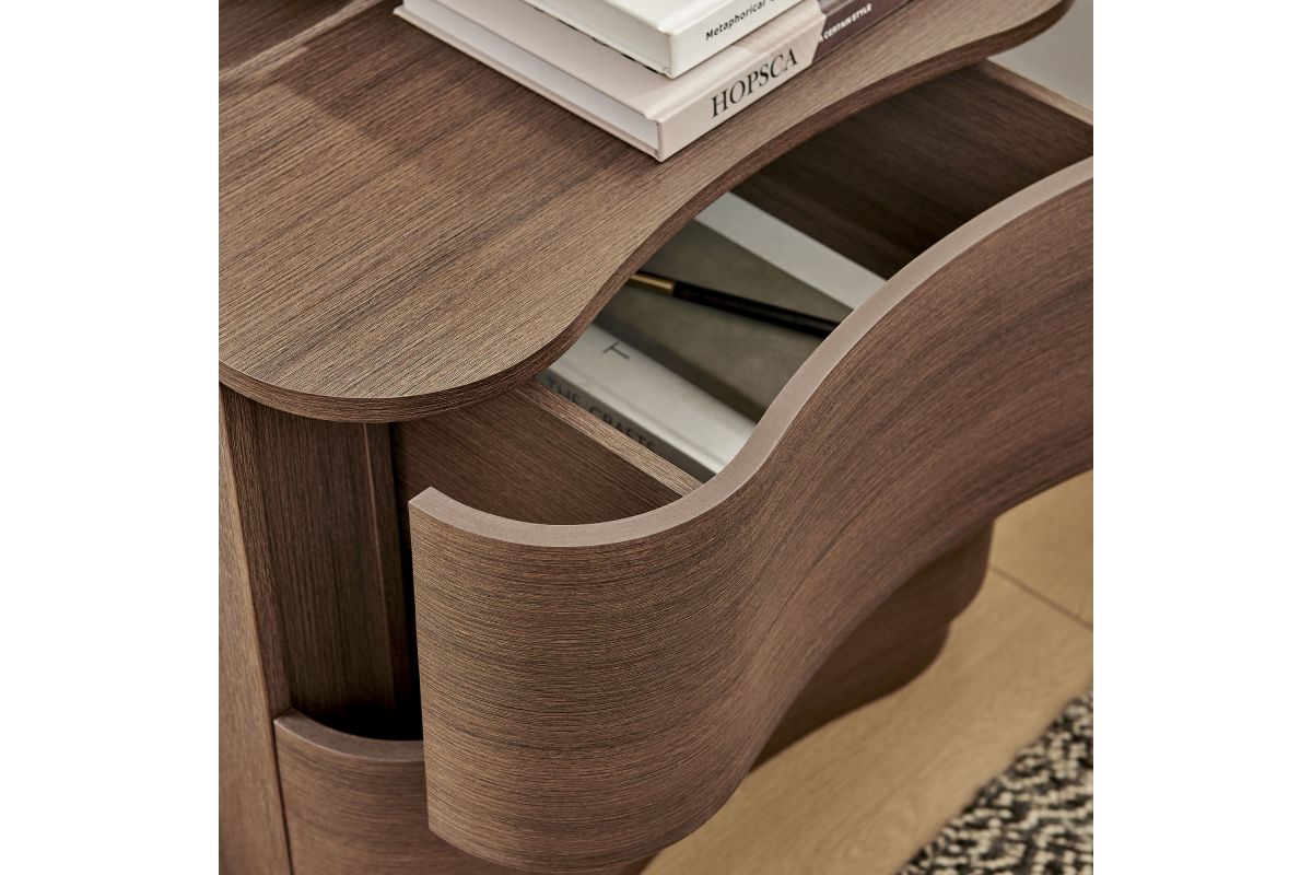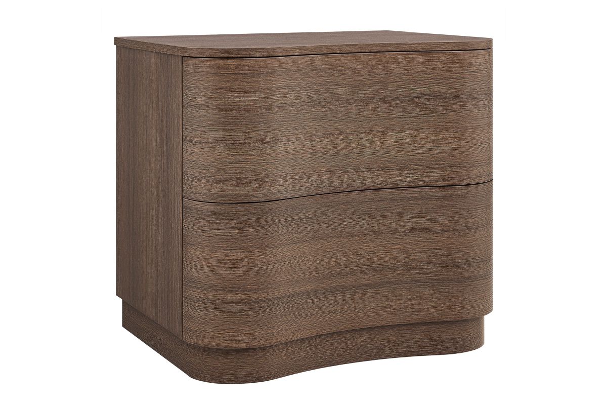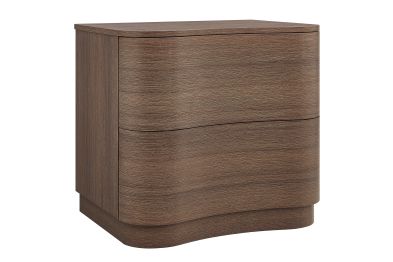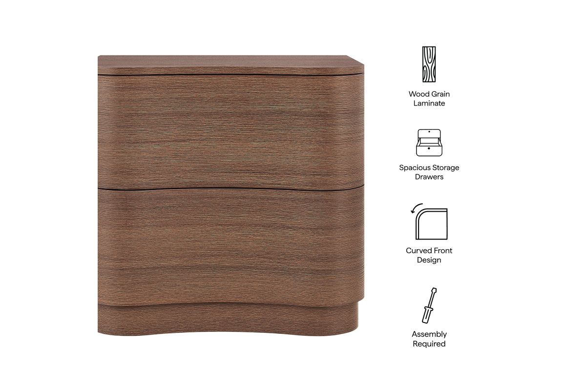 Sculptural lines and compact storage make the Mirae 2-Drawer Nightstand a modern essential for the bedroom or living space. Designed with a clean silhouette and softly curved drawer fronts, this bedside table adds a touch of dimension to any setting. Smooth wood grain laminate highlights the flowing form of this versatile nightstand, while two spacious deep drawers provide storage for books, accessories, or nighttime essentials. Whether styled next to a bed, sofa, or used as a side table, this versatile nightstand with storage blends functional design with artistic appeal. Assembly required.