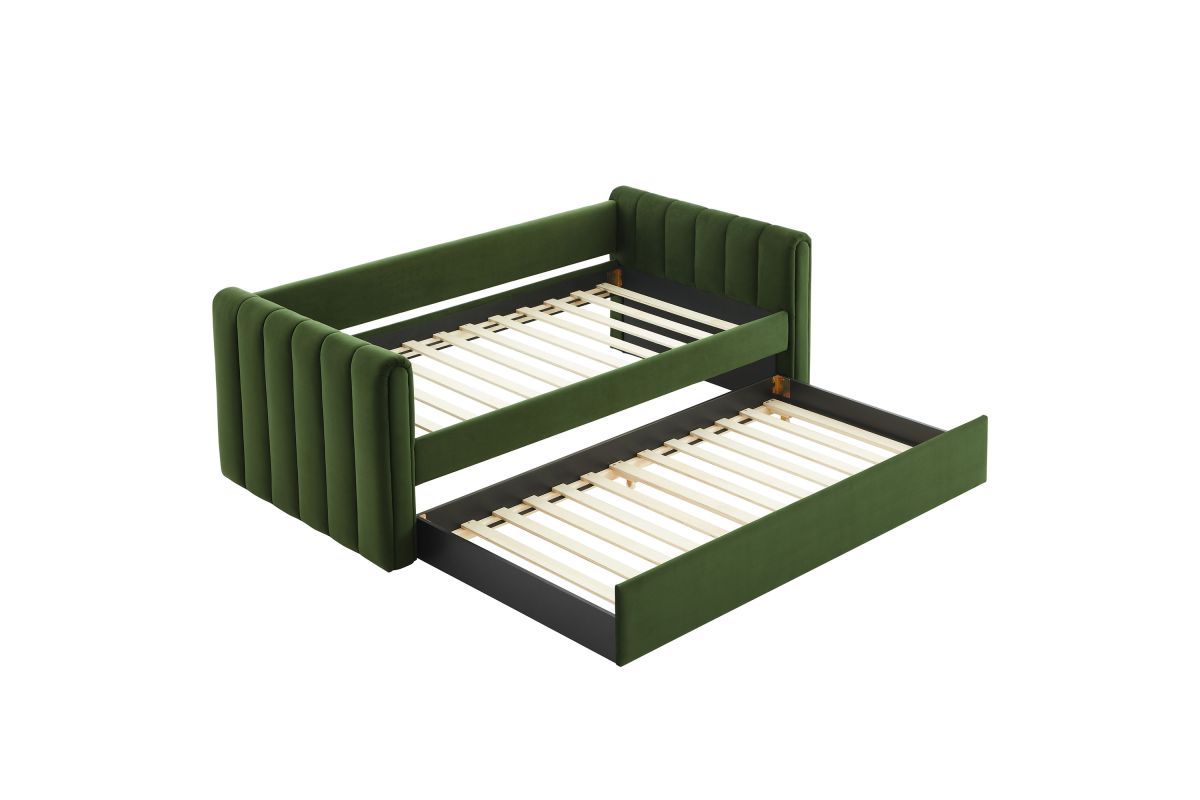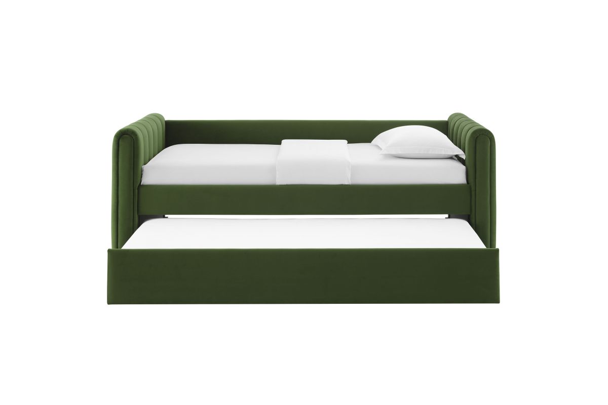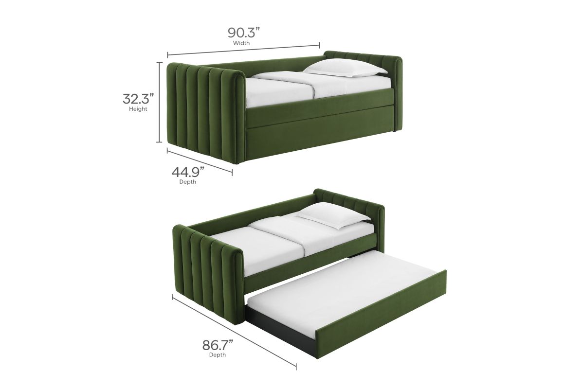 The Veyla Twin Daybed blends sleek form and plush texture with a streamlined silhouette and channel tufted detailing. Upholstered in soft, stain-resistant performance velvet, this twin size daybed with trundle offers a versatile sleeping solution for guest rooms, kids’ bedrooms, or multifunctional living areas. The fully upholstered frame features a low profile, gently padded sides, and tailored vertical channel tufting for a chic look. A hidden pull-out trundle on casters tucks beneath the main bed, creating a seamless twin-over-twin bed layout ideal for overnight guests or everyday lounging. Veyla’s built-in wood slat support system ensures lasting durability without the need for a box spring. Mattress not included. Assembly required. Weight Capacity: 300 lbs.