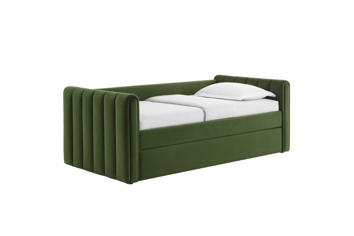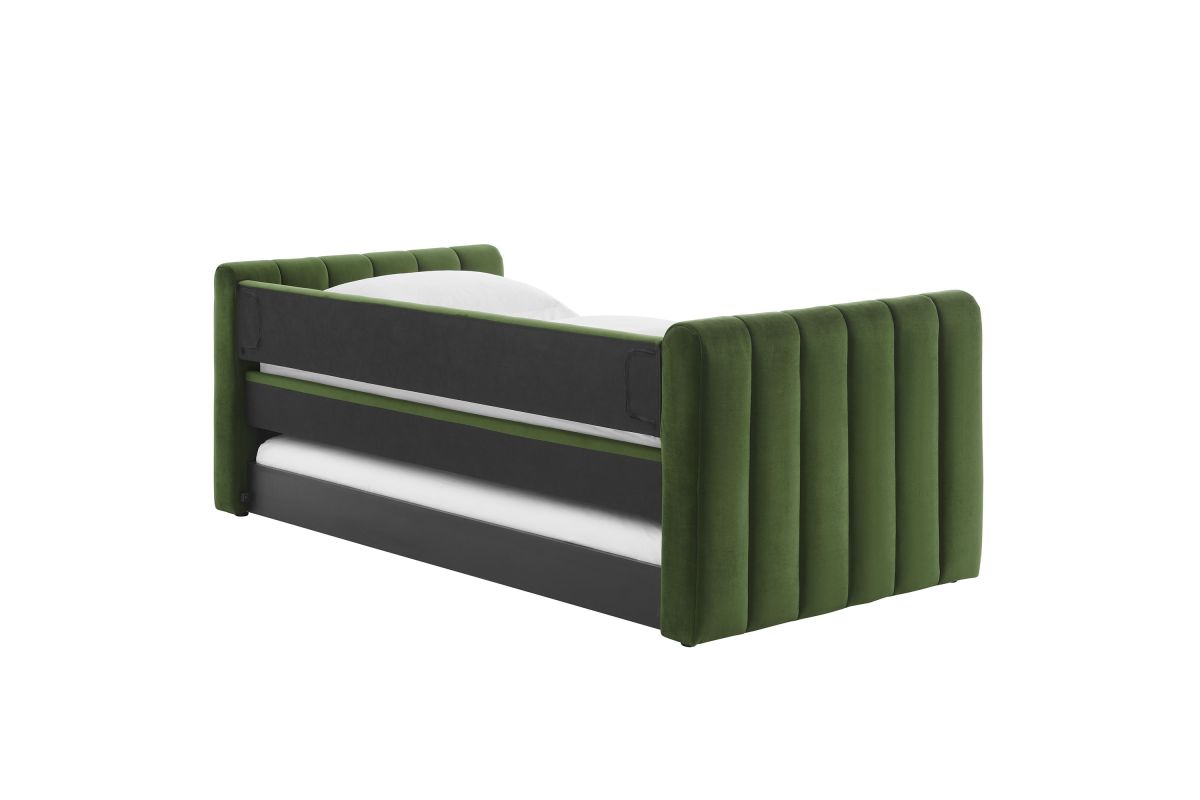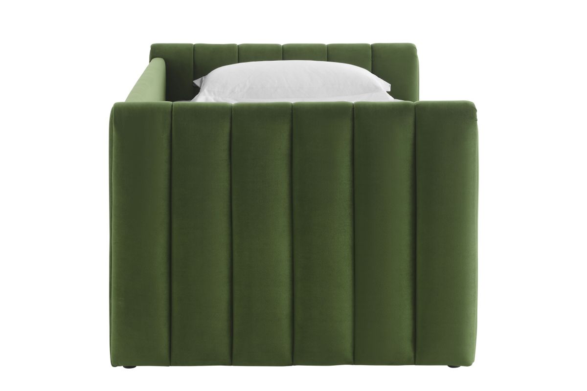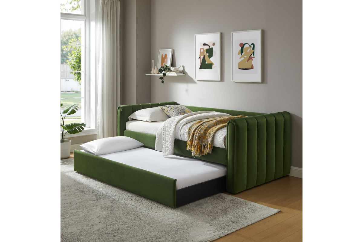 The Veyla Twin Daybed blends sleek form and plush texture with a streamlined silhouette and channel tufted detailing. Upholstered in soft, stain-resistant performance velvet, this twin size daybed with trundle offers a versatile sleeping solution for guest rooms, kids’ bedrooms, or multifunctional living areas. The fully upholstered frame features a low profile, gently padded sides, and tailored vertical channel tufting for a chic look. A hidden pull-out trundle on casters tucks beneath the main bed, creating a seamless twin-over-twin bed layout ideal for overnight guests or everyday lounging. Veyla’s built-in wood slat support system ensures lasting durability without the need for a box spring. Mattress not included. Assembly required. Weight Capacity: 300 lbs.
