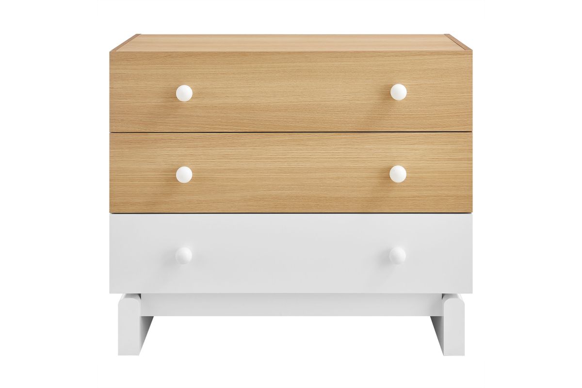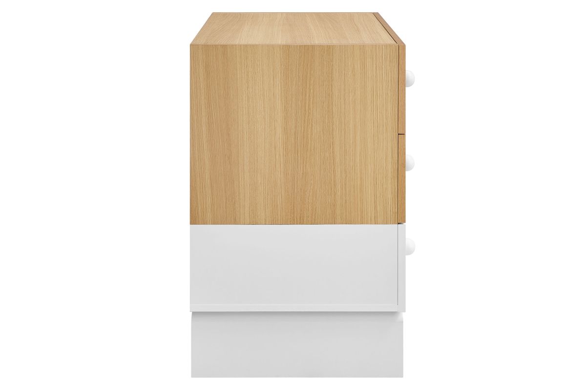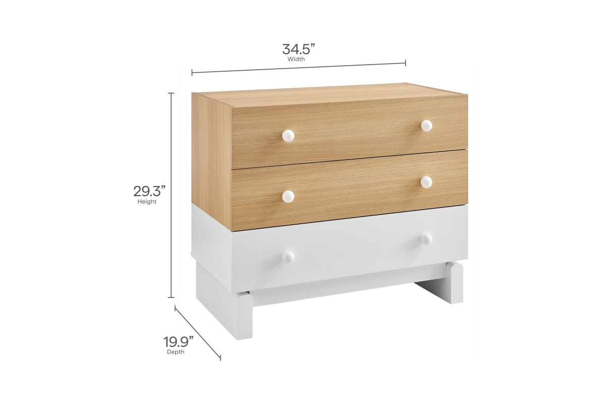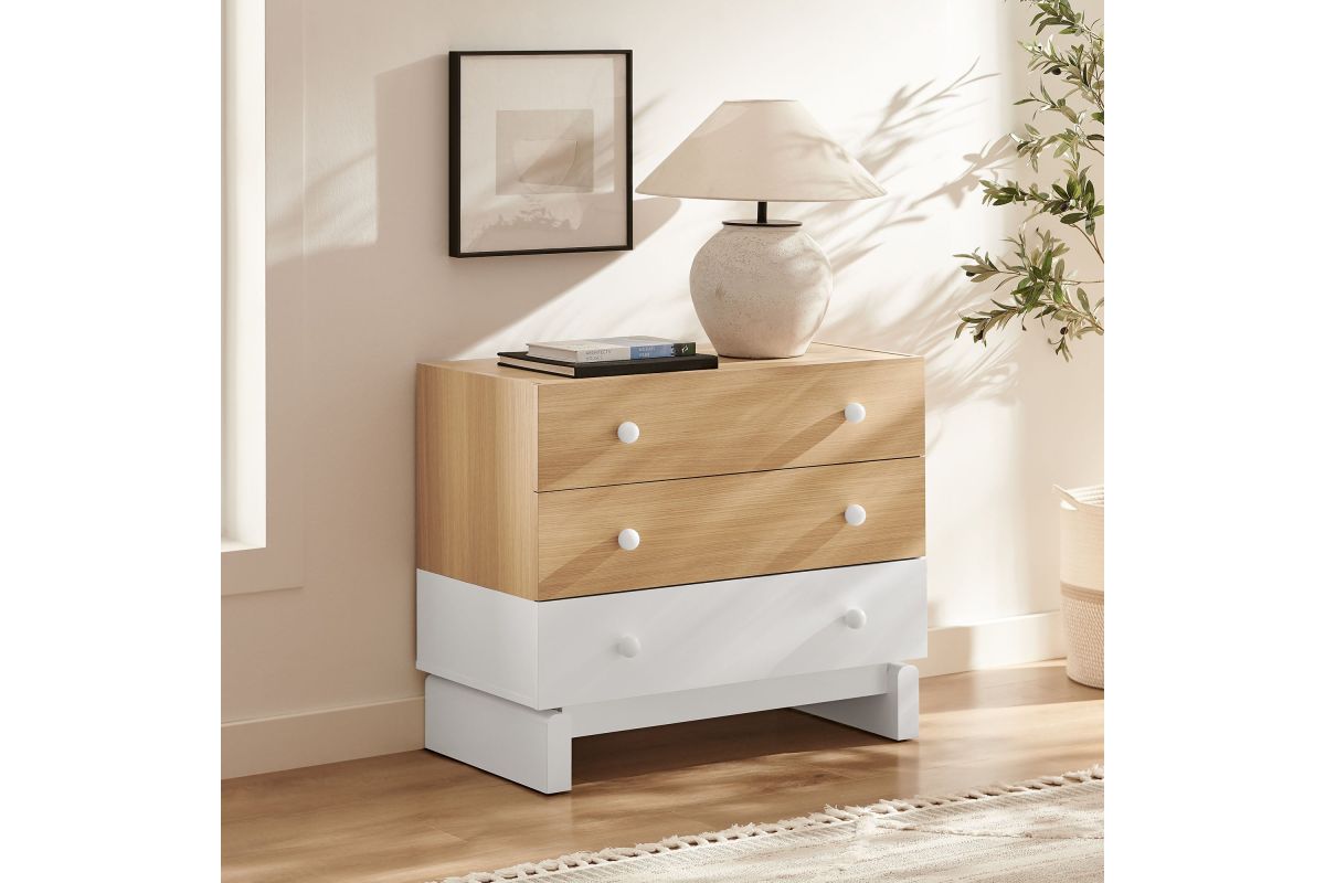 Bring a lighthearted yet modern touch to any room with the Nolia 3-Drawer Dresser, a playful storage piece that doubles as a tall nightstand. Designed with a two-tone color block style, this compact dresser features a wood grain laminate top, contrasting drawer panels, and curved block legs for an elevated look. The three spacious drawers on this large nightstand offer practical storage for clothing, accessories, or bedside essentials, all adorned with rounded knob handles for a fresh, simple finish. Whether placed in a bedroom, hallway, or home office, the Nolia storage dresser brings function and charm to small-space living. Non-marking floor glides included. Assembly required.