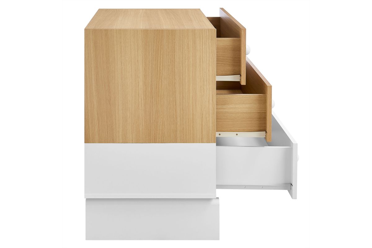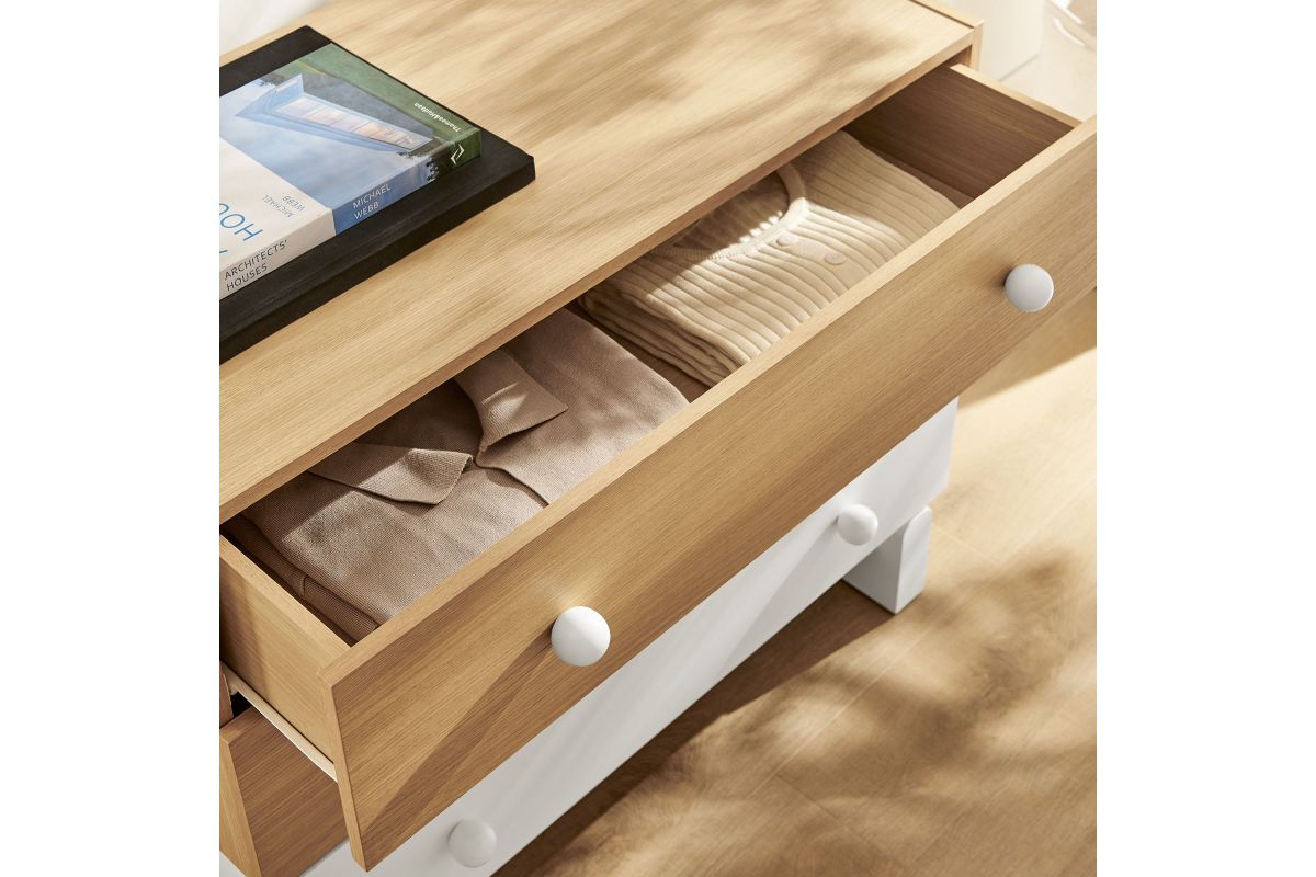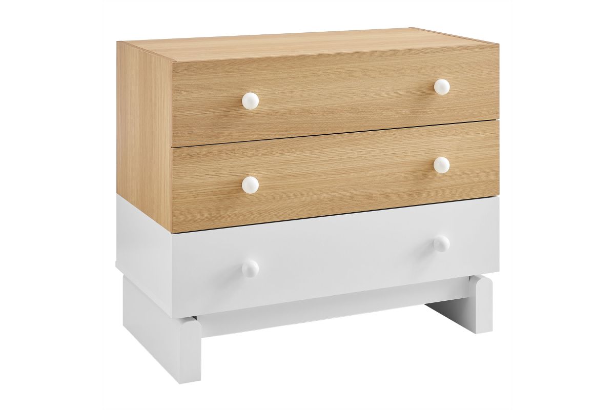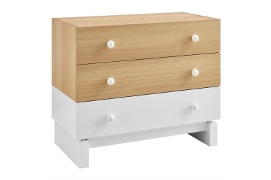 Bring a lighthearted yet modern touch to any room with the Nolia 3-Drawer Dresser, a playful storage piece that doubles as a tall nightstand. Designed with a two-tone color block style, this compact dresser features a wood grain laminate top, contrasting drawer panels, and curved block legs for an elevated look. The three spacious drawers on this large nightstand offer practical storage for clothing, accessories, or bedside essentials, all adorned with rounded knob handles for a fresh, simple finish. Whether placed in a bedroom, hallway, or home office, the Nolia storage dresser brings function and charm to small-space living. Non-marking floor glides included. Assembly required.
