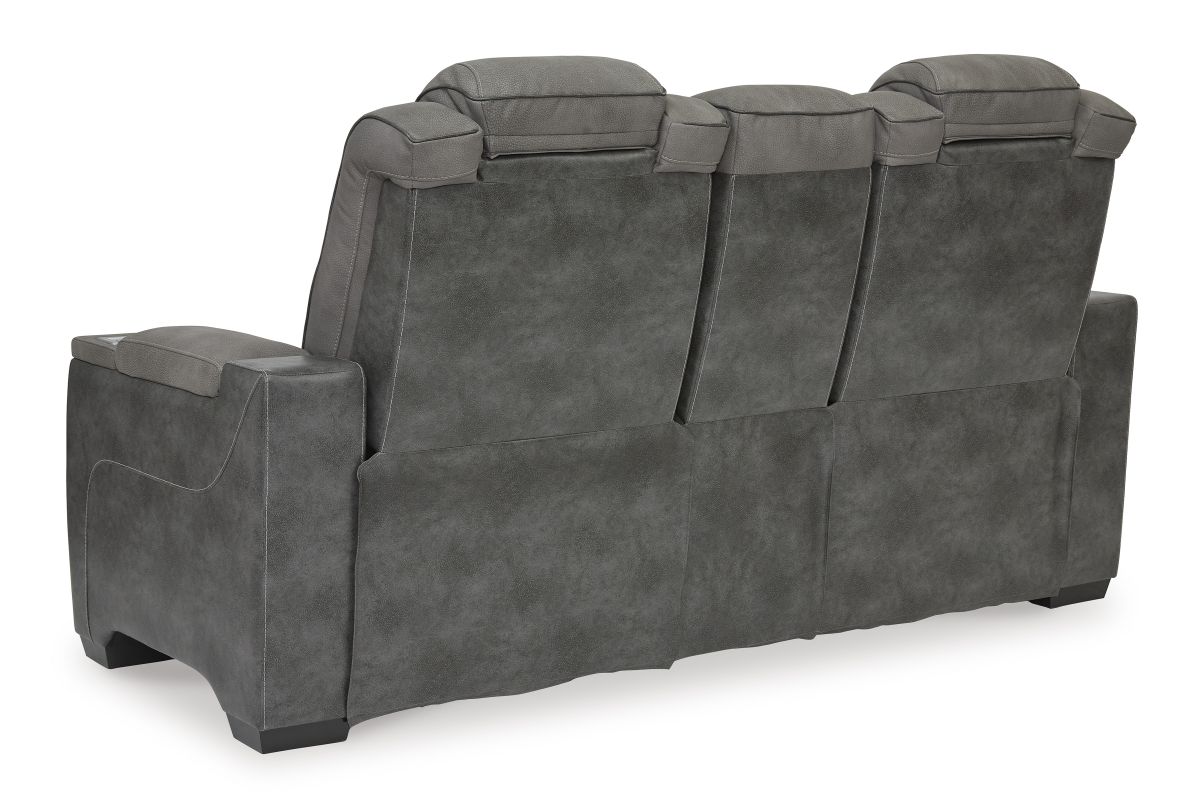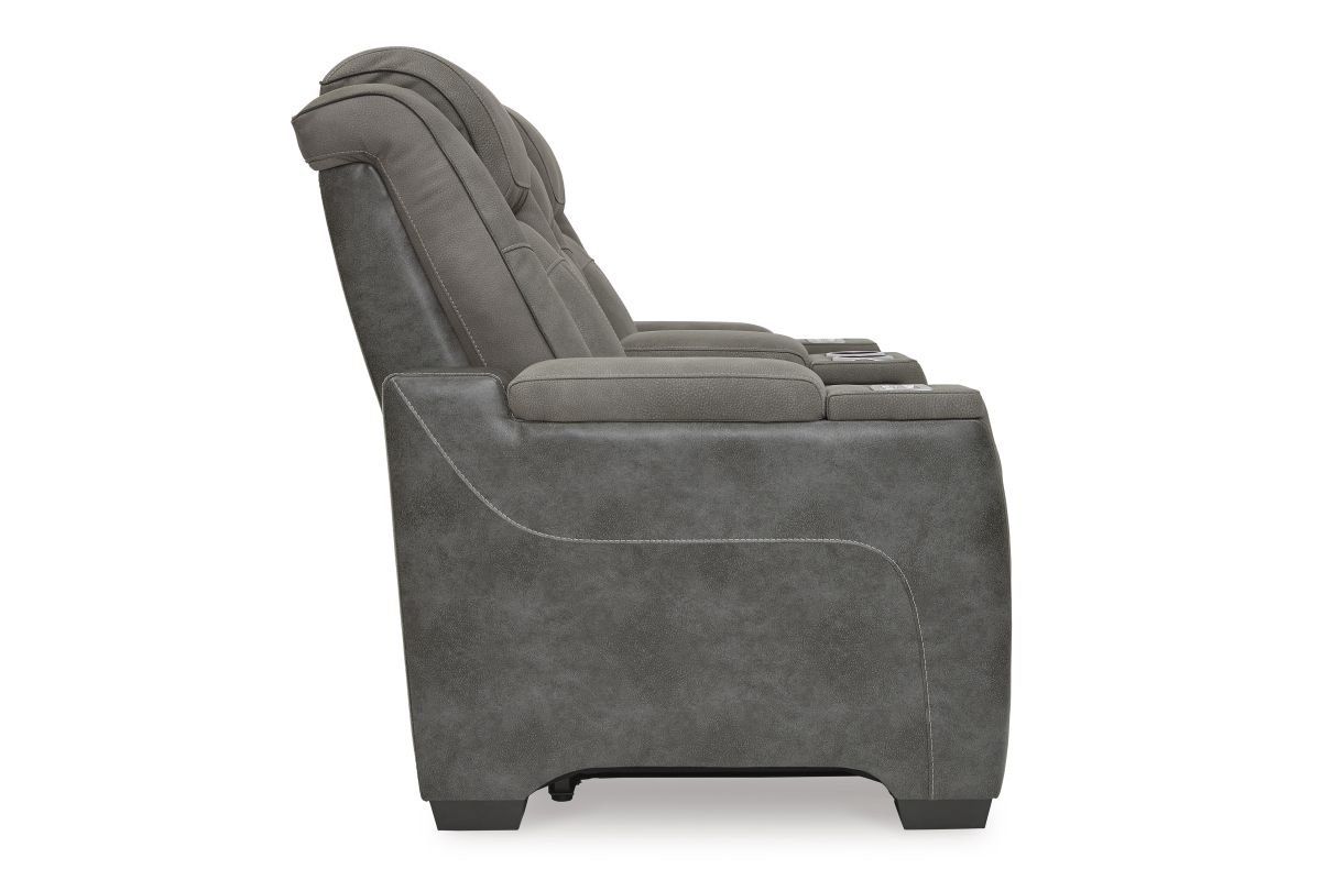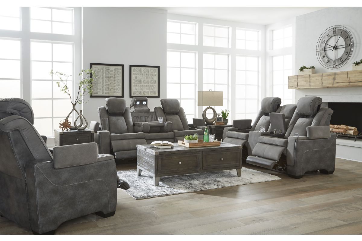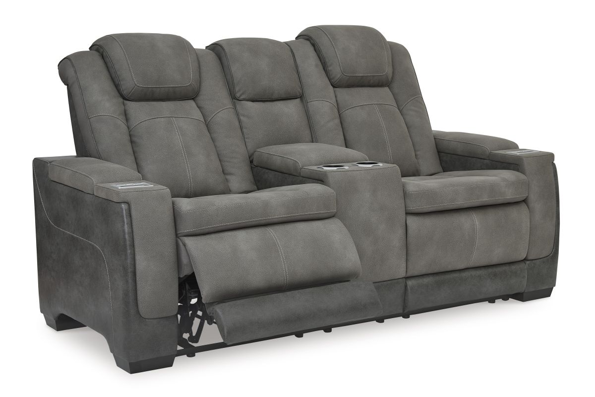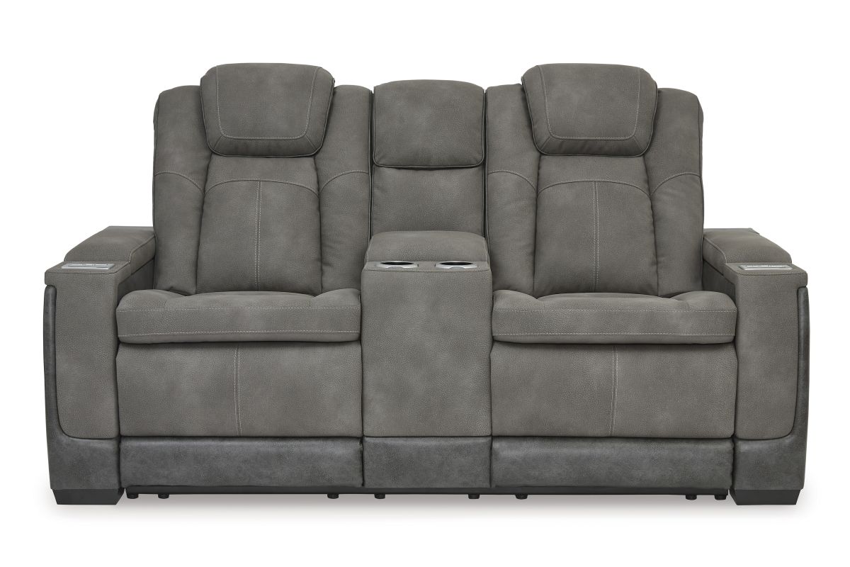 This sleek, ultra-modern power reclining loveseat with console has it all. With designer style and head-to-toe comfort, it has the upscale look of leather at a scaled-down faux leather price. Its gray two-tone upholstery is more durable and water-repellent than regular leather, an added bonus for families. Features including wireless and USB charging, an adjustable headrest and an extended ottoman make this the next generation of power recliners.