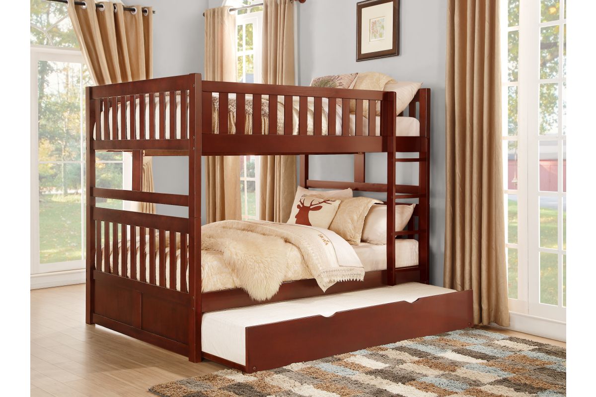 Maximizing sleep space is achieved with the stylish Rowe Collection. This transitional full over full bunk bed with twin trundle offers flexible sleeping arrangements, presented in a rich dark cherry finish ideal for multi-use bedrooms.