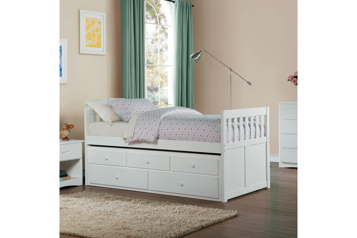 Maximizing sleep space is achieved with the stylish Galen Collection. This transitional twin over twin captain bed includes a convenient trundle and two built-in storage drawers, all finished in white for a timeless and functional bedroom solution.