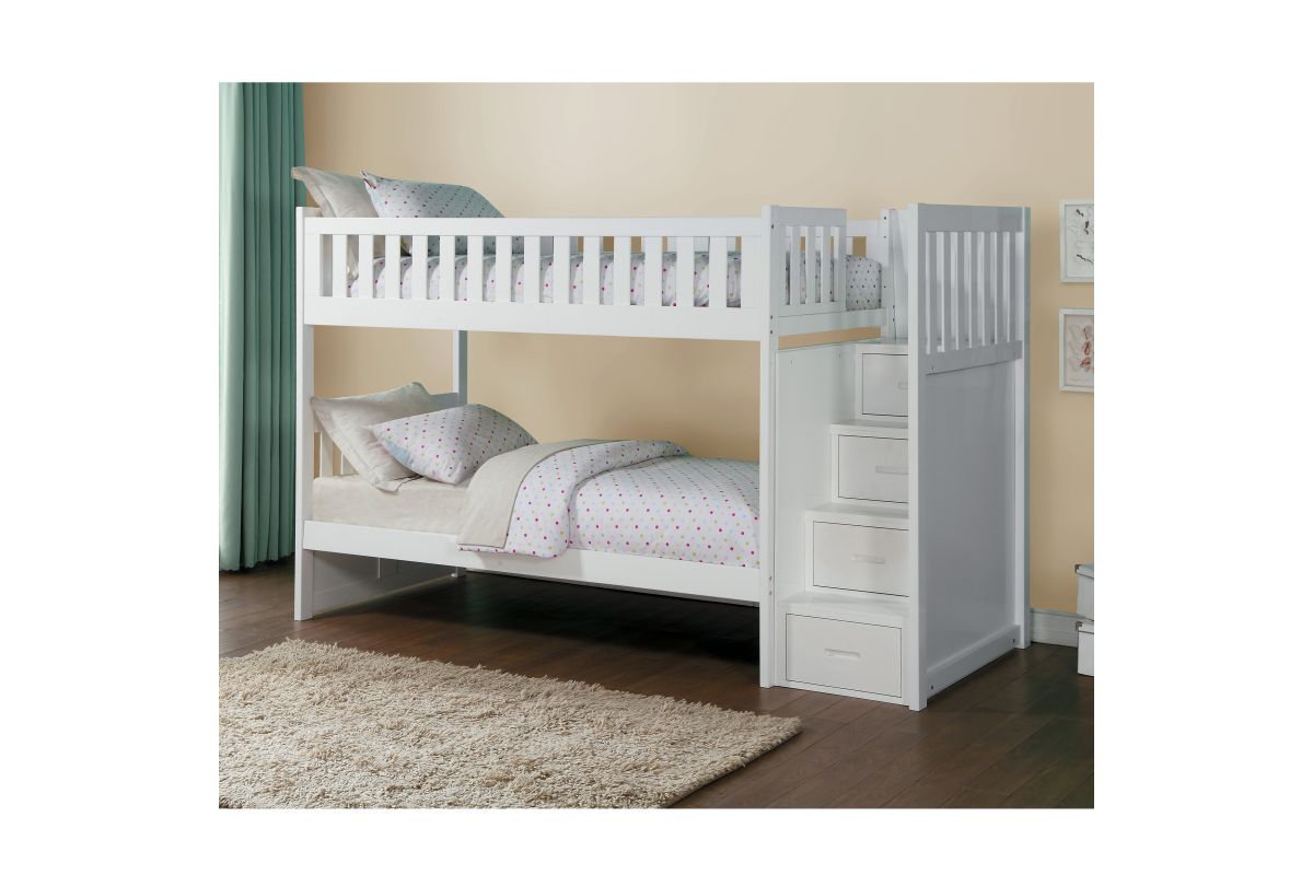 Maximizing sleep space is achieved with the stylish Galen Collection. This transitional twin over twin step bunk bed is featured in a white finish and includes an integrated stairway design that provides easy access and a clean, modern look.