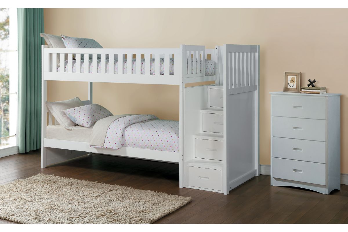 Maximizing sleep space is achieved with the stylish Galen Collection. This transitional twin over twin step bunk bed with coordinating storage chest is featured in a white finish, combining smart design with lasting appeal.