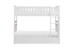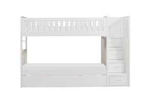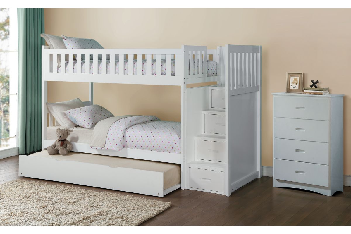 Maximizing sleep space is achieved with the stylish Galen Collection. This transitional twin over twin step bunk bed includes a twin trundle and matching storage chest, all finished in white to create a complete and functional youth bedroom ensemble.