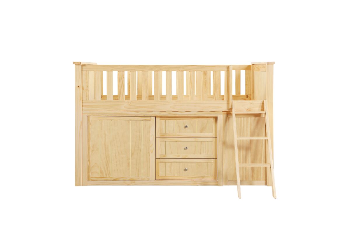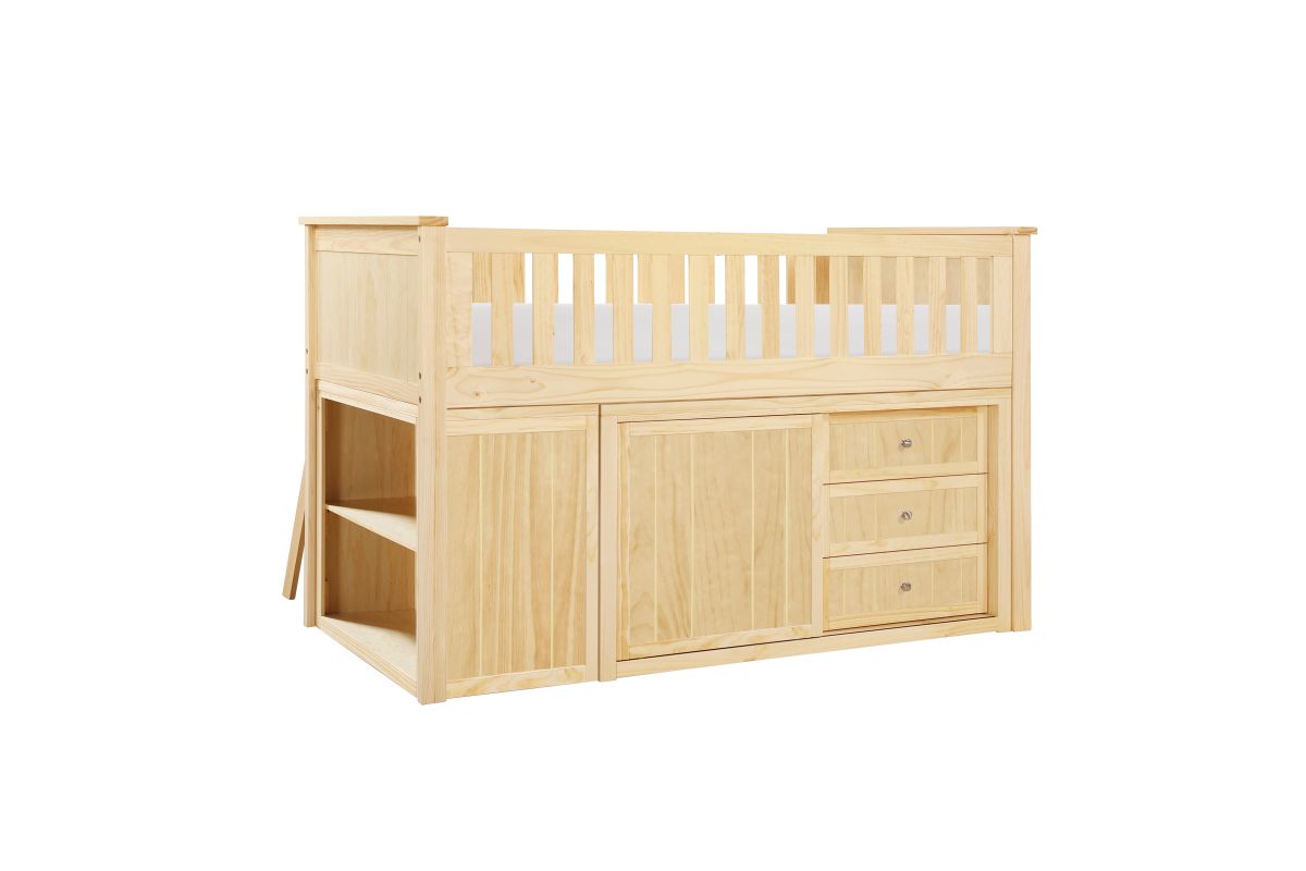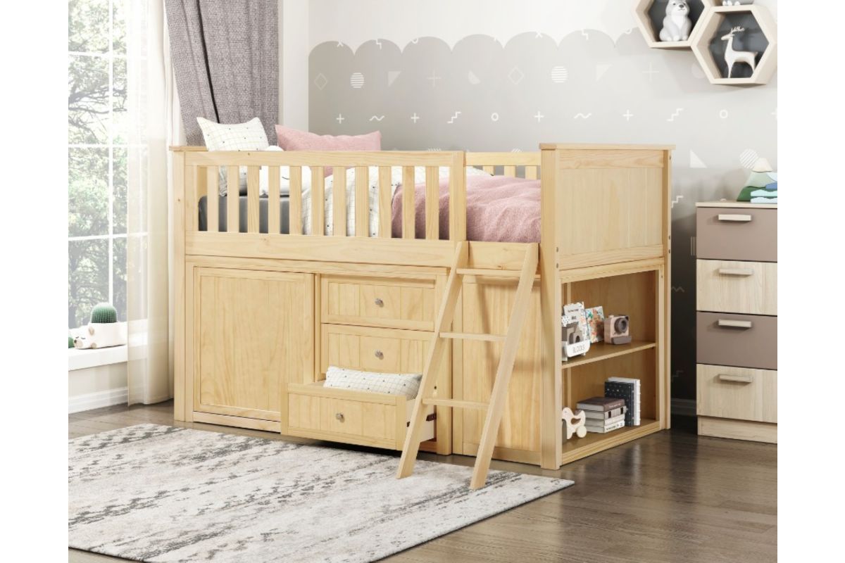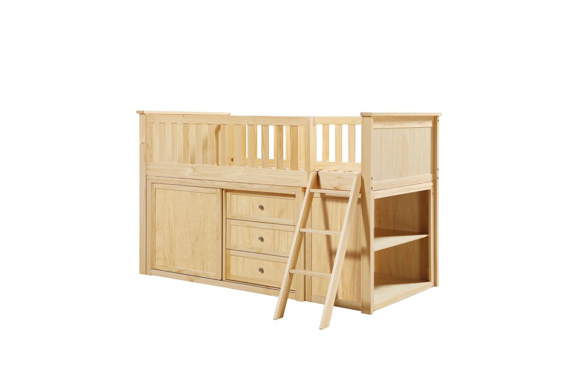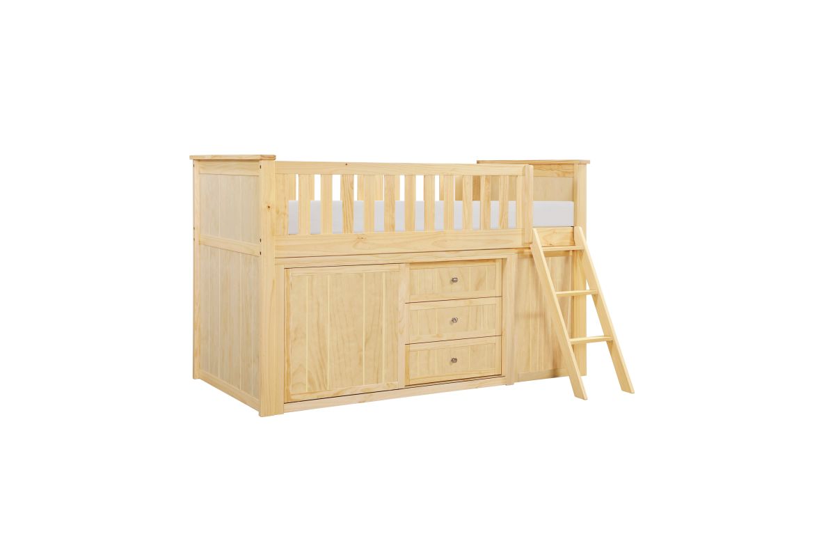 Maximizing sleep space is achieved with the stylish Bartly Collection. This transitional twin low-loft bunkbed is featured in a natural pine finish making it an appropriate choice for a number of youth bedroom settings. An angled ladder provides easy access to the loft platform. Providing below-the-bed storage are the dressers and bookcase, each specifically designed to fit within the parameters of the available lower space with the dresser providing shelf and drawer storage and the bookcase allowing for open display of your child's favorite books and collectables.