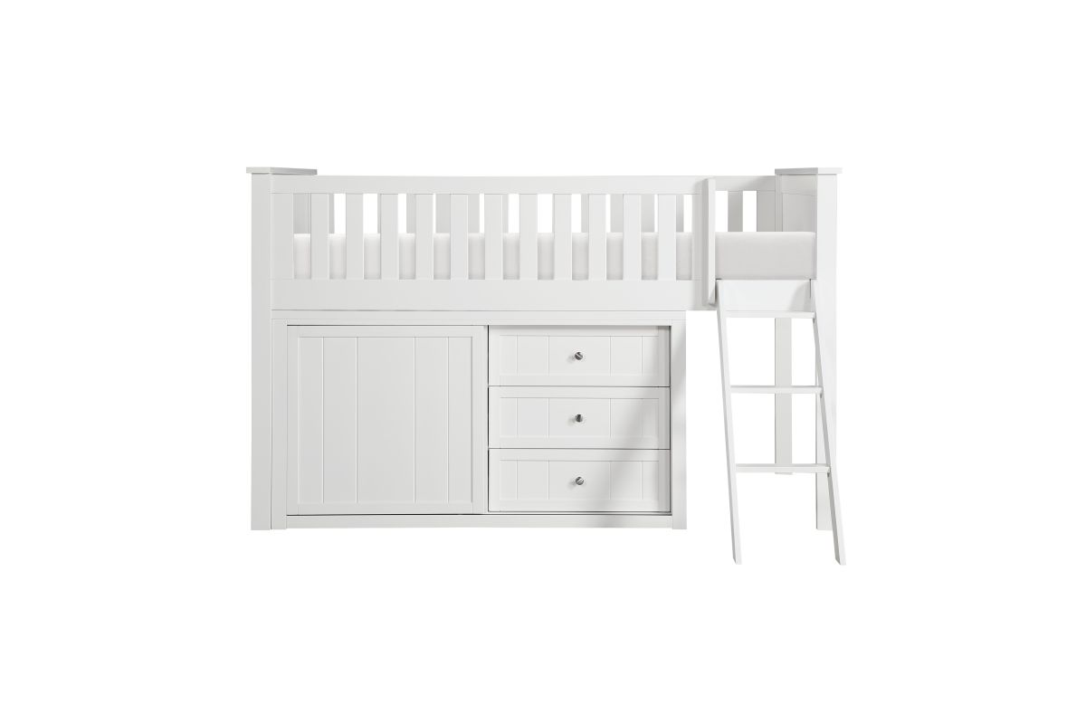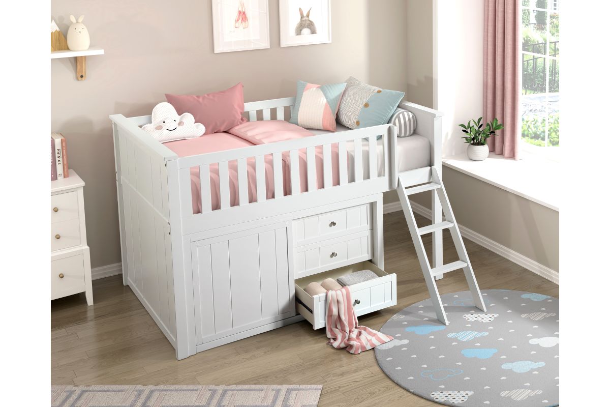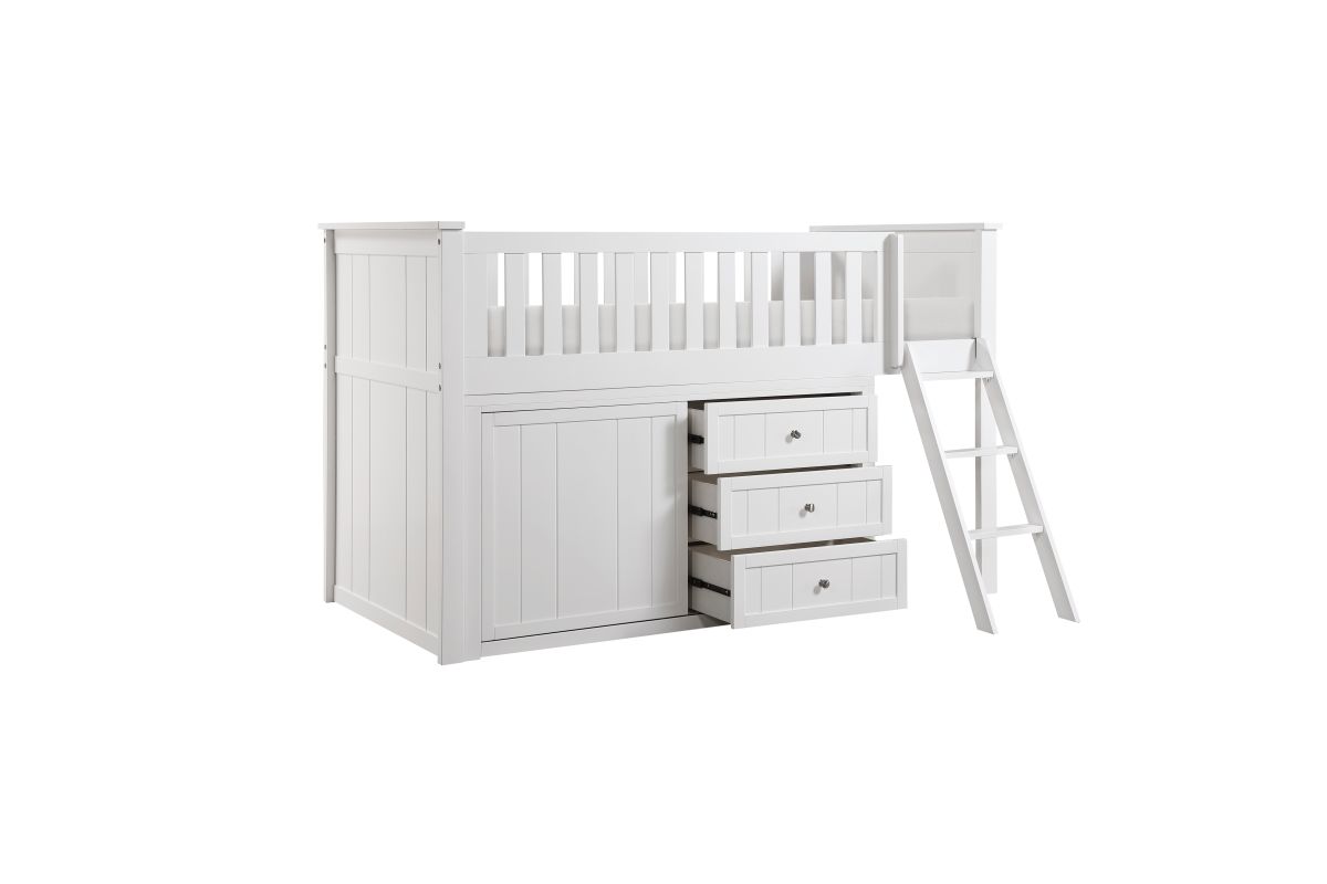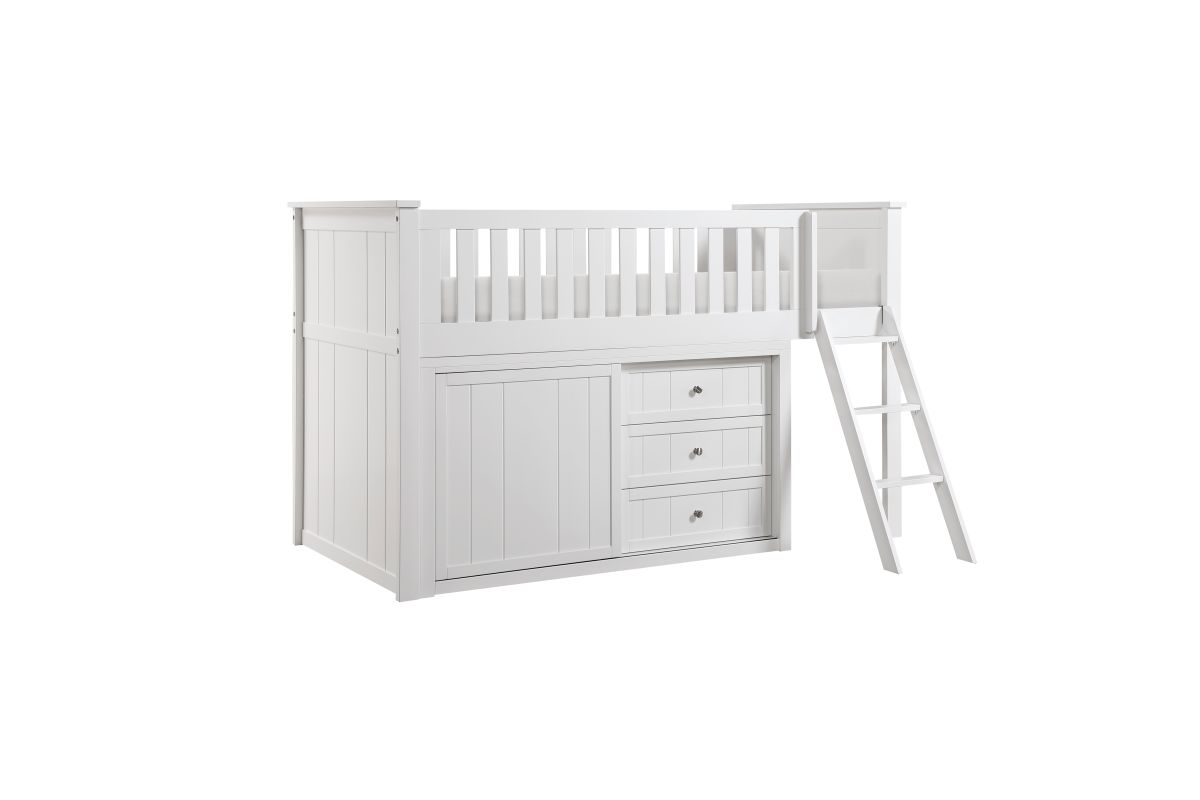 Maximizing sleep space is achieved with the stylish Galen Collection. This transitional twin low-loft bunkbed is featured in a white finish making it an appropriate choice for a number of youth bedroom settings. An angled ladder provides easy access to the loft platform. Providing below-the-bed storage is the dresser, specifically designed to fit within the parameters of the available lower space, its shelf and drawer storage create a convenient spot for clothing and toys.