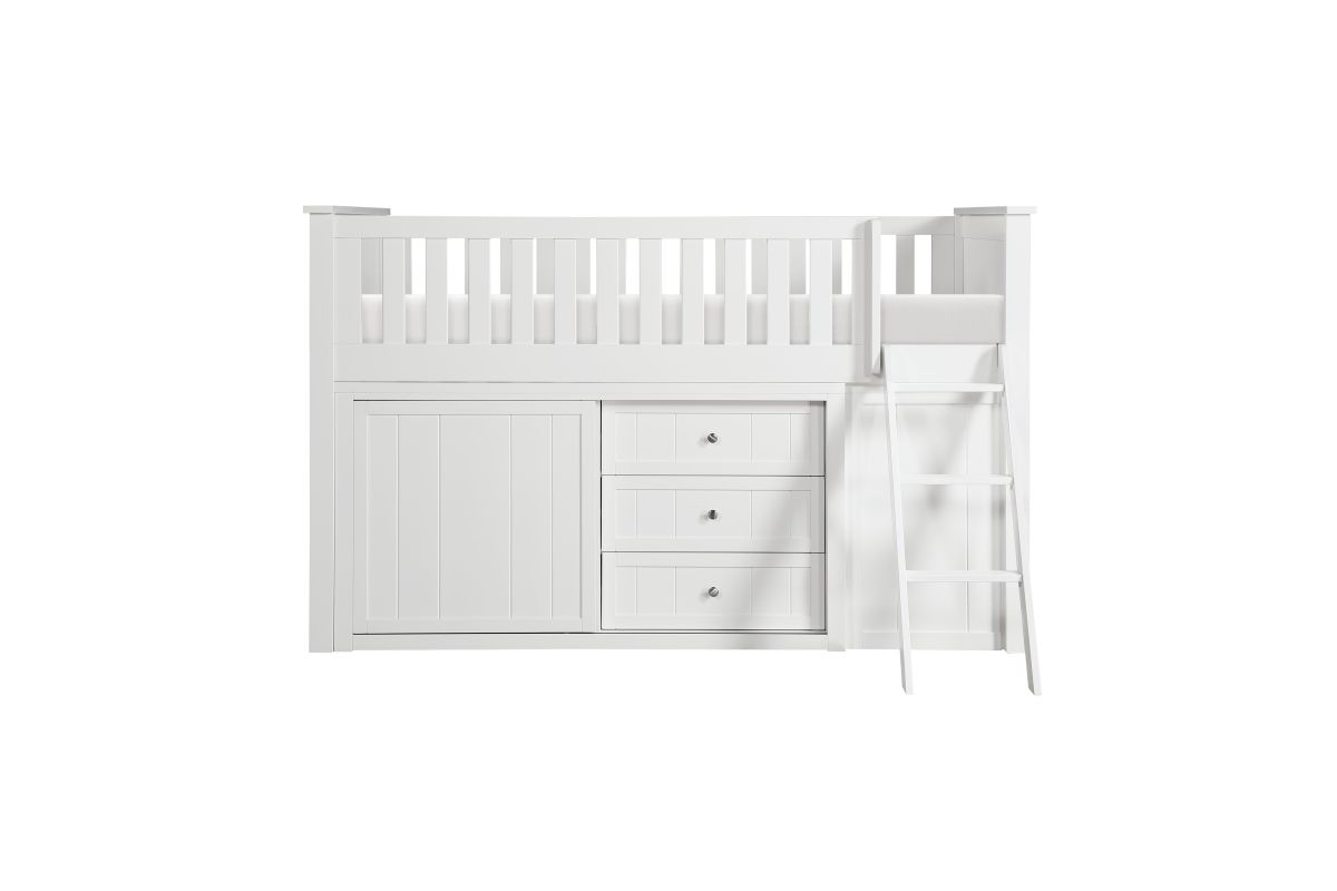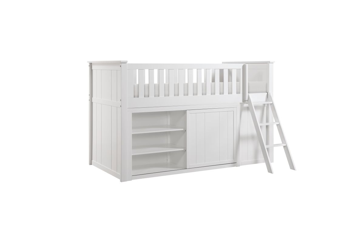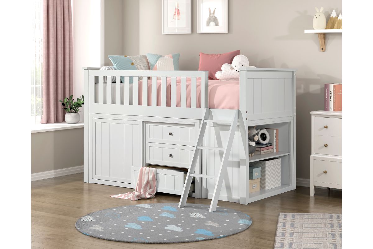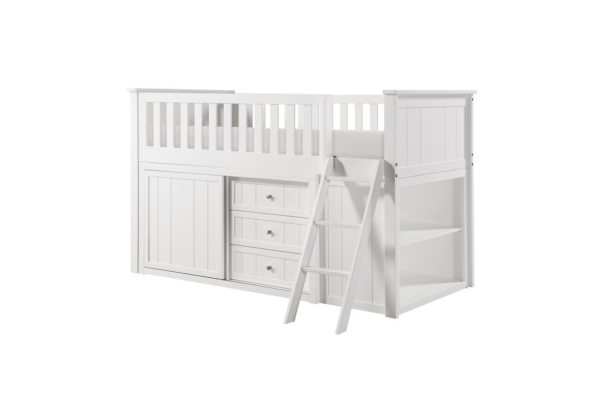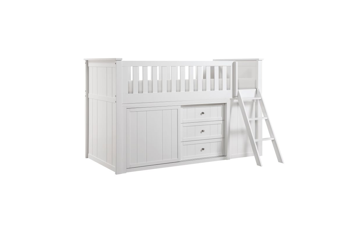 Maximizing sleep space is achieved with the stylish Galen Collection. This transitional twin low-loft bunkbed is featured in a white finish making it an appropriate choice for a number of youth bedroom settings. An angled ladder provides easy access to the loft platform. Providing below-the-bed storage are the dresser and bookcase, each specifically designed to fit within the parameters of the available lower space with the dresser providing shelf and drawer storage and the bookcase allowing for open display of your child's favorite books and collectables.