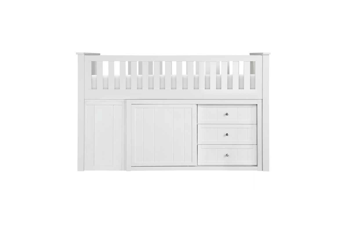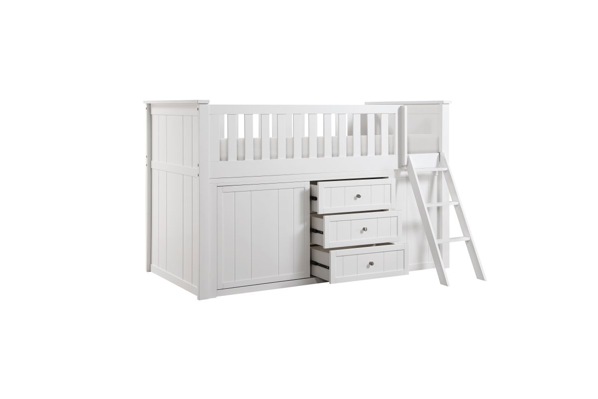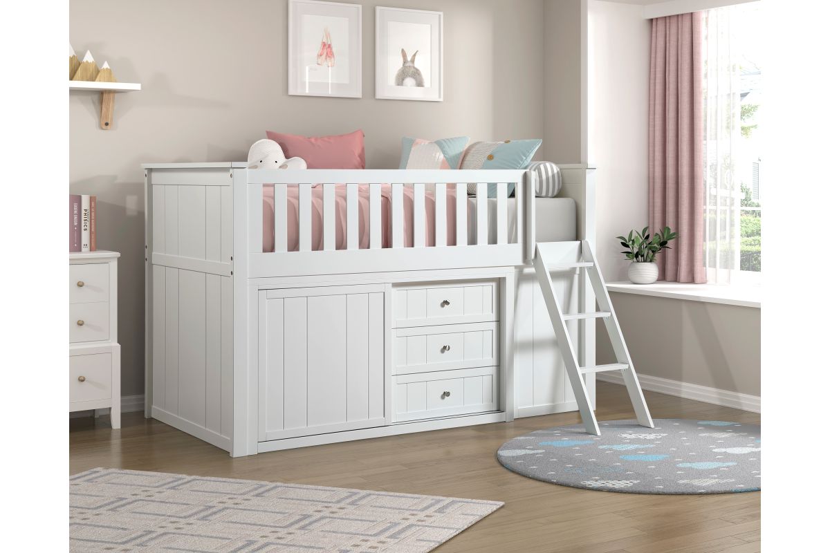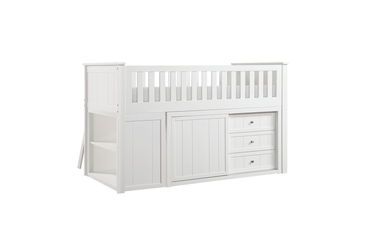 Maximizing sleep space is achieved with the stylish Galen Collection. This transitional twin low-loft bunkbed is featured in a white finish making it an appropriate choice for a number of youth bedroom settings. An angled ladder provides easy access to the loft platform. Providing below-the-bed storage are two dressers and bookcase, each specifically designed to fit within the parameters of the available lower space with the dressers providing shelf and drawer storage and the bookcase allowing for open display of your child's favorite books and collectables.