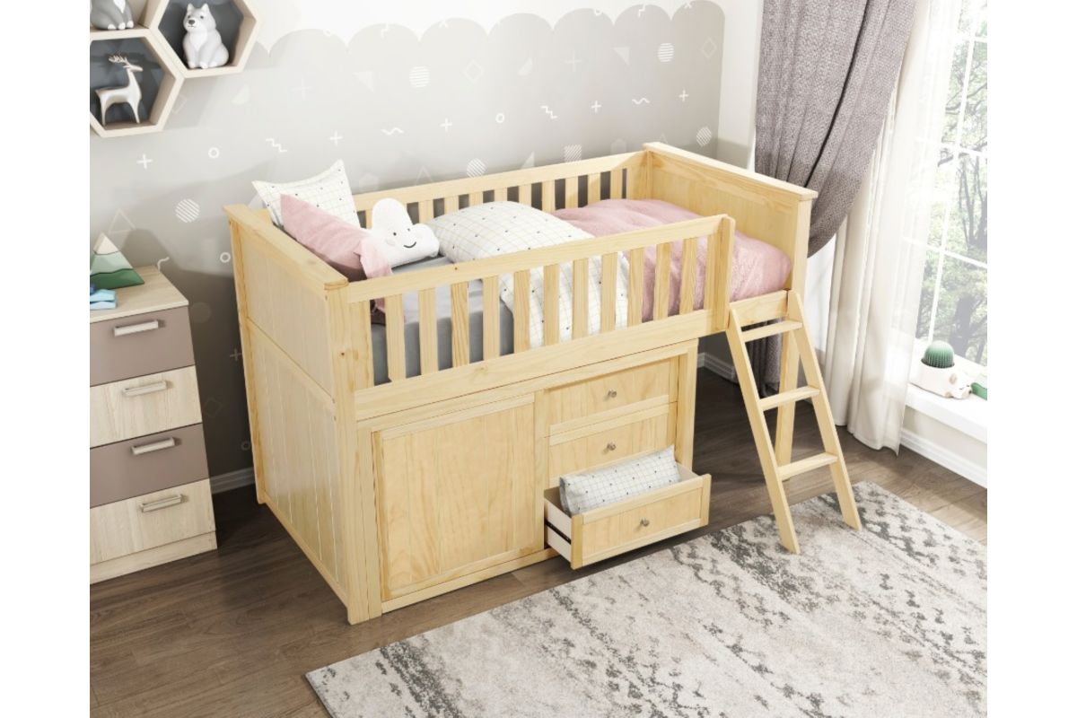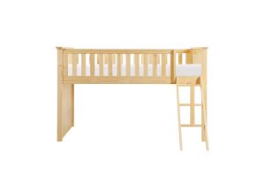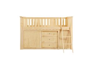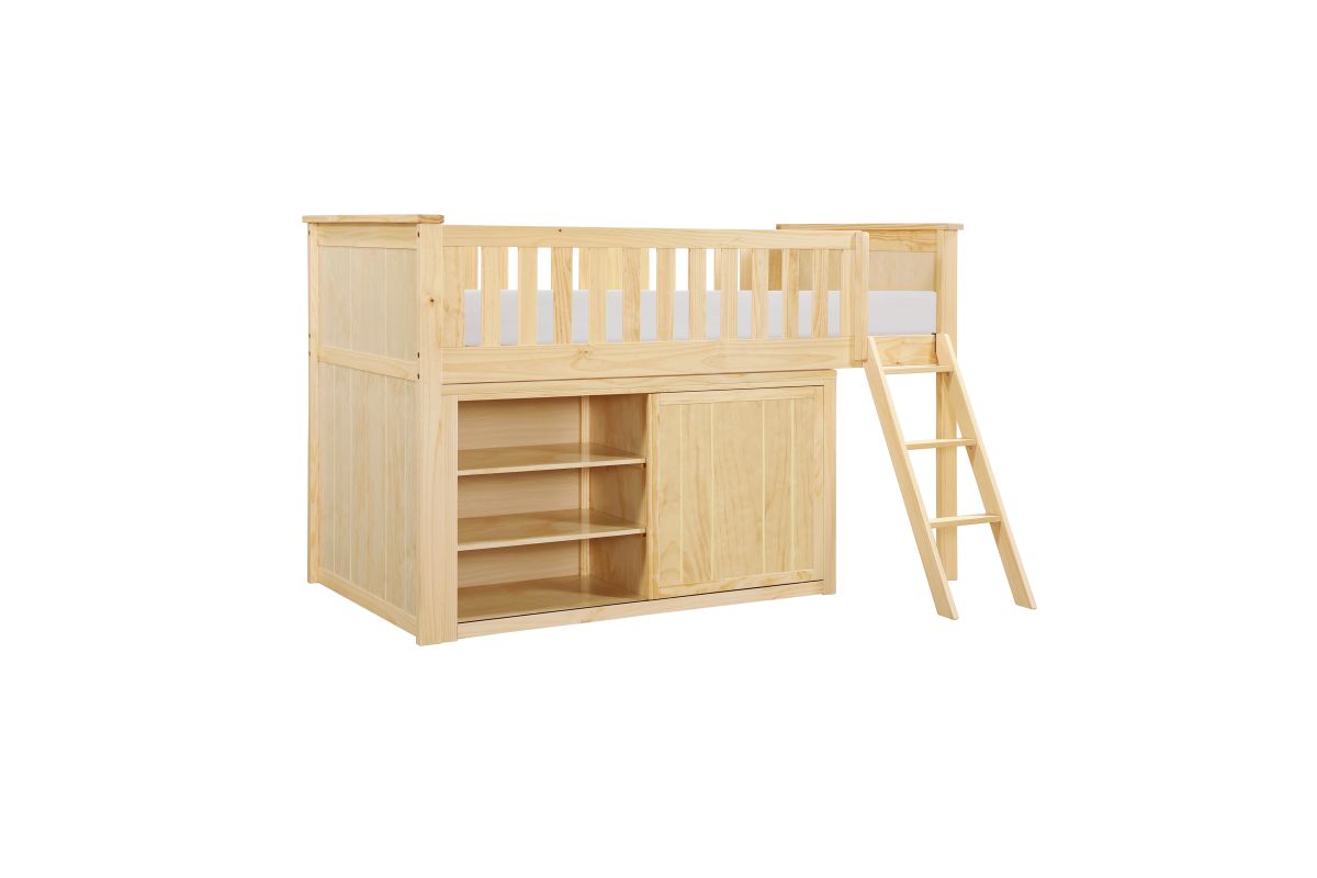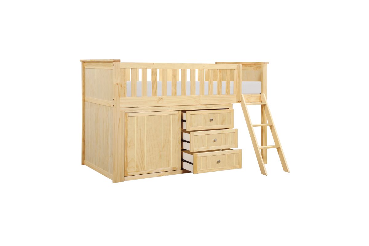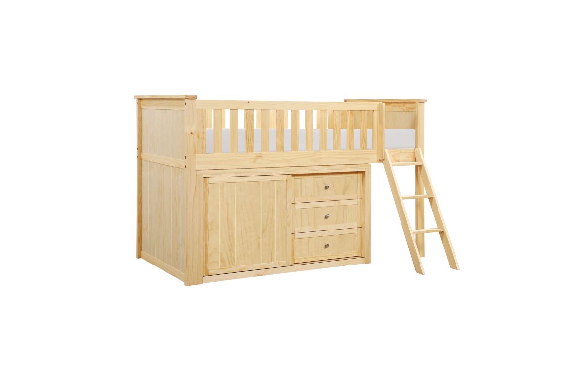 Maximizing sleep space is achieved with the stylish Bartly Collection. This transitional twin low-loft bunkbed is featured in a natural pine finish making it an appropriate choice for a number of youth bedroom settings. An angled ladder provides easy access to the loft platform. Providing below-the-bed storage is the dresser, specifically designed to fit within the parameters of the available lower space with providing shelf and drawer storage.