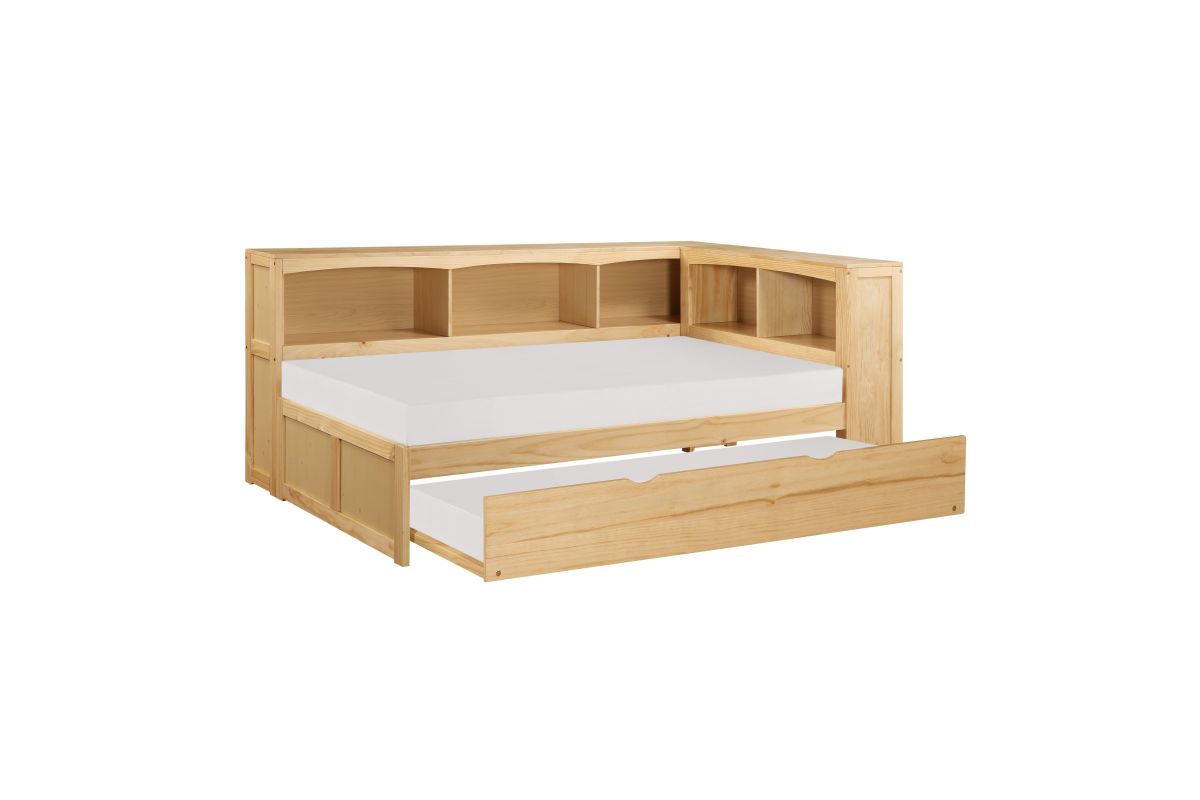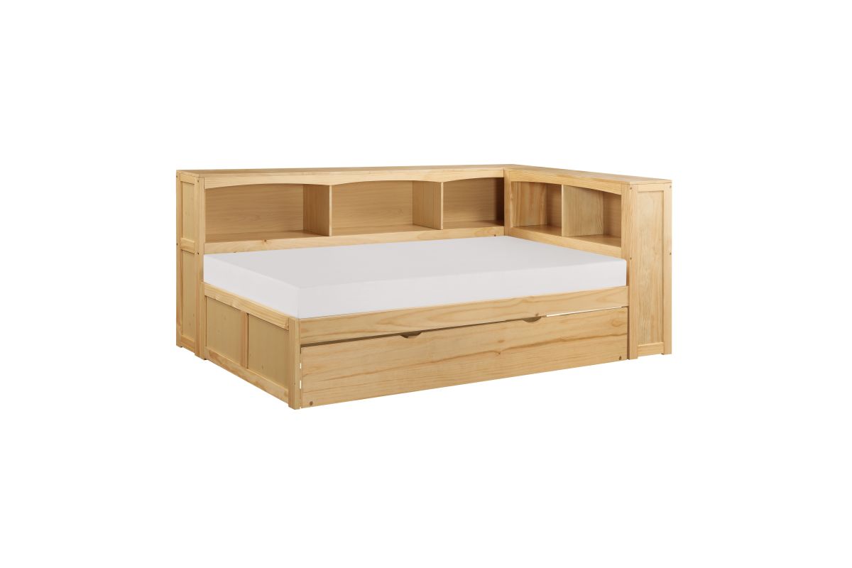 Maximizing sleep space is achieved with the Bartly Collection. This natural pine twin bookcase platform bed with trundle adds warmth and practicality to youth and guest rooms.