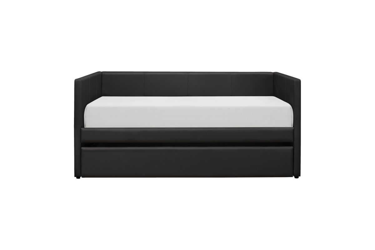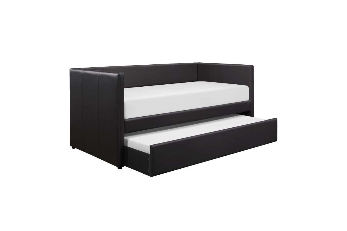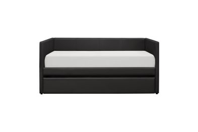 Adra Collection blended with clean contemporary lines and black faux leather covering, creates a look that will compliment your home's decor. Whether used for sleeping or relaxing, the clean-line trundle design allows for placement in a number of room sizes and configurations, while the under-bed trundle pulls out to accommodate your additional sleep space needs.