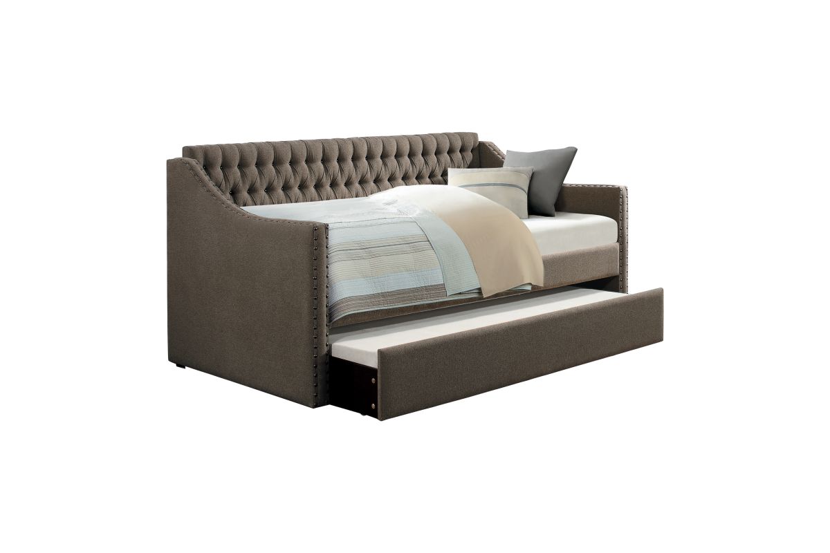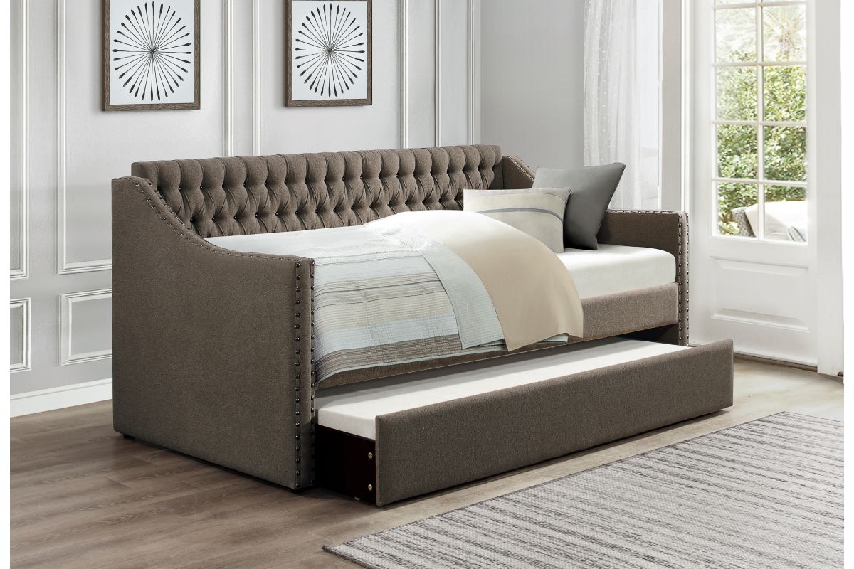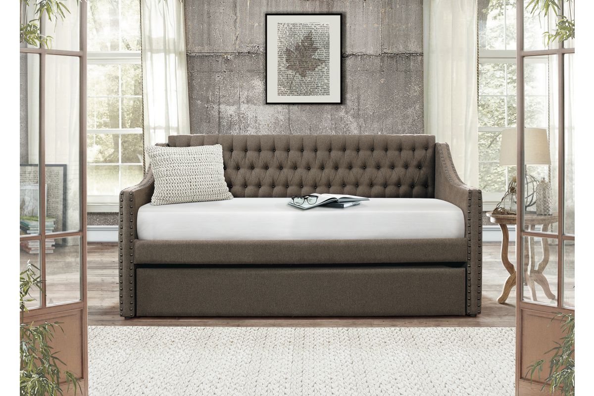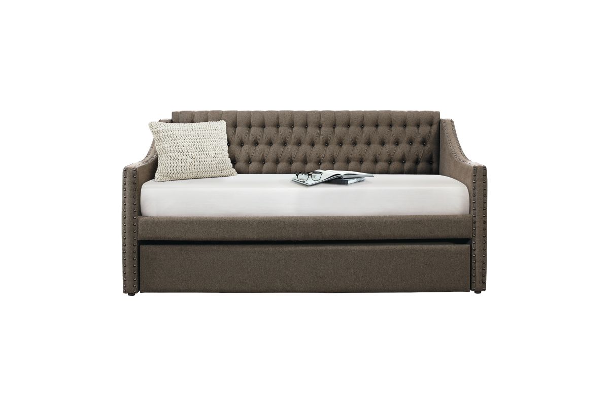 The Tulney Collection is designed with the modern traditional home in mind. Designed to use as a bed or a cozy relaxation nook, it features a trundle that provides the extra space that you need for overnight guests. The day bed is covered in brown fabric. The button-tufted back panel and nailhead accent along the curved arm panels complete the traditional look