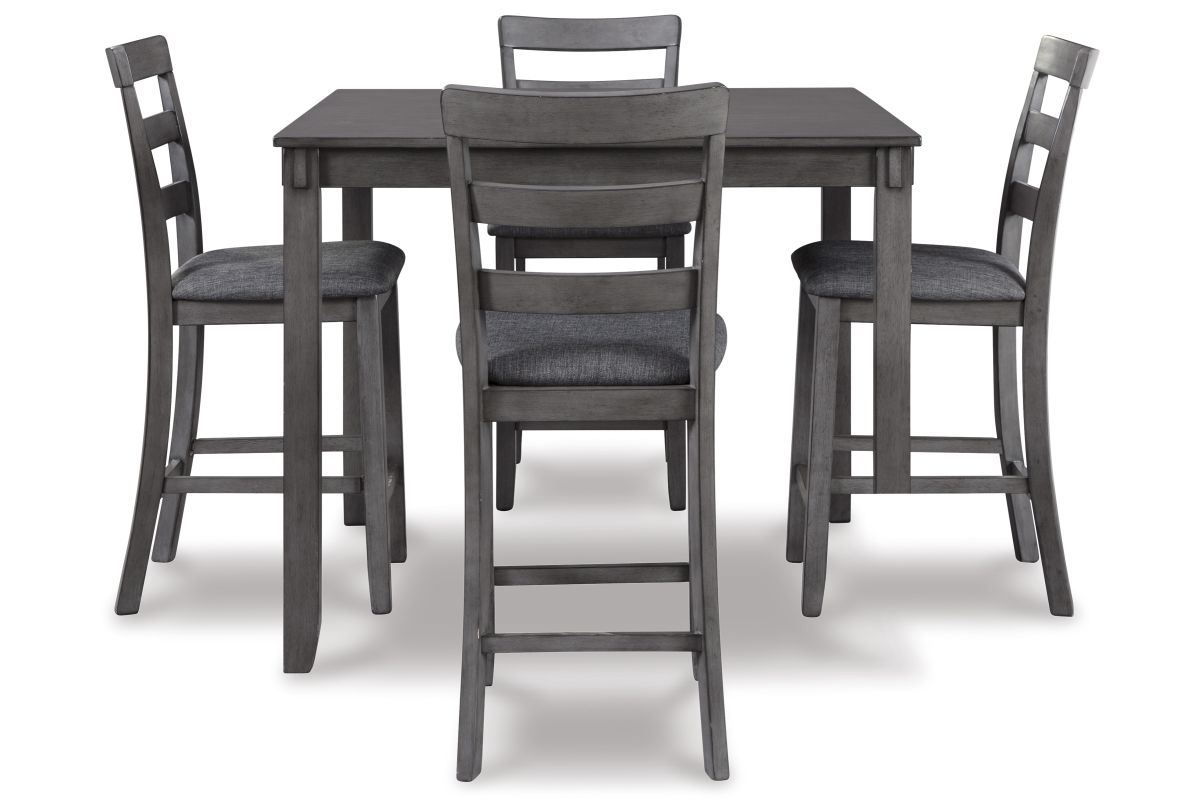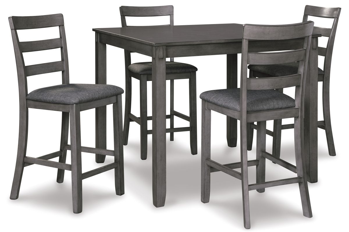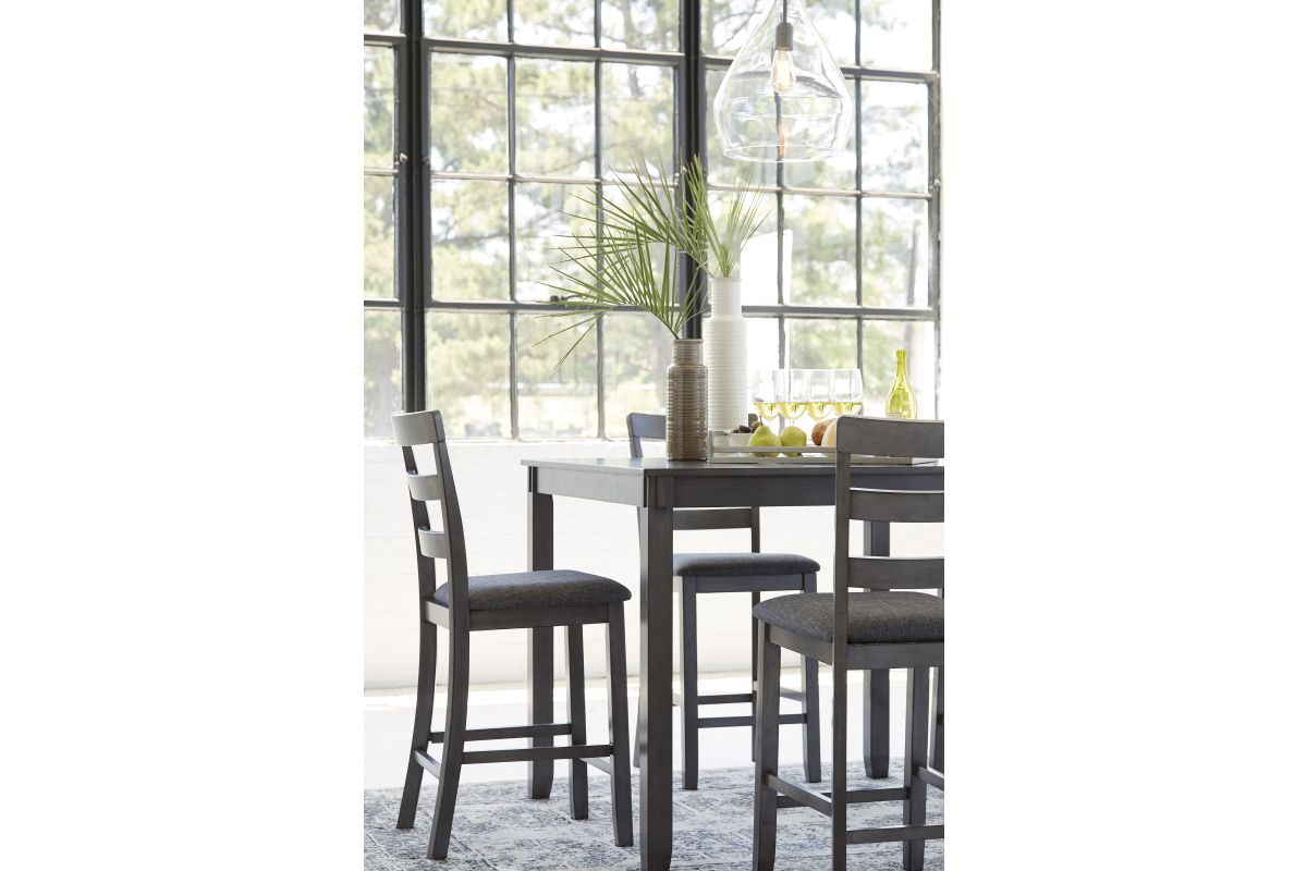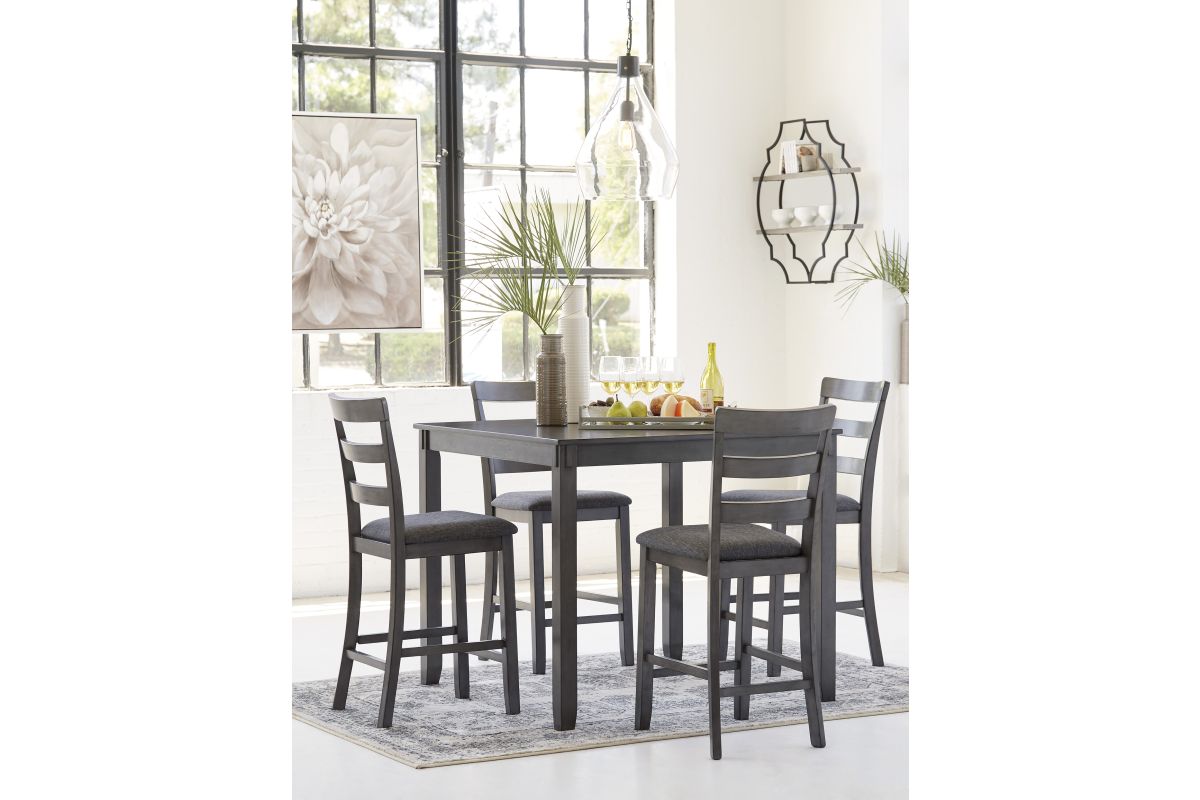 It’s so easy being gray—at least this 5-piece dining set makes it seem that way. This transitional counter-height table and barstool ensemble sports a charcoal gray finish with textured gray upholstery for an on-trend and relevant appeal. Plushly upholstered seat cushion in a practical polyfiber makes it a pleasure to linger at the table. Best of all, square table design is ideally suited for small spaces.