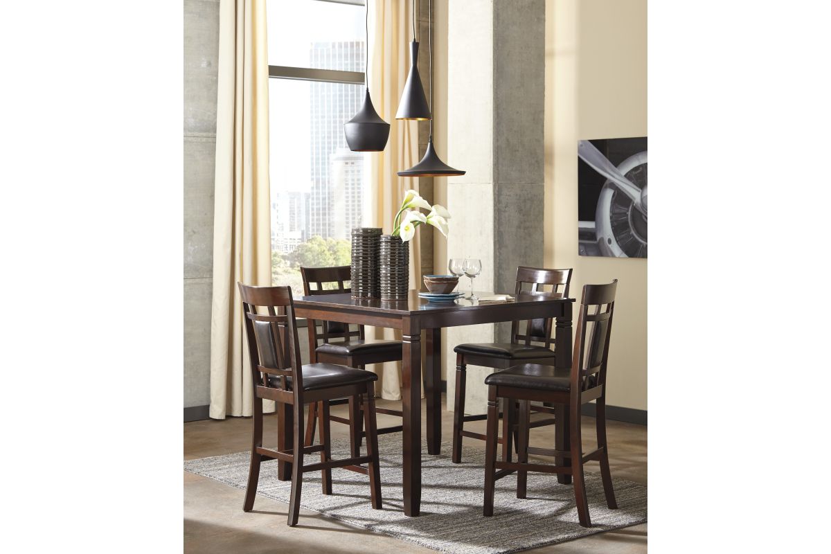 Set the scene for cool, comfortable and ultra-contemporary style with this counter table set. Counter-height design makes eating in feel more like dining out at a trendy pub. Richly upholstered in a practical faux leather with welcome back supports, the four bar stools are sure to satisfy.