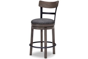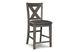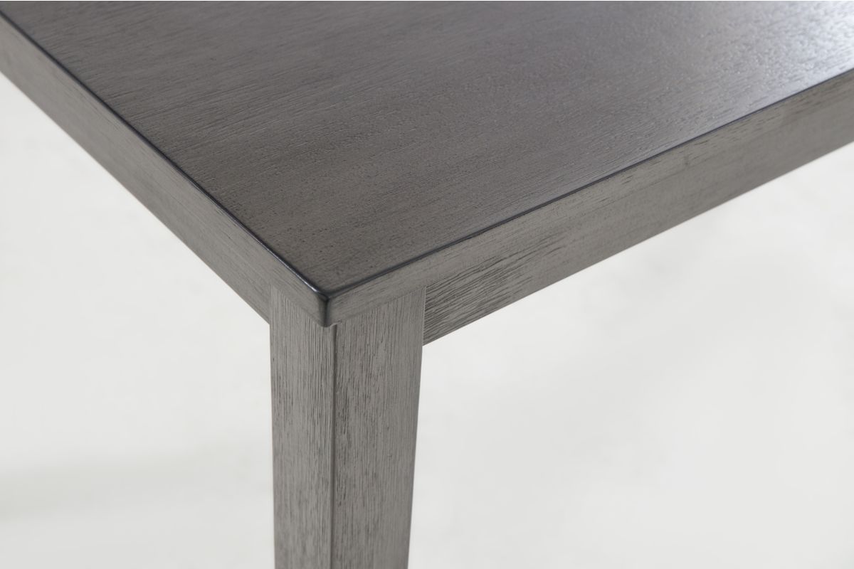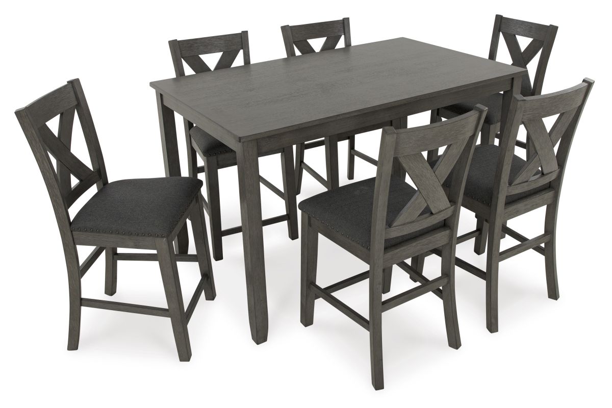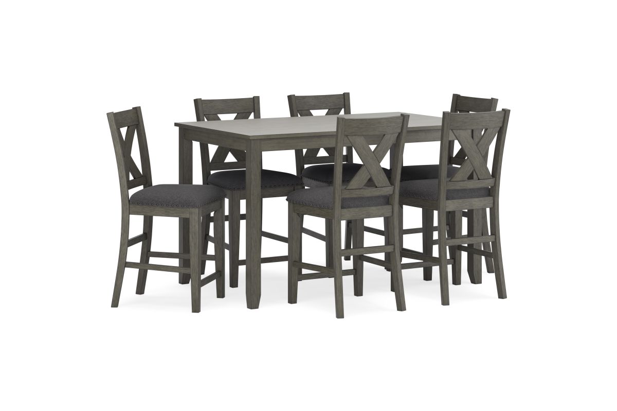 Perfect portion. Striking a simply chic pose, this counter height dining set is crafted with fascinating flair. A subtle gray wash finish gives the clean-lined design a casually cool sensibility. Plushly cushioned seats in a soft, neutral upholstery add to the allure. During casual get-togethers, daily dinners and family game nights alike, this set serves up stylish function.
