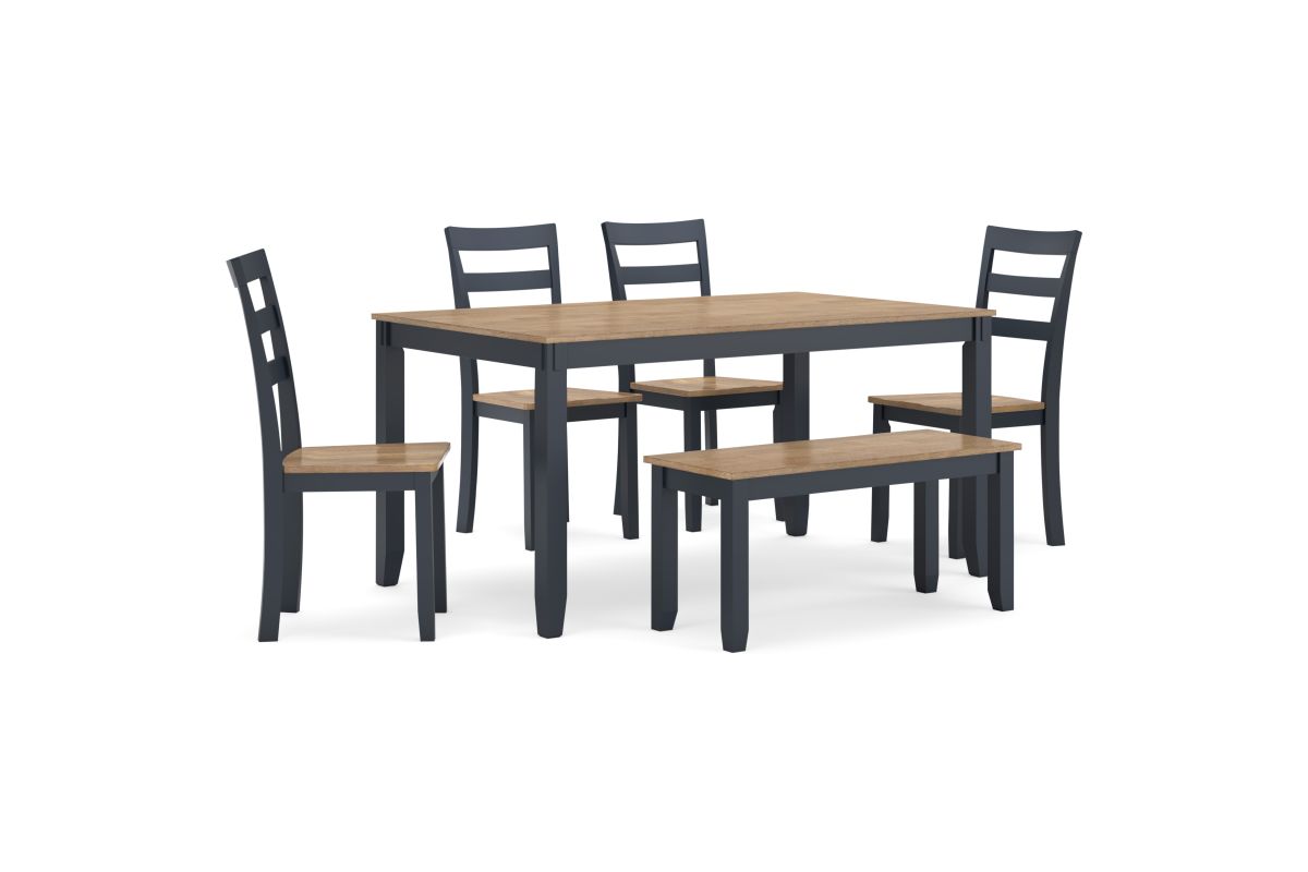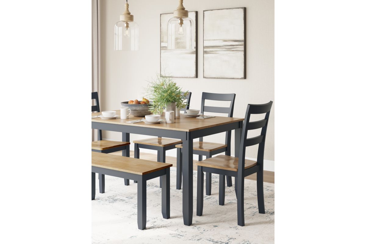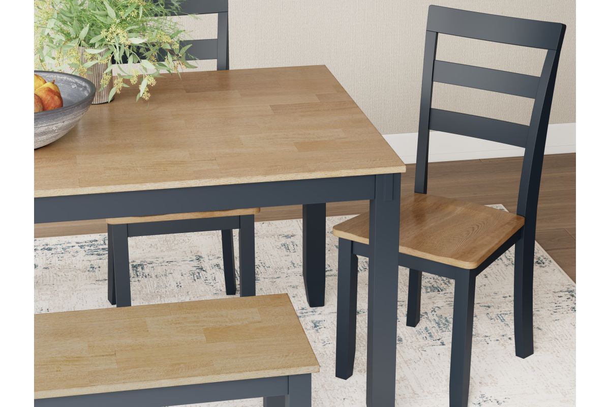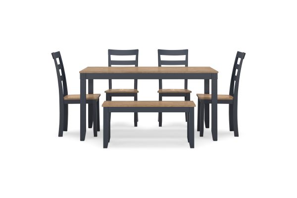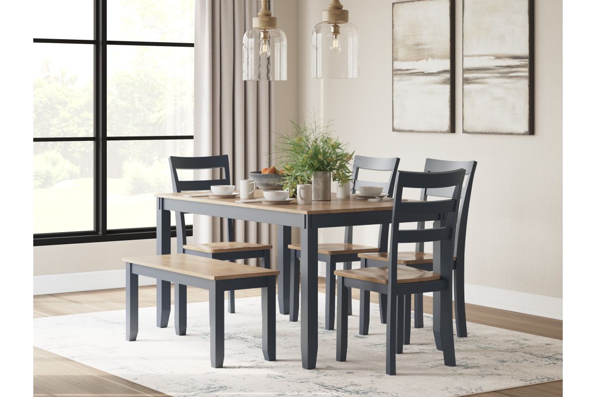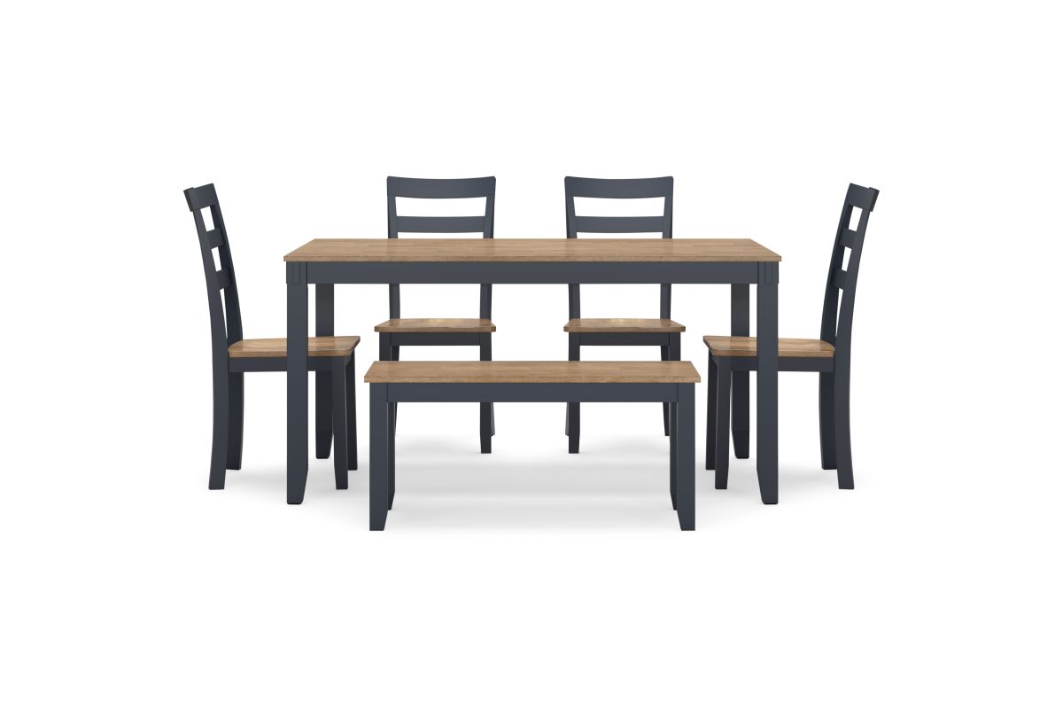 Complement your home’s simply relaxed sensibility with this dining table, chairs and bench. A dark blue hue offers a chic contrast to the natural wood tone, for a casual look that vibes with a variety of aesthetics. Whether you're sipping your morning coffee, settling in for dinner or working from home, this set is smartly designed for everyday comfort and style.