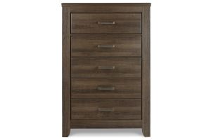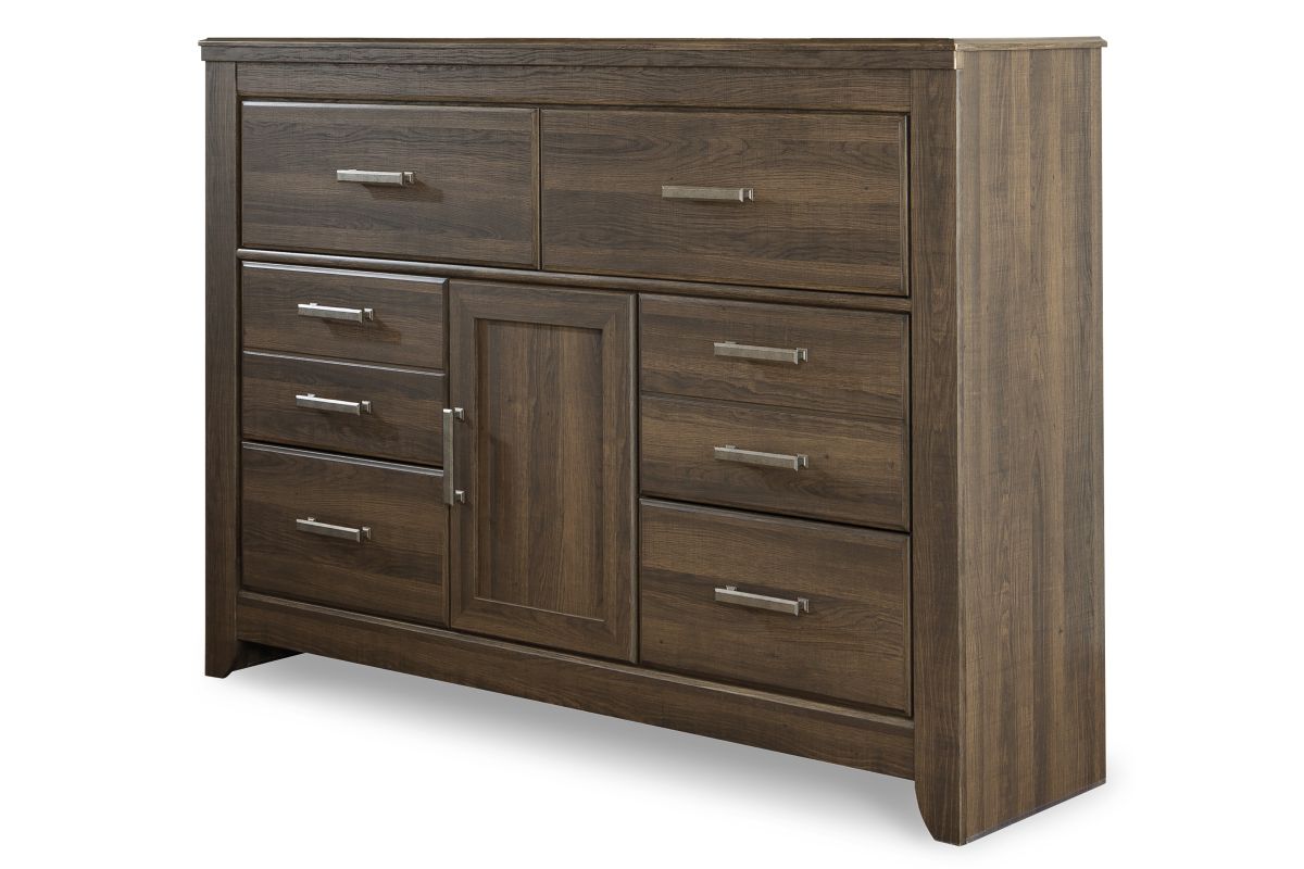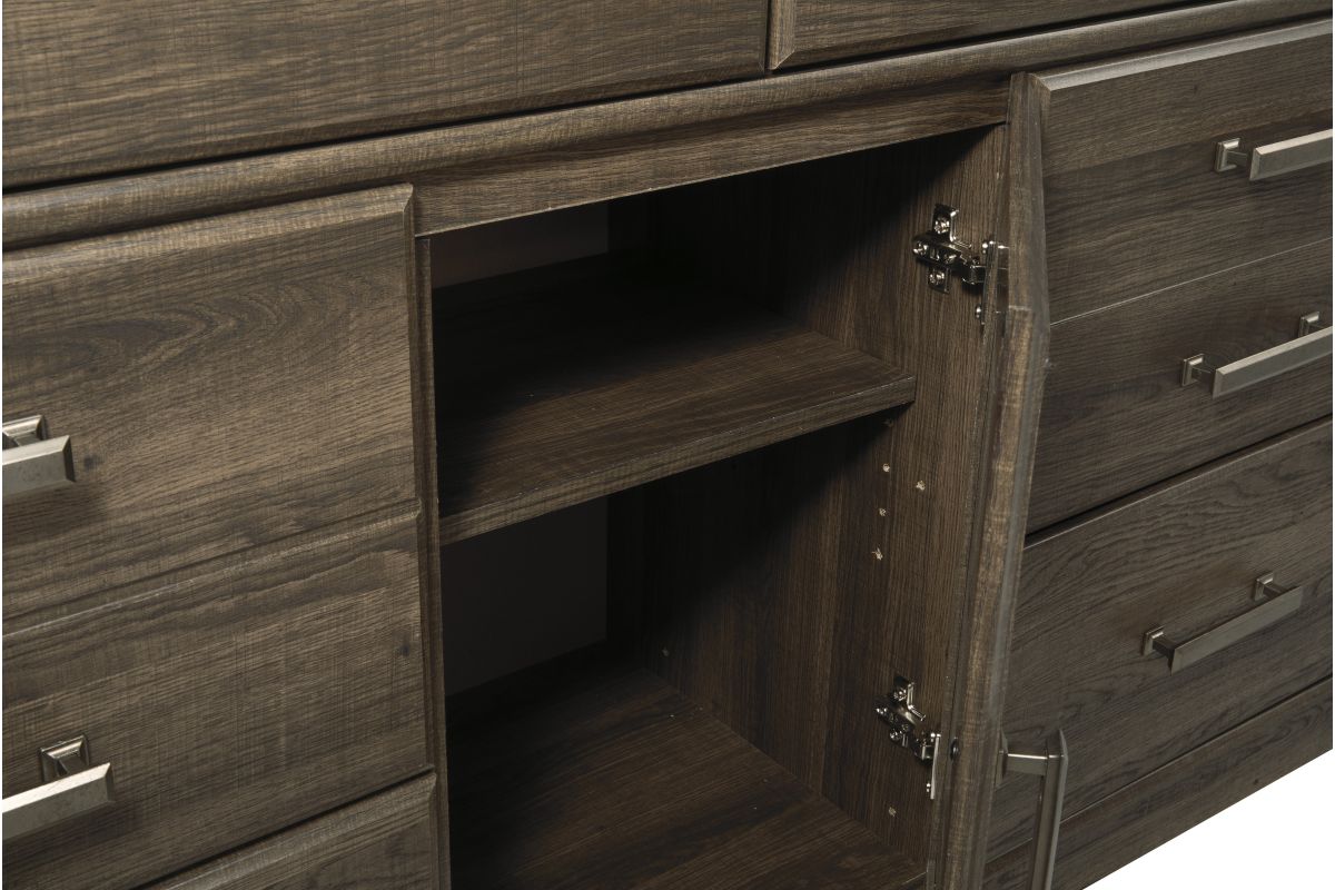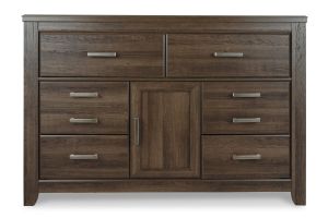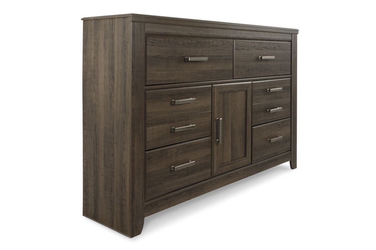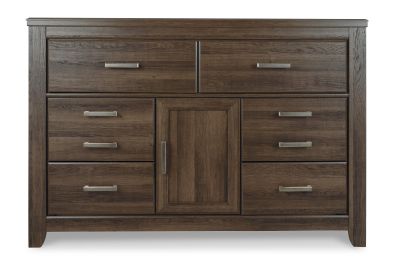 Get the look of posh barn wood without setting foot in a salvage yard. Replicated rough-sawn oak of this dresser has a vintage finish that is reminiscent of a timeworn family heirloom. Warm, rustic and naturally beautiful, it's just got that ageless appeal. Sleek, mod pulls in a pewter tone are a snappy finishing touch.