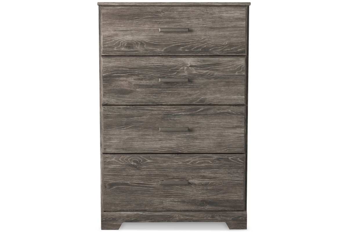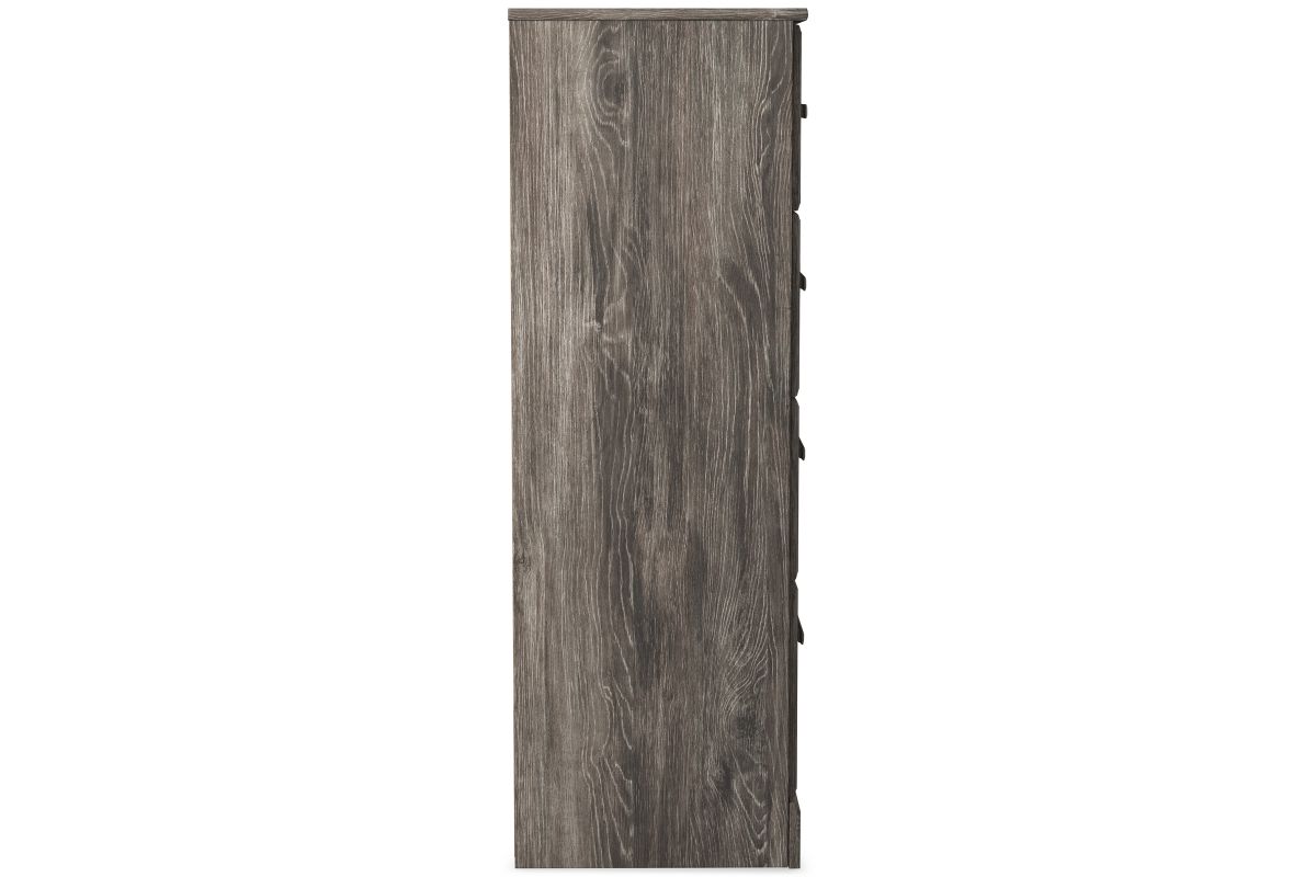 With its clean-lined look and modern attitude, this chest of drawers is a fresh style awakening. A warm gray hue over replicated oak grain easily complements other furniture finishes. Smooth drawer fronts with antiqued pewter-tone handles complete the aesthetic.