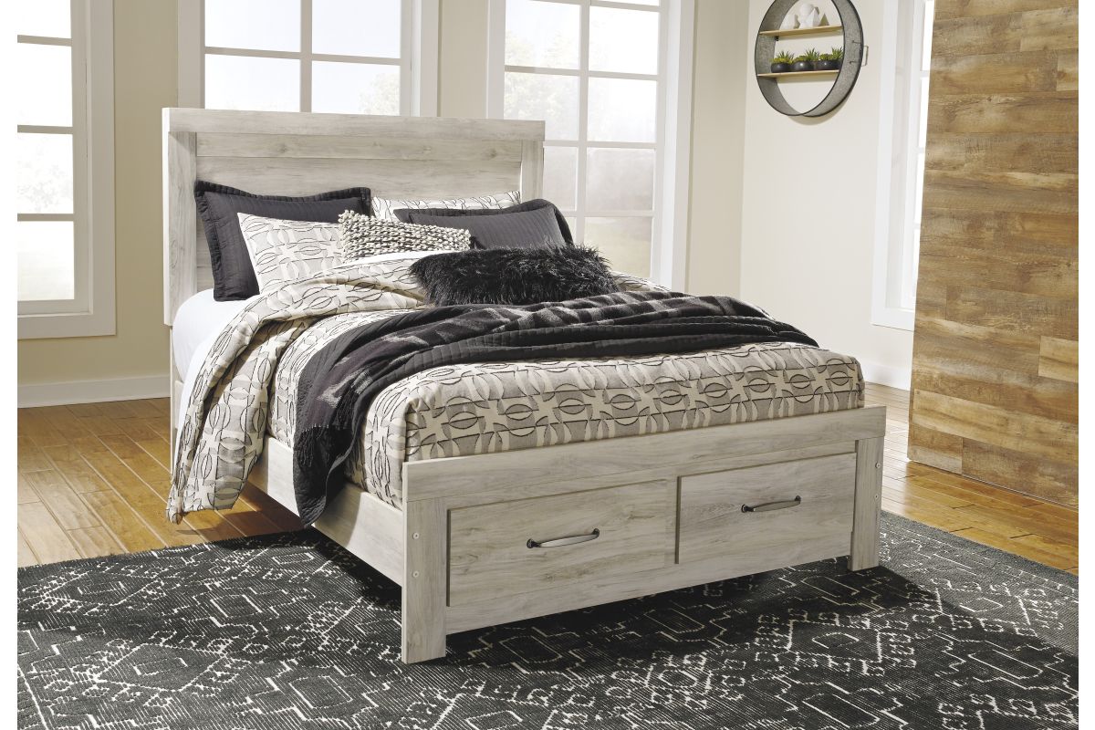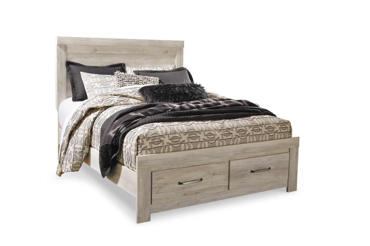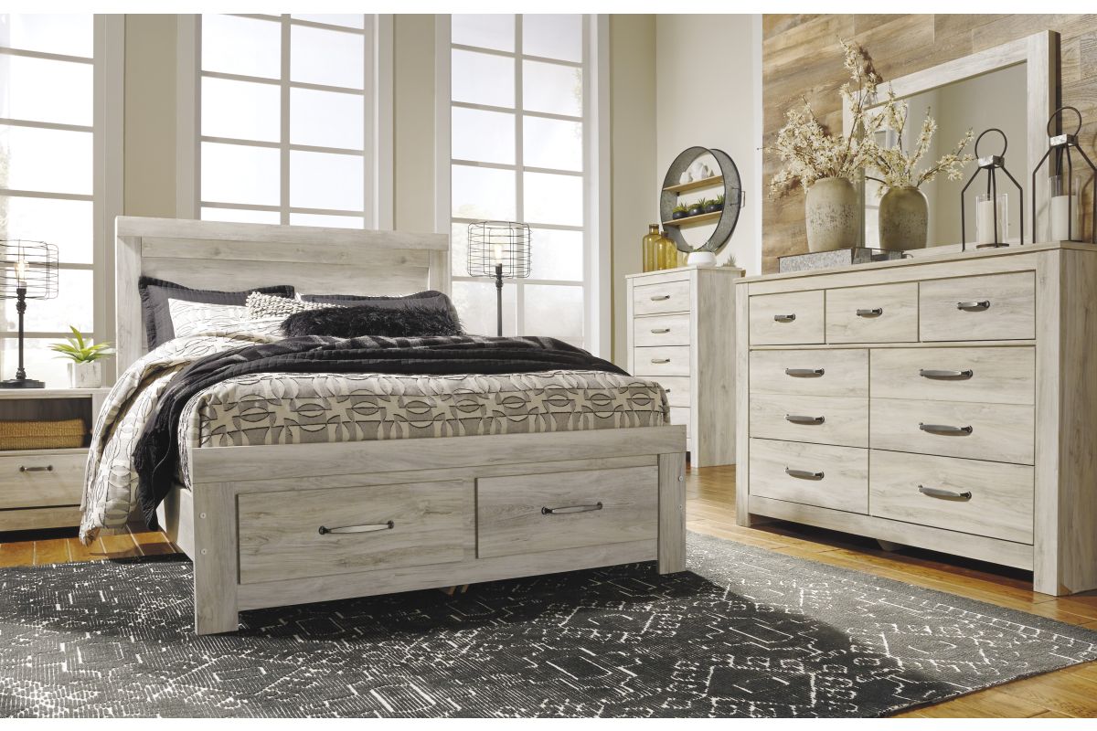 The Bellaby Bedroom Collection by Ashley Furniture offers a relaxed yet refined take on modern farmhouse style. Finished in a soft “wispy white” whitewash over a replicated oak grain, the collection captures the warmth and texture of natural wood while keeping a bright, airy look that fits both rustic and contemporary interiors. Clean lines and subtle detailing give it a versatile charm, while brushed nickel hardware with black edging adds a touch of modern contrast.