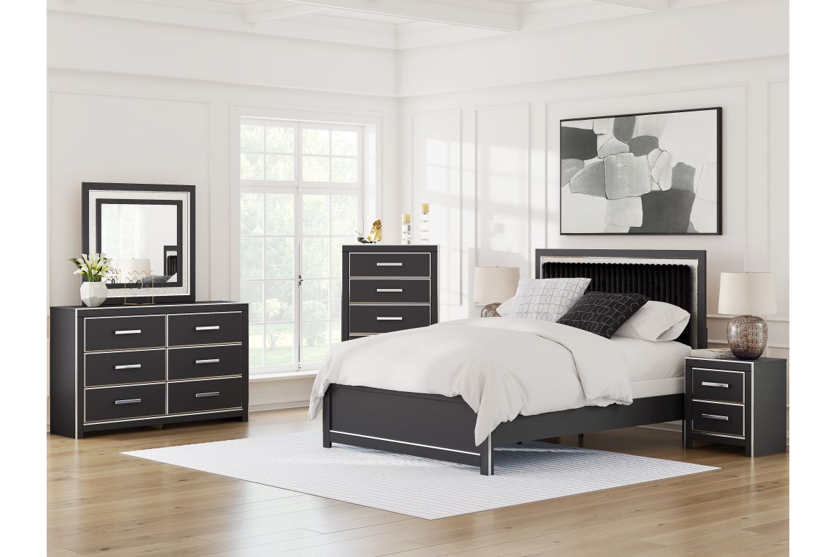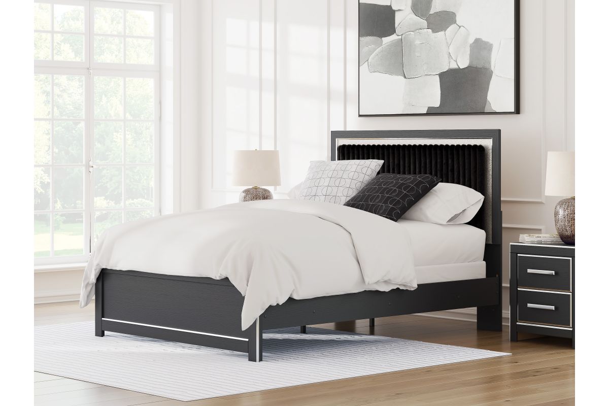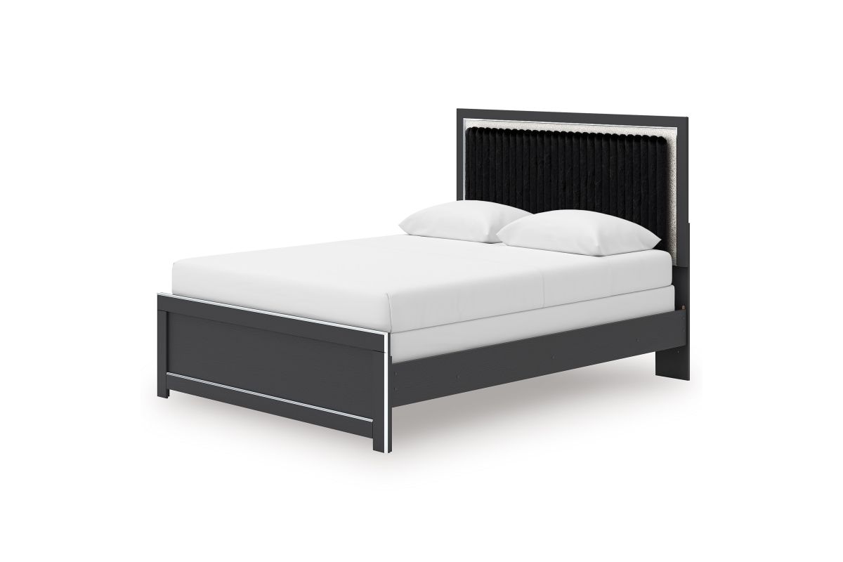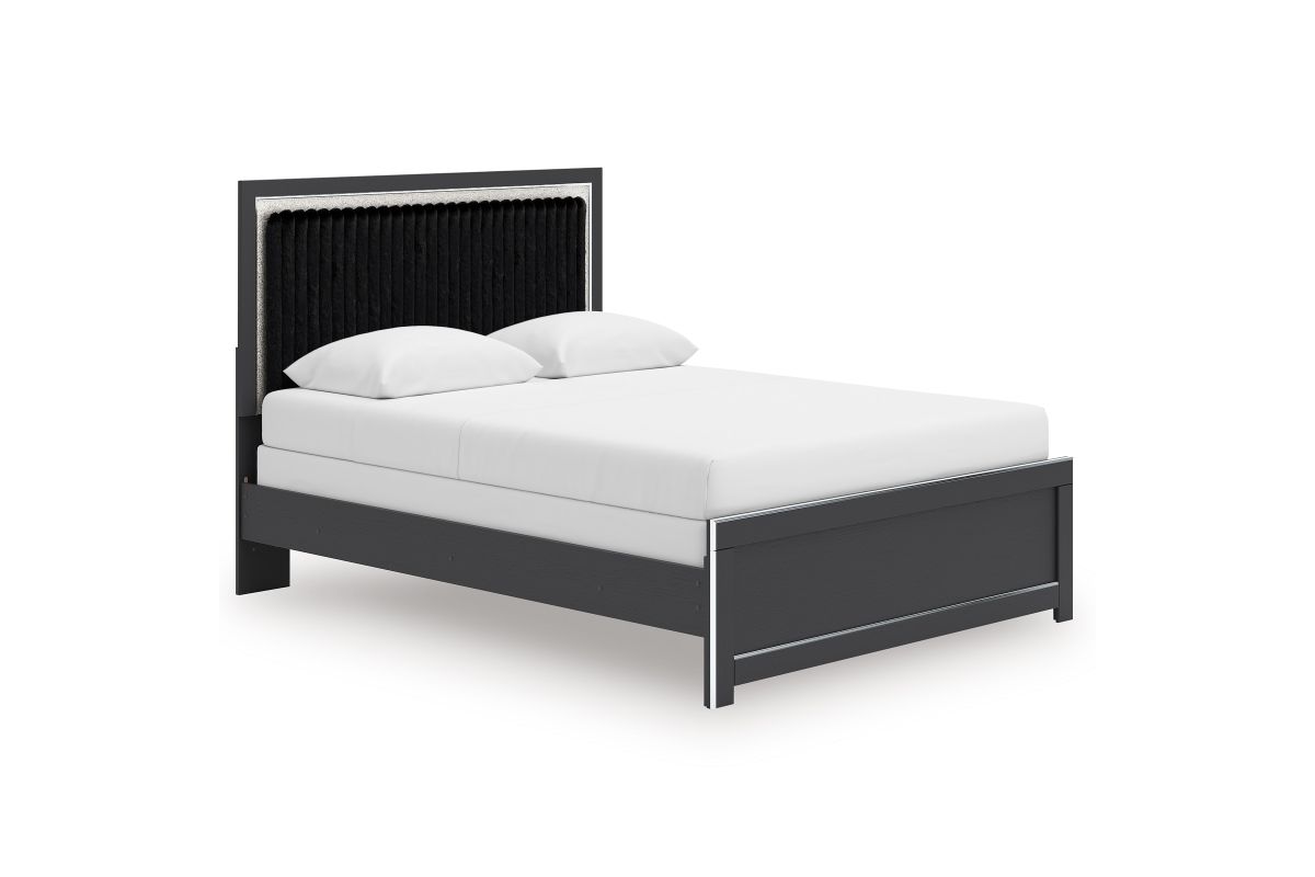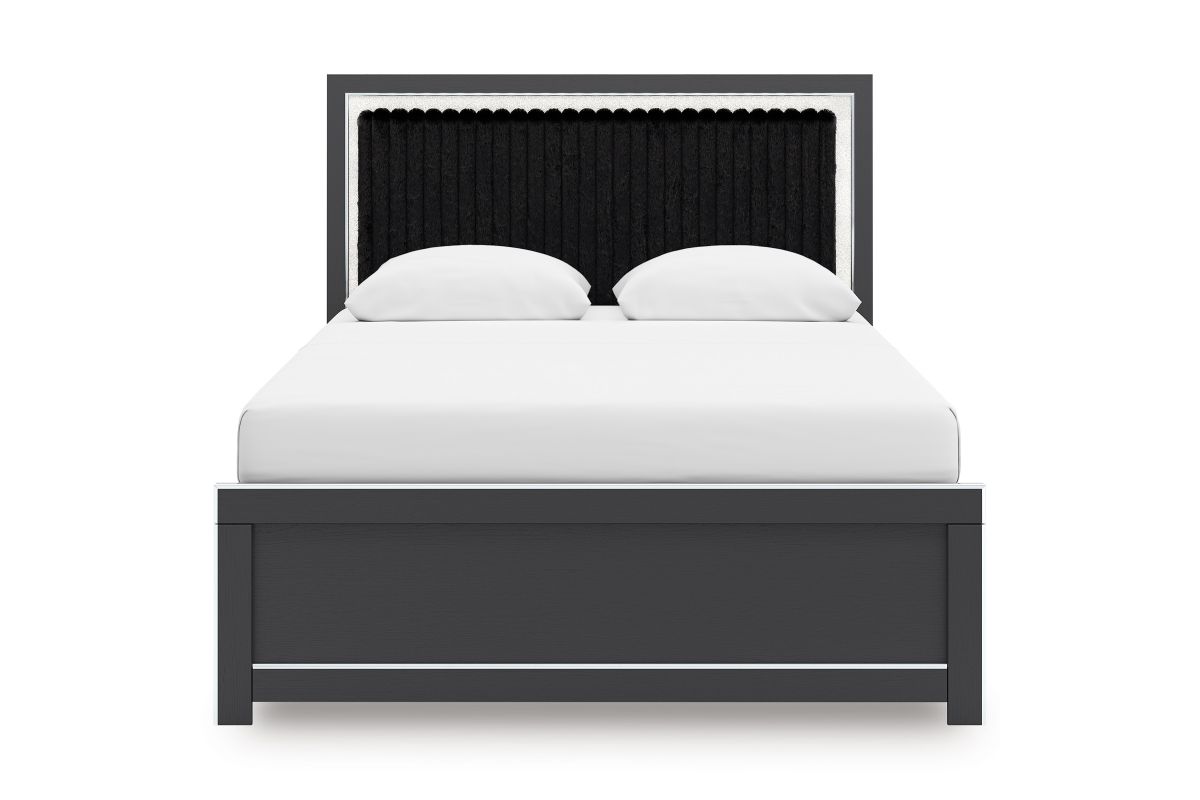 If glitz and glam are your jam, you’re gonna love this queen upholstered panel bed. Gleaming glitter and dazzling chrome-tone touches are paired with tufted black faux fur for a stunning pop of pizzazz. Loaded with chic flair and serious sparkle, it's a simply splendid way to wake up your inner sanctum’s style.
