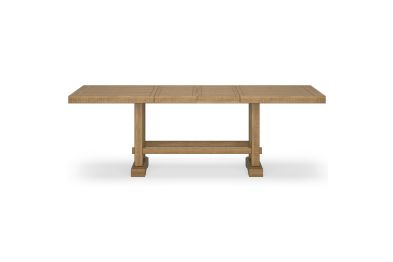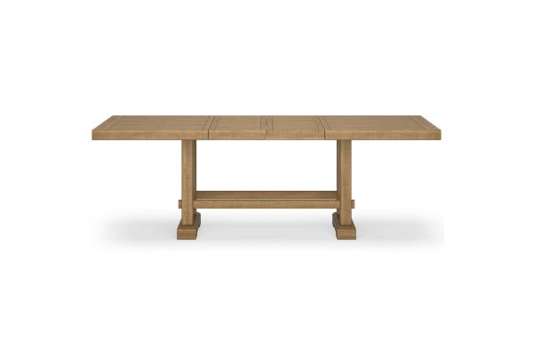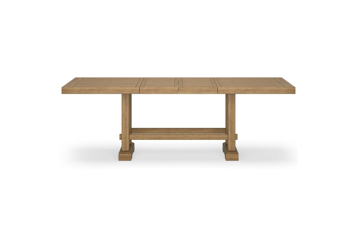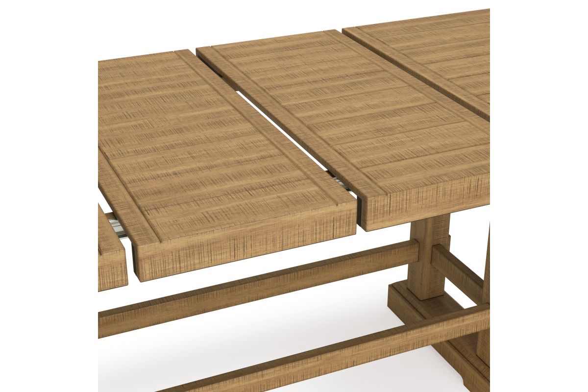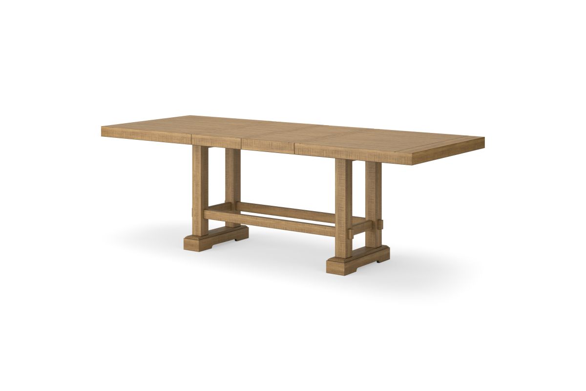 This counter height dining table is a favorite for casual rustic interiors. Offering plenty of seating space, it's your answer for everyday living and impromptu guests. And the distressed pine finish, double trestle base and two extension leaves? Deliciously charming and versatile.