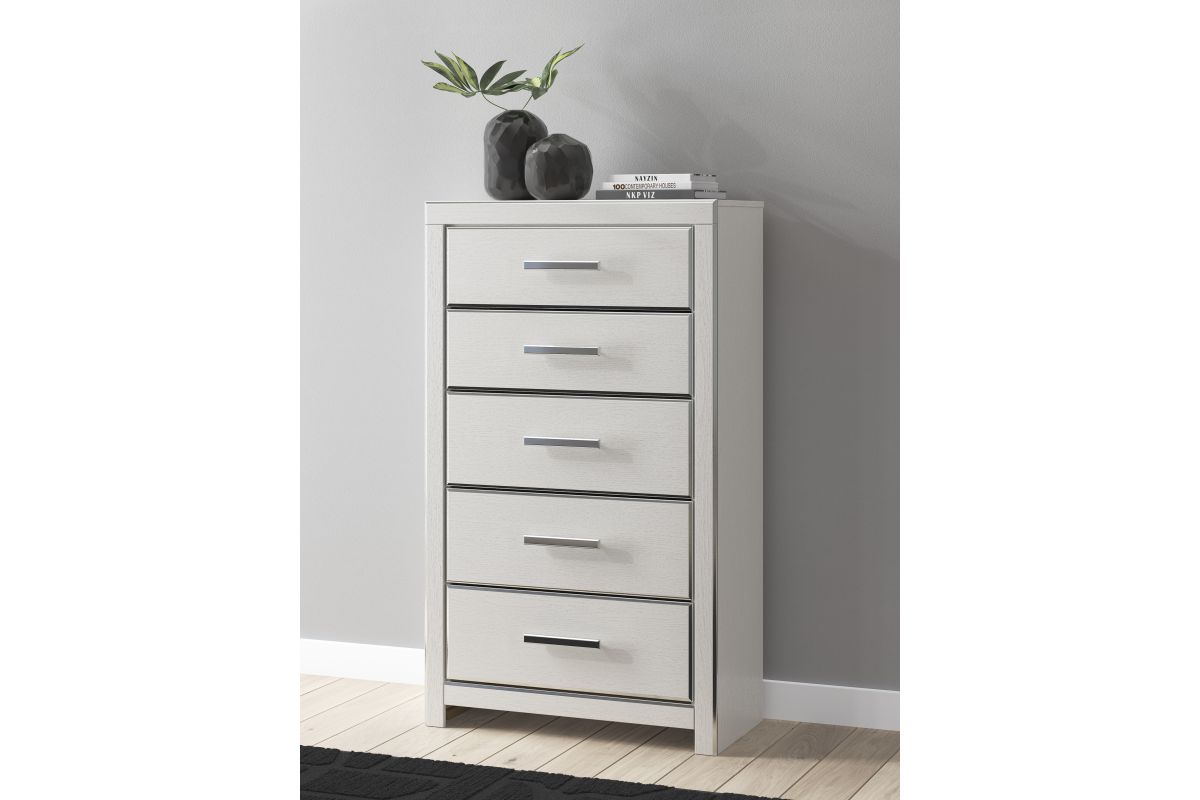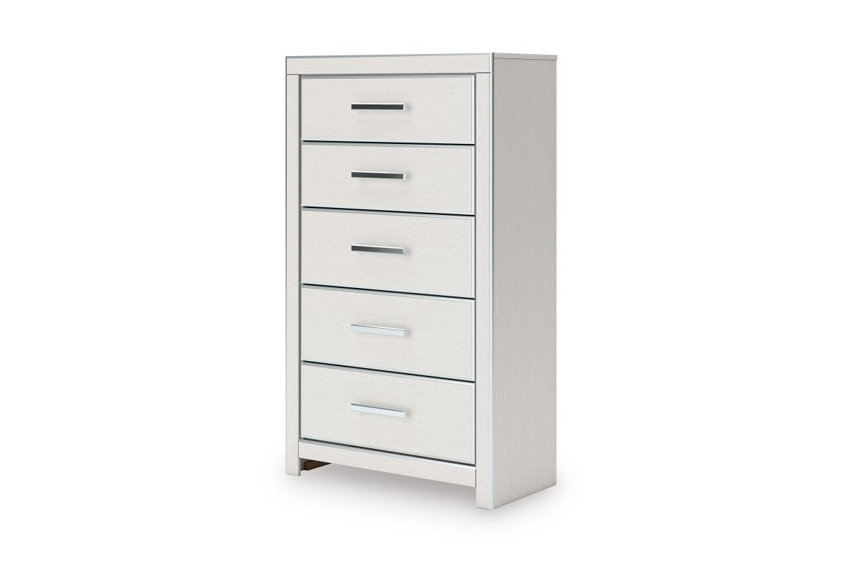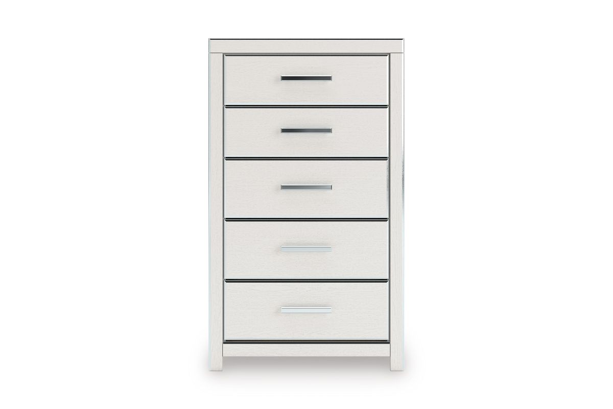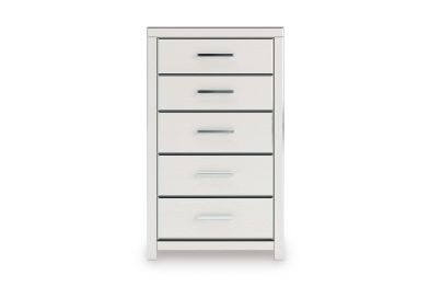 If glitz and glam are your jam, you’re gonna love this chest of drawers. Dazzling chrome-tone touches wow against a sophisticated matte white finish for a pop of stunning pizzazz. And the spacious storage drawers, with large-scale handles and faceted details, don’t disappoint. Loaded with serious sparkle, it's a simply splendid way to wake up your inner sanctum’s style.