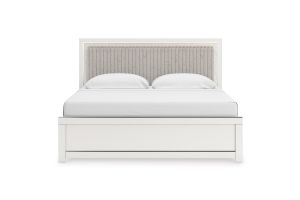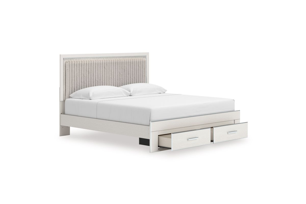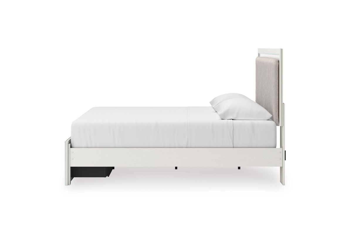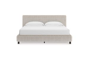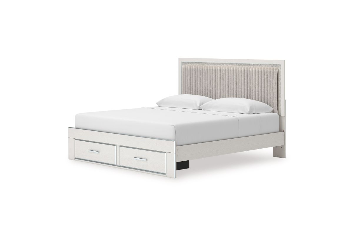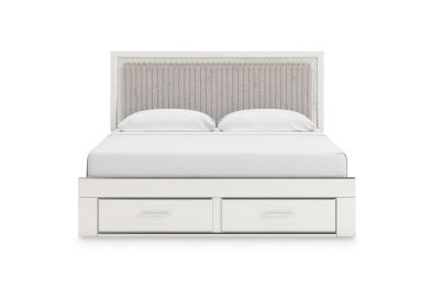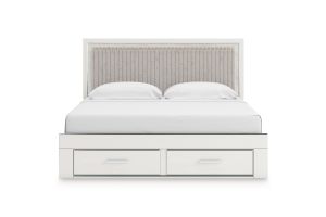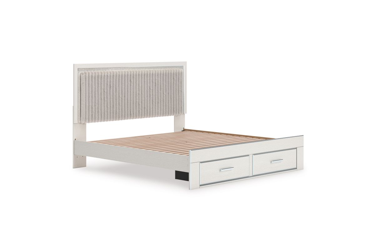 - Includes upholstered panel headboard, storage footboard, platform rails and roll slats