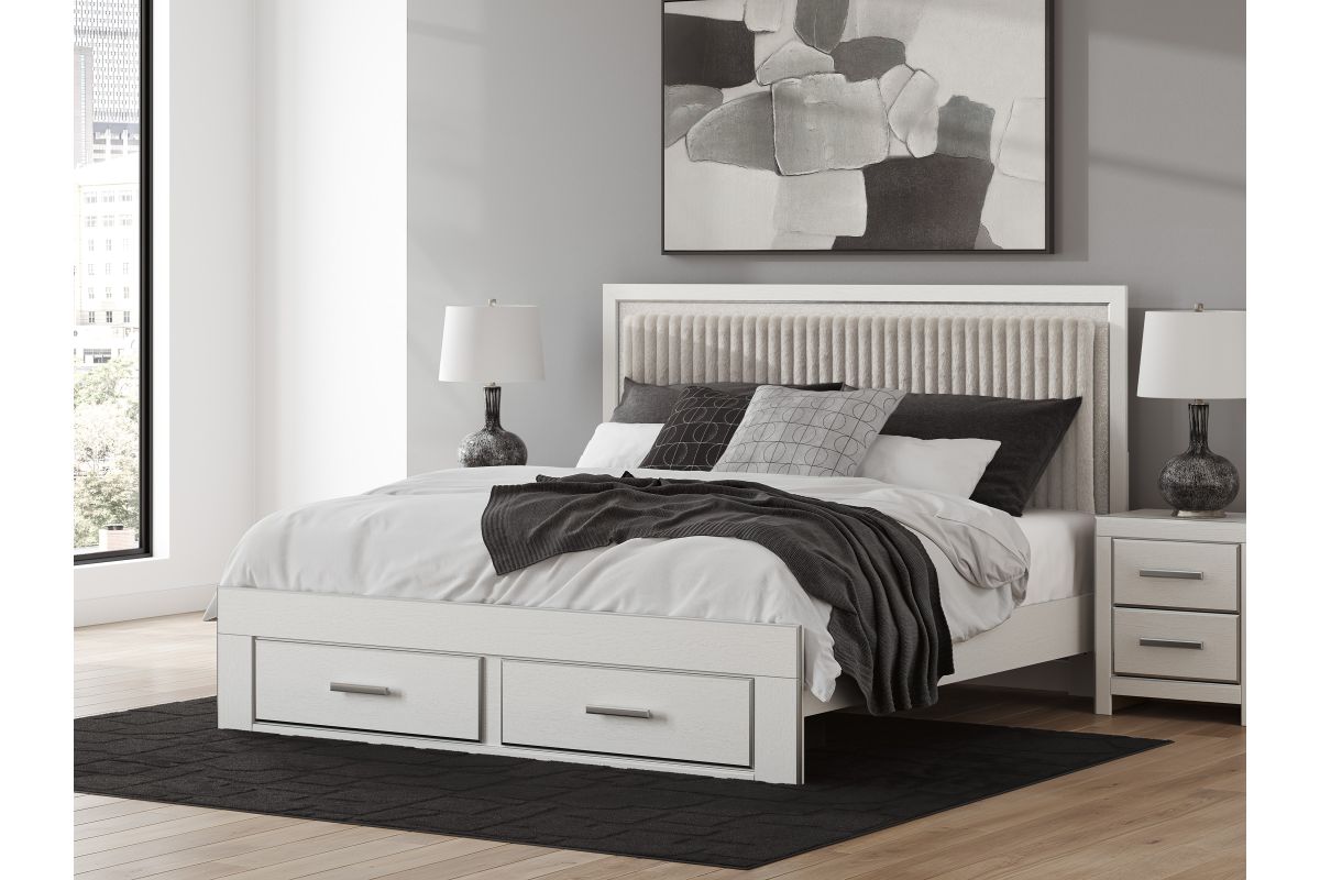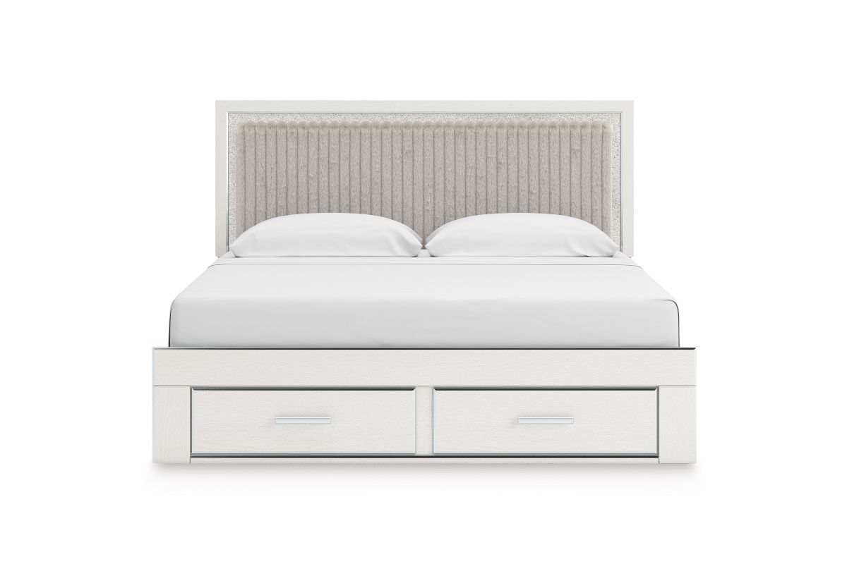 If glitz and glam are your jam, you’re gonna love this king upholstered panel storage bed. Gleaming glitter and dazzling chrome-tone touches are paired with tufted gray faux fur for a stunning pop of pizzazz. And the spacious storage drawers, with large-scale handles and faceted details, don’t disappoint. Loaded with chic flair and serious sparkle, it's a simply splendid way to wake up your inner sanctum’s style.