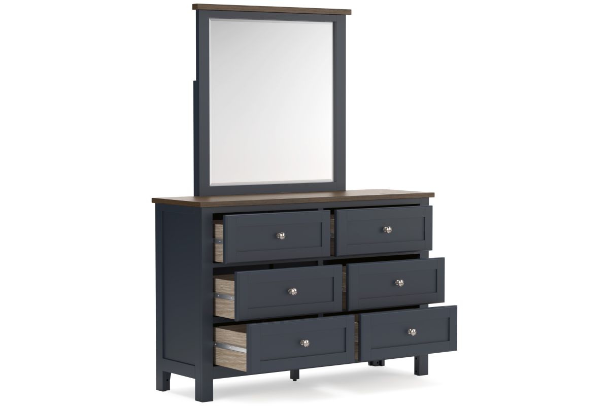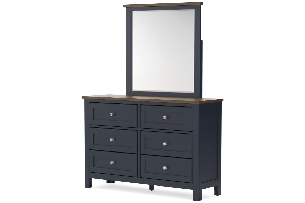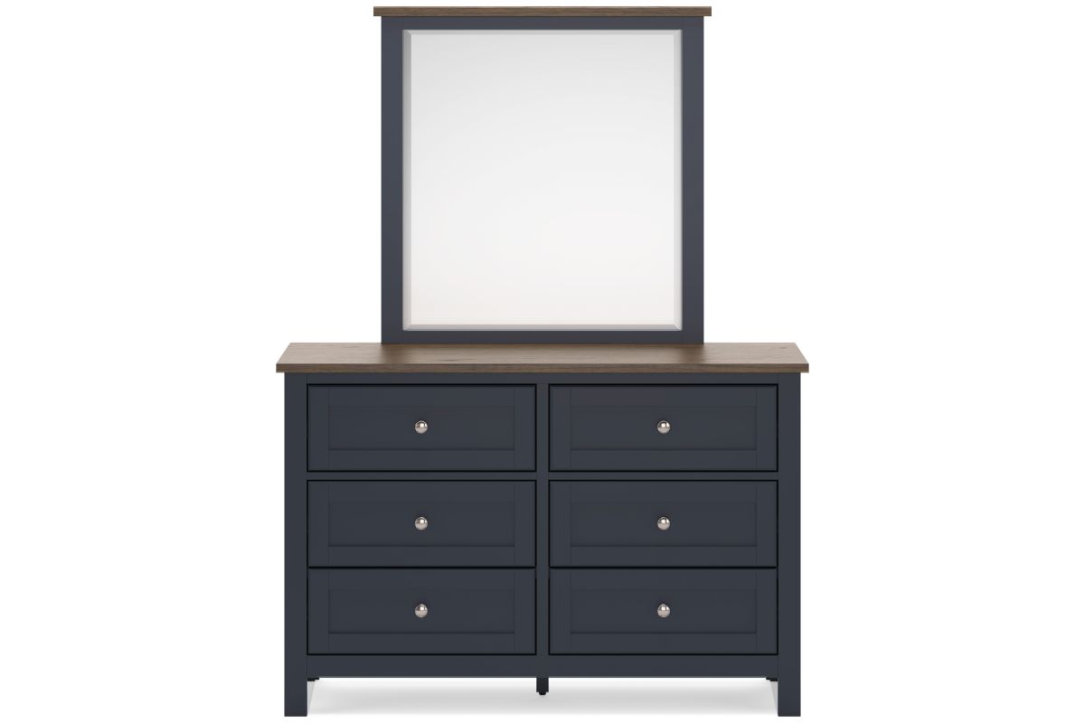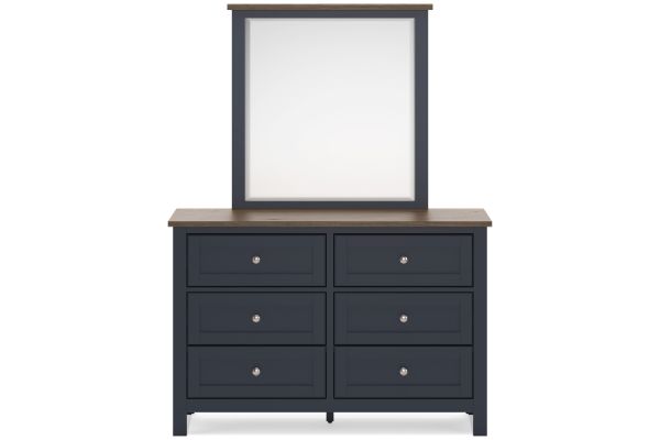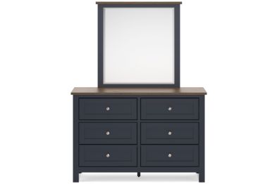 Add homespun charm to your restful retreat. A modern take on a timeless silhouette, this dresser and mirror set pairs a dark slate blue finish with a light brown top. Drawer fronts and legs in a classic Shaker style bring an air of beautiful simplicity to the bedroom. Whether it's part of a charmingly curated guest suite or a casually carefree kids room, this set is a welcome addition.