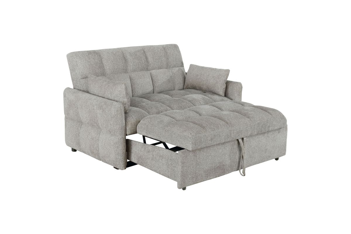 - Light grey sleeper sofa bed upholstered in soft chenille fabric with tufted design