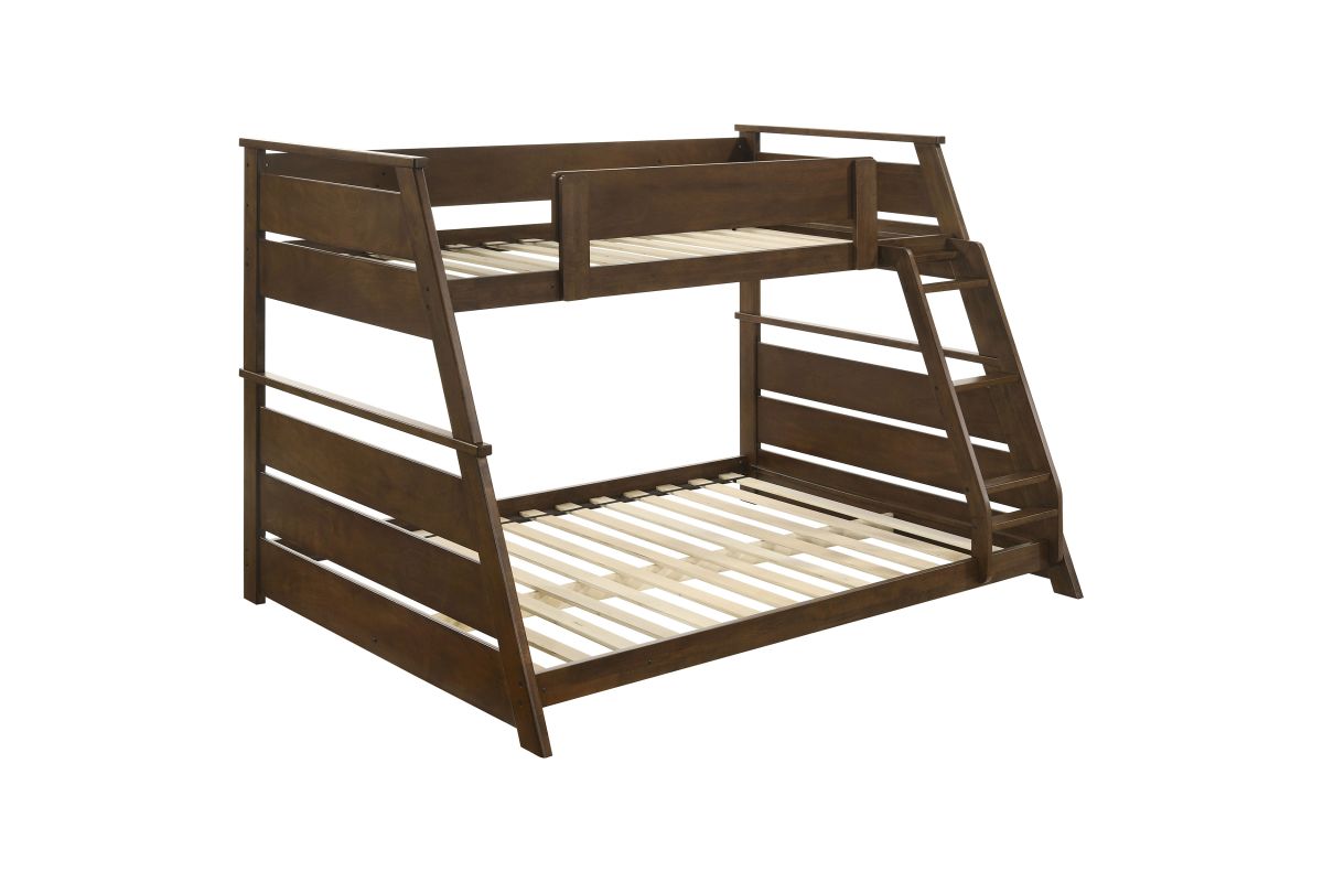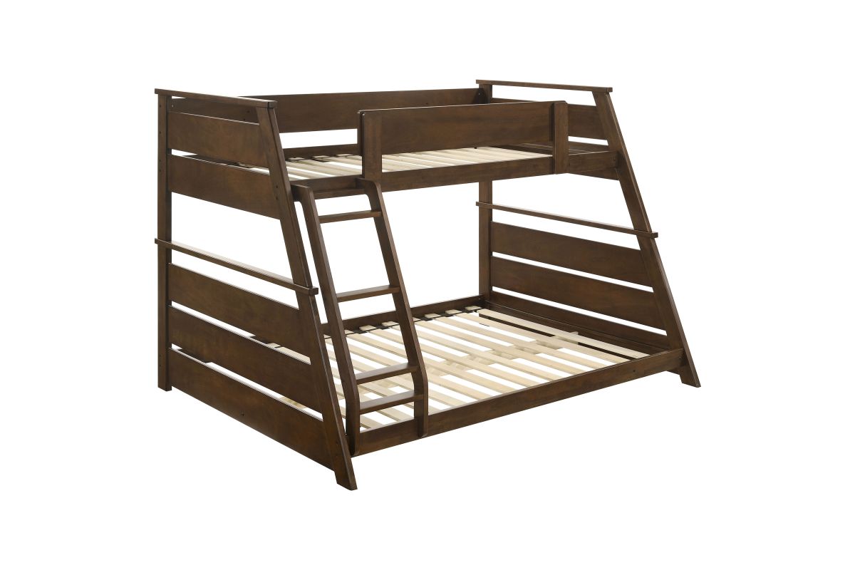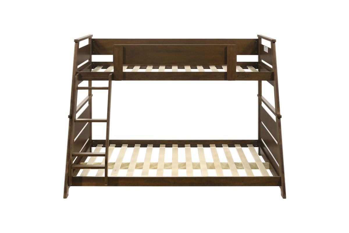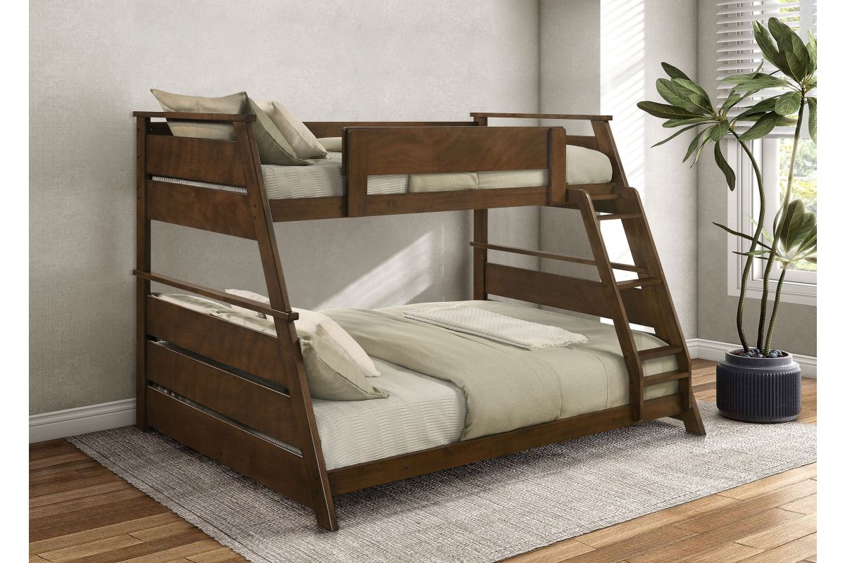 - Twin-over-full bunk bed with a warm walnut finish for a cozy, stylish appeal