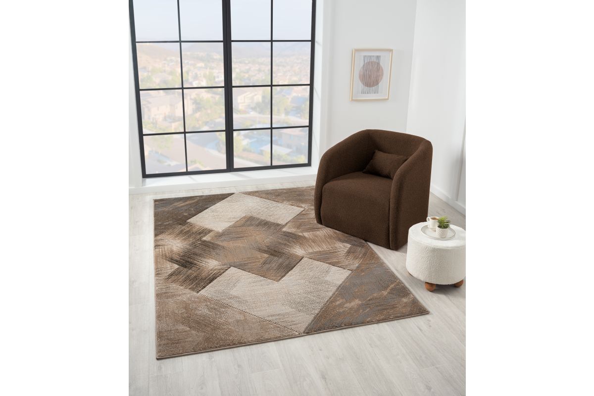Transform your space with the striking modern designs of the Alexia Collection. Each rug features bold geometric patterns, layered textures, and a rich palette of Brown, Grey, Light Brown, Blue, and Black. This rug is perfect for contemporary, transitional, or minimalist interiors.
