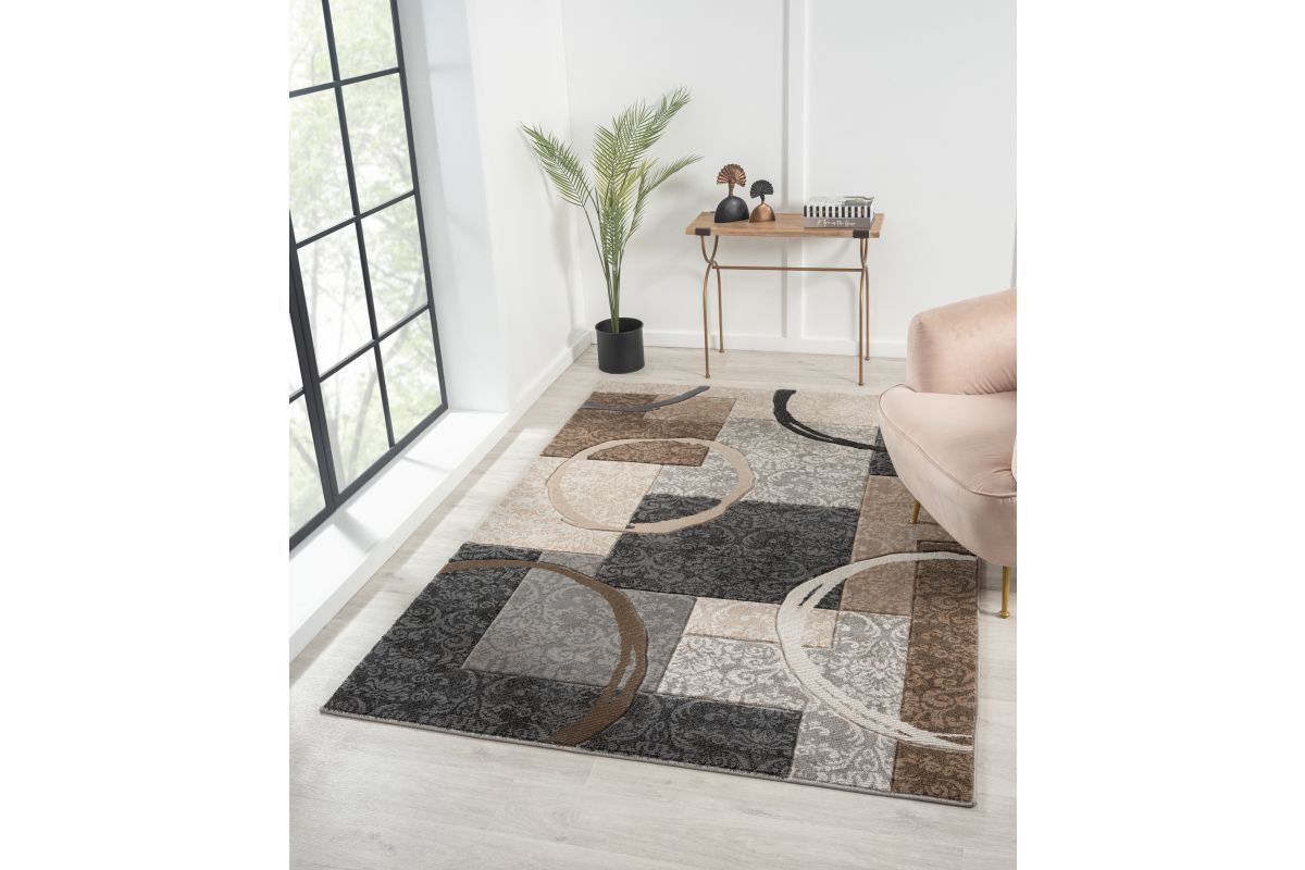 Transform your space with the striking modern designs of the Alexia Collection. Each rug features bold geometric patterns, layered textures, and a rich palette of Brown, Grey, Light Brown, Blue, and Black. This rug is perfect for contemporary, transitional, or minimalist interiors.