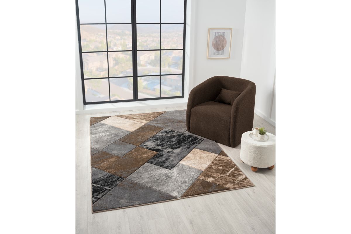Transform your space with the striking modern designs of the Alexia Collection. Each rug features bold geometric patterns, layered textures, and a rich palette of Brown, Grey, Light Brown, Blue, and Black. This rug is perfect for contemporary, transitional, or minimalist interiors.