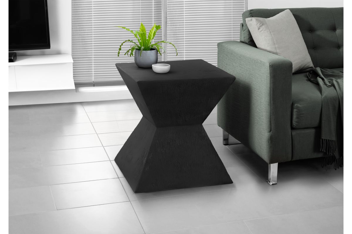 Introducing the ultimate accent table that embodies both style and practicality! Standing at a fashionable 25"h, this black indoor or outdoor table is the perfect addition to your living room, bedroom, or patio. The geometric shape, with a wood-grain texture on the base, is designed with a contemporary flair and durably crafted with weather-resistant magnesium oxide to withstand harsh outdoor elements. The space saving design means you can seamlessly incorporate it into any corner of your home or outdoor space without sacrificing style or functionality. Whether you need a chic end table for your sofa, a stylish side table beside your favorite chair on your patio, or a versatile nightstand for your bedroom, this table adapts effortlessly to any setting. The smooth, easy to clean top gives you a practical place to set down your drink, the latest novel, or display a decorative object. No assembly is needed so you can instantly style up your space and with a 5 year limited warranty against manufacturer defects, you can rest assured this robust table is made to last. Revamp your indoor/outdoor decor with this modern statement piece that combines fashionable style with durability.