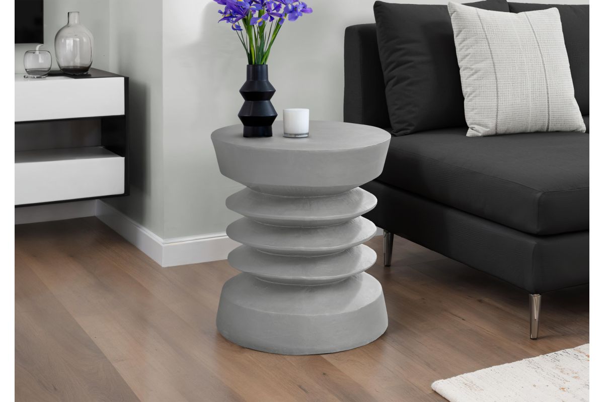 - Made for both aesthetic appeal and practical use, this grey accent table is durably designed with weather-resistant magnesium oxide construction that withstands daily use in all settings.