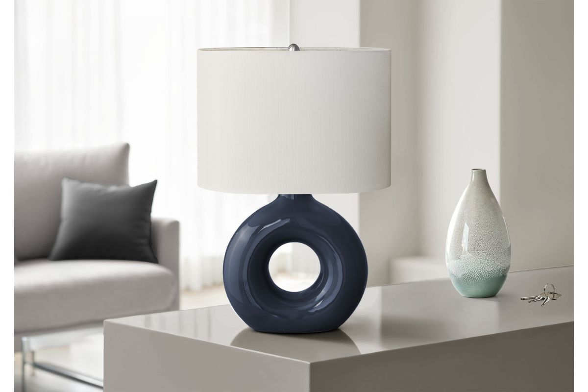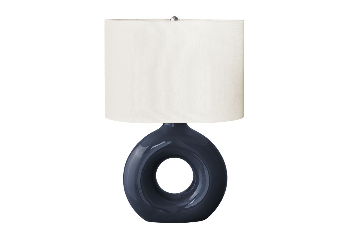 Add some modern ambiance to your home with this stylish and trendy 24"h table lamp in blue ceramic with a chic ivory shade. This decorative table lamp will brighten up any room with its contemporary, donut-shaped ceramic base and oval linen-blend fabric shade. A perfect size to place on an end or side table, or as a bedside lamp on your nightstand, this lamp will illuminate your space with a soft and inviting glow. Easy to use with an on/off rotary switch that houses a 100W light bulb (not included), this lighting fixture will easily be a standout. With only minimal assembly needed and backed with a 2 year limited warranty against manufacturer defects, you can trust in the quality and durability of this unique accent piece.