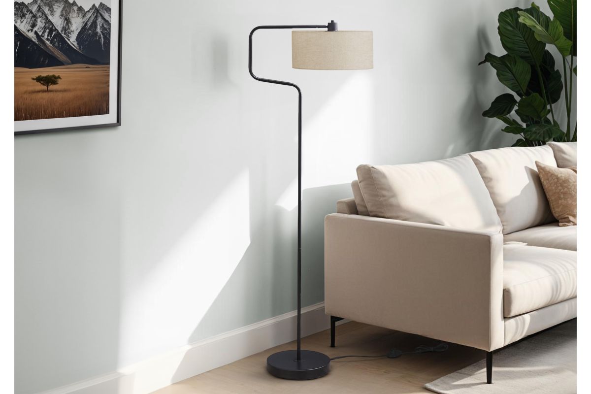 Brighten up your home with our stunning 61"h floor lamp, a perfect blend of contemporary design and practical functionality. Crafted with sleek black metal circular base attached to a modern C-shaped arm and adorned and a stylish beige drum shade, this fashionable and trendy accent lighting piece effortlessly elevates any space, from cozy living rooms and offices to chic bedrooms. The adjustable tilt shade allows you to direct light exactly where you need it, creating a tailored ambiance for reading, working, or entertaining. Designed with an on/off foot switch for easy access, this decorative lamp is perfect for those who appreciate both style and convenience. The linen-blend fabric shade softly diffuses the 100W bulb needed (not included) to operate this floor lamp, with only minimal assembly required. Backed by a 2 year limited warranty against manufacturer defects, this updated retro inspired floor lamp is ready to illuminate your home decor.