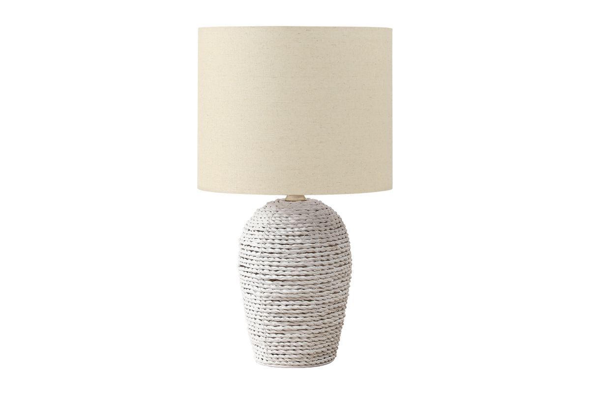 Upscale your casual, transitional decor with our stylish and fashionable 17"h table lamp, featuring a chic white rattan base and a soft beige fabric shade. This decorative lighting accent piece is perfect to place on an end or side table, nightstand, or console adding sophisticated rustic ambiance to your living room, bedroom, or home office. Designed with a textured finish base in a natural, woven, rope-style rattan material, this lamp not only serves a functional purpose but also infuses a trendy aesthetic into your space. The on/off turn knob switch allows for easy operation with the use of a 60W standard bulb (not included), to brighten your surroundings effortlessly. For added peace of mind, we include a 2 year limited warranty against manufacturer defects, ensuring that your stylish lighting solution stands the test of time. Illuminate your home with this white rattan lamp and a modern, linen-blend beige shade to create a cozy atmosphere for your reading nook or simply to add a touch of elegance to your decor.