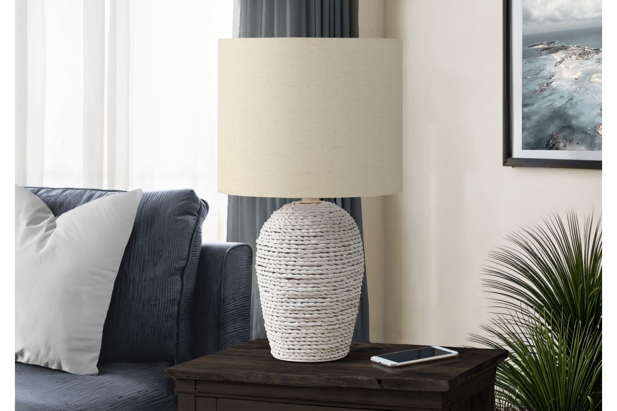 - Refresh your home with this stylish 17"h table lamp featuring a white rattan base and a chic beige fabric shade, perfect for creating a warm and inviting ambiance in your living room, bedroom, or home office.