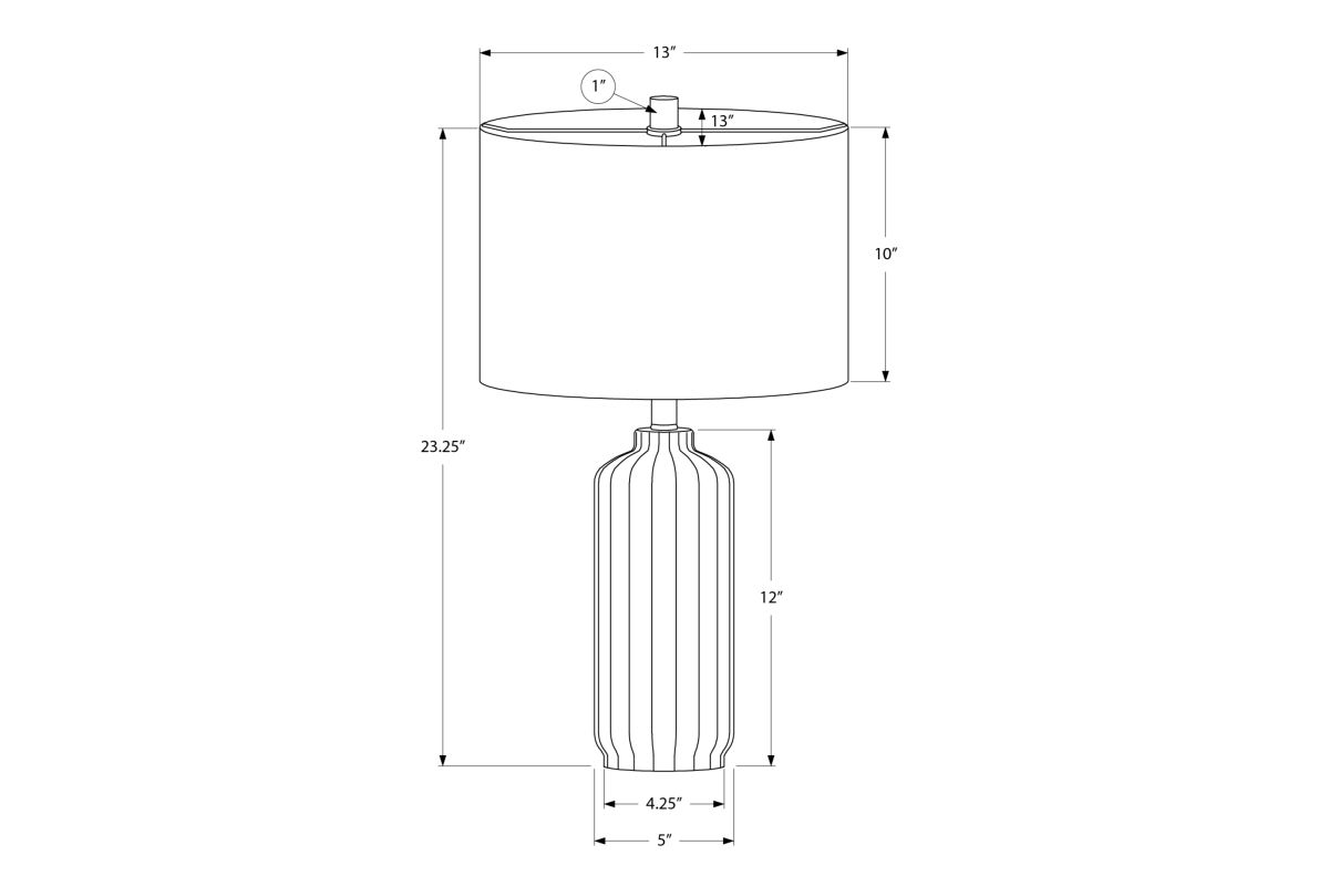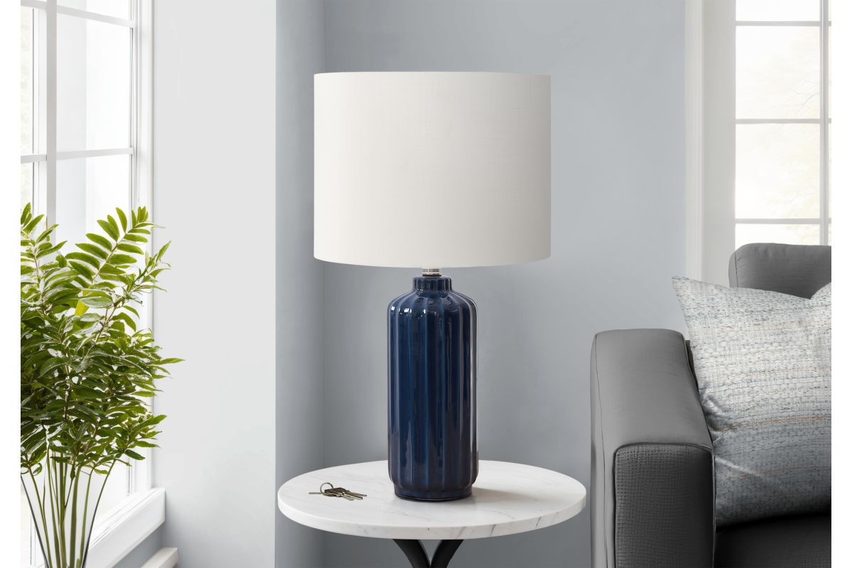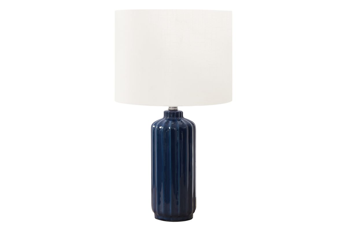 Beautify your space with this fashionable and stylish 23"h glossy blue ceramic table lamp. Composed of high-quality ceramic material in a chic ribbed design, this decorative lamp is complimented with a sophisticated ivory fabric shade that diffuses the light beautifully, generating a warm ambiance that brightens your end or side table, nightstand, or bedside table. Equipped with an easy on/off turn knob switch for effortless control, this lamp operates with a standard 100W bulb (not included) to create a welcoming atmosphere. Enjoy peace of mind with our 2 year limited warranty against manufacturer defects, ensuring a reliable and well-made lighting accent. Well suited to fit all decor styles, illuminate your living room, bedroom, or office with this versatile and on-trend table lamp with a columnar shape base, adding dimension to a room.