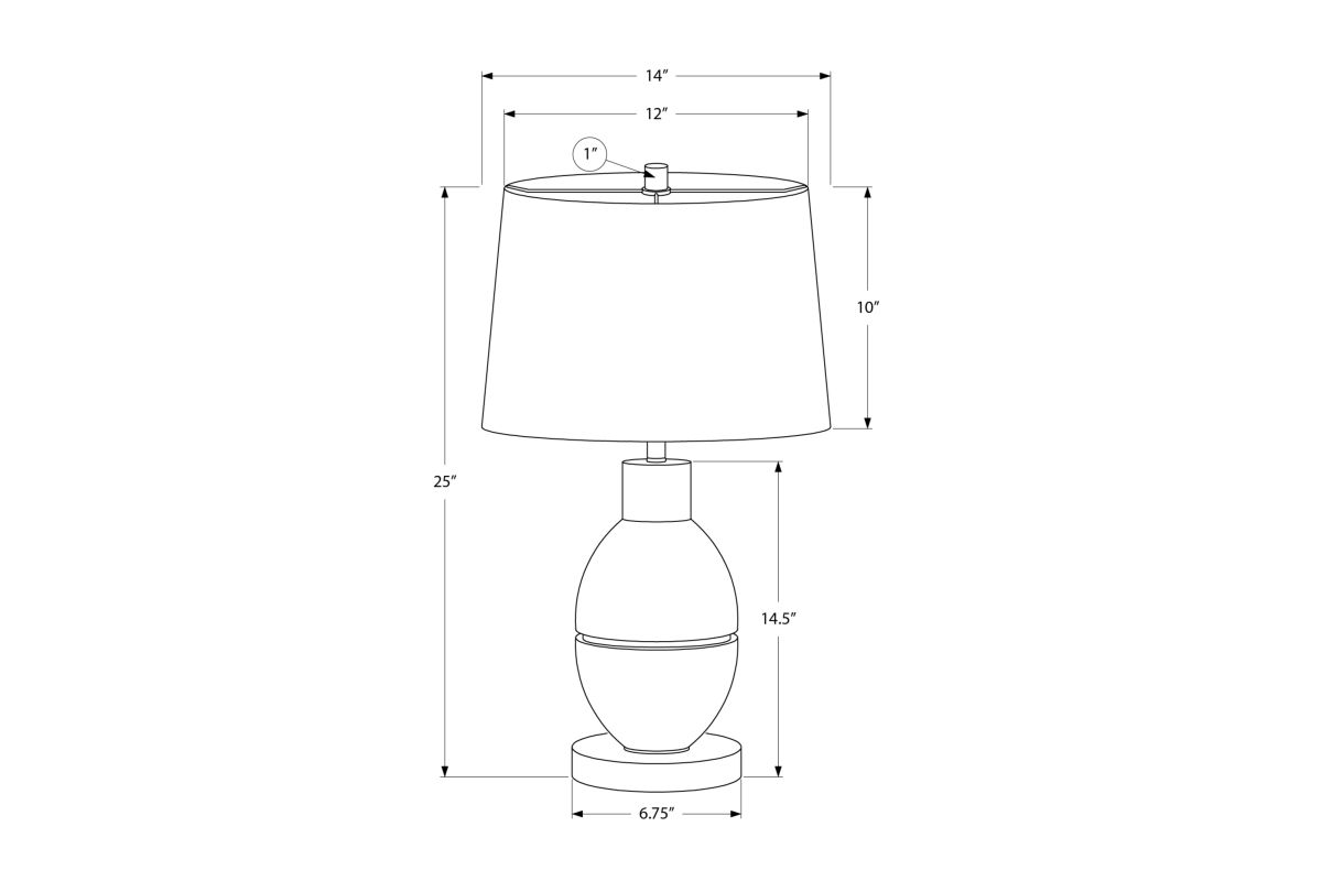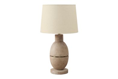 Transform your room into a stylish haven with this 25"h table lamp in a natural looking beige resin resting on a matching base and topped with a soft beige shade. This beautiful piece of lighting is designed to brighten any corner of your home, whether placed on an end or side table, a nightstand, or console table. Capturing the essence of ancient stoneware but with a contemporary design, this decorative lamp boasts a textured finish base with a natural stone look and a hint of gold metal peaking through, adding depth and personality to your decor. The fabric shade gives off a warm, inviting ambiance, making it the perfect addition to your living room, bedroom, or office space. Fitted with a convenient on/off turn knob switch that operates a 100W standard bulb (not included), this lamp combines a fashionable and trendy design with effortless functionality. For your confidence, this lamp includes a 2 year limited warranty against manufacturer defects ensuring a quality made and reliable purchase. Illuminate your home decor with this stylish piece of accent lighting.
