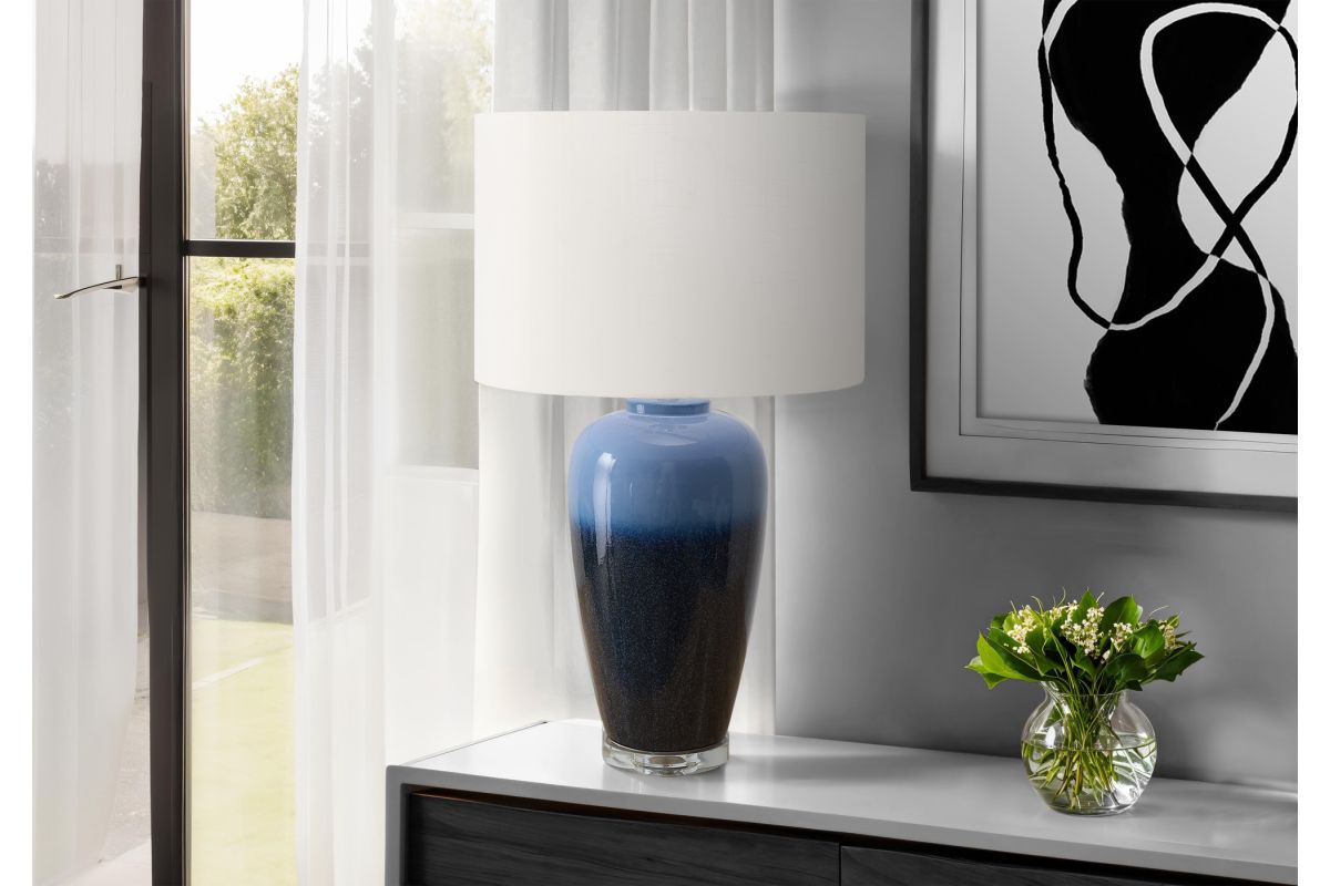 - The combination of a sleek clear acrylic base resting under a decorative ceramic body in a gradient blue finish, effortlessly brightens end or side tables, nightstands, or console tables.